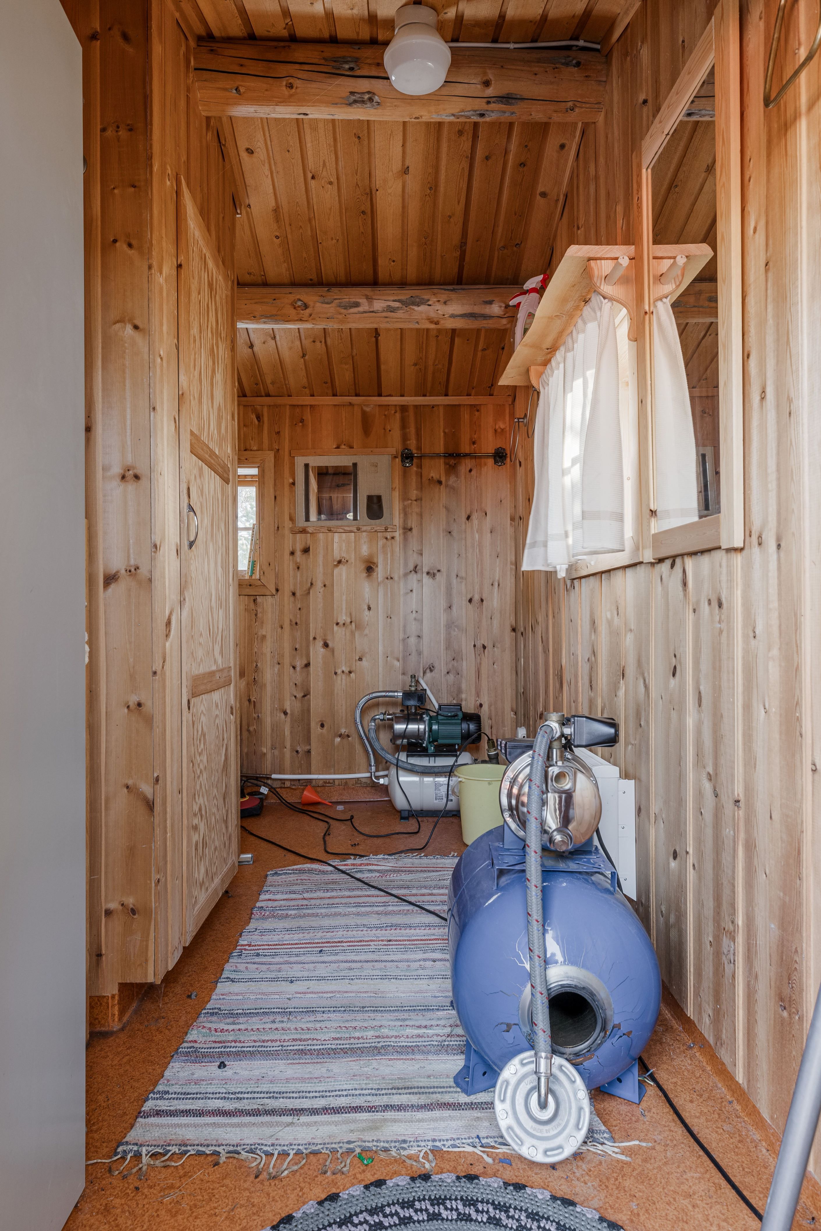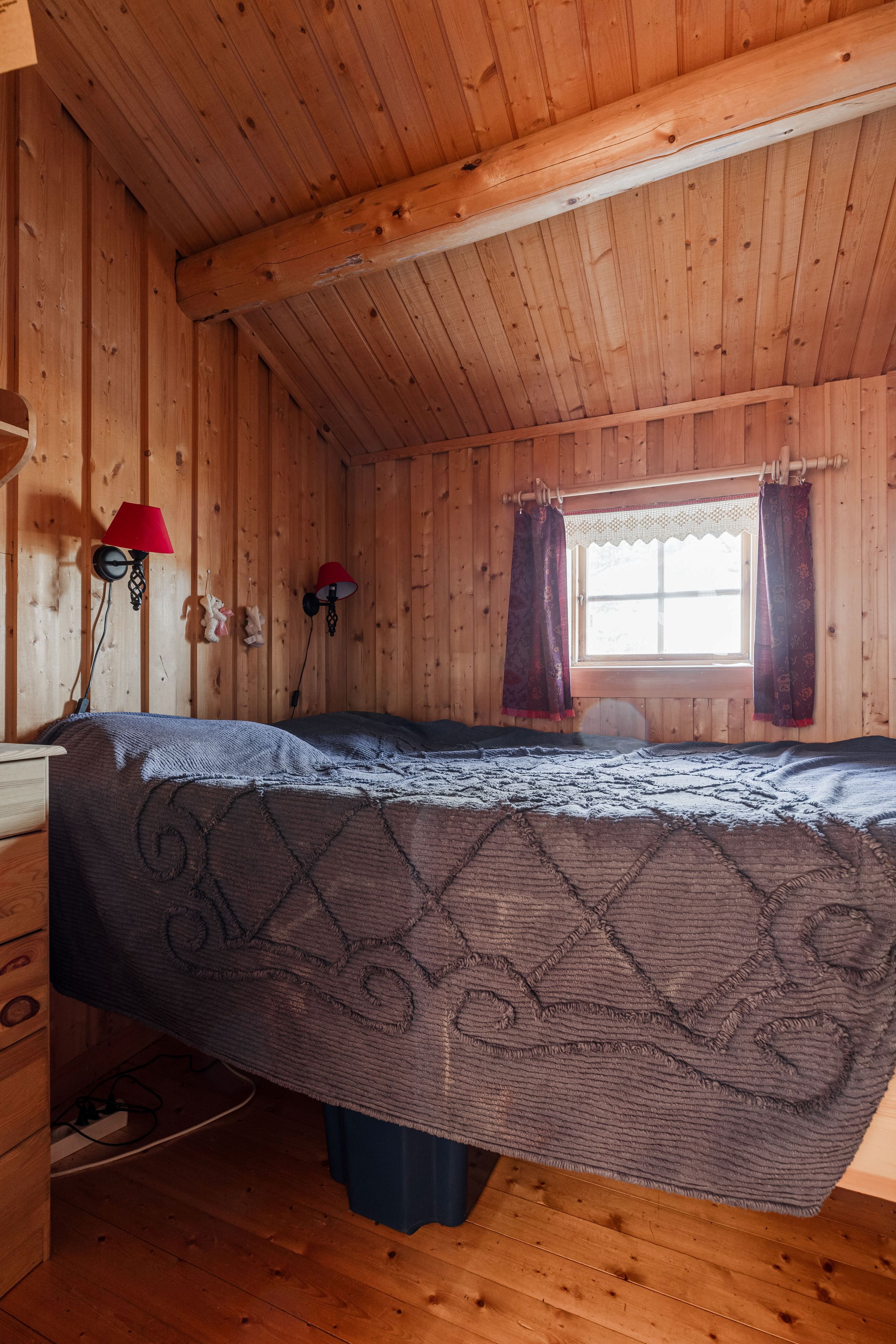 I stugan finns två sovrum med fyra bäddar samt kök och en storstuga med en stor öppen spis och plats för matbord samt liten soffa eller fåtöljer.