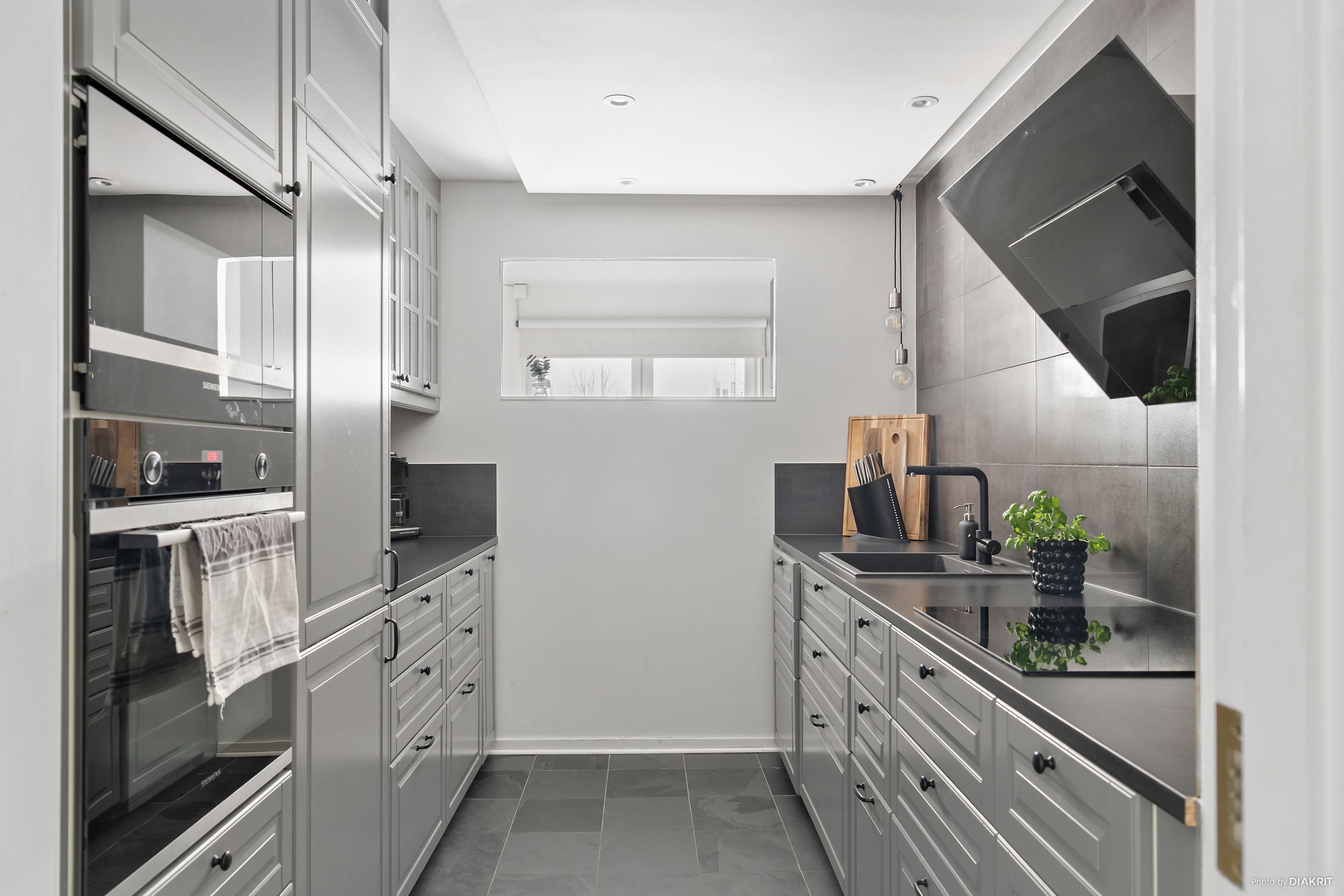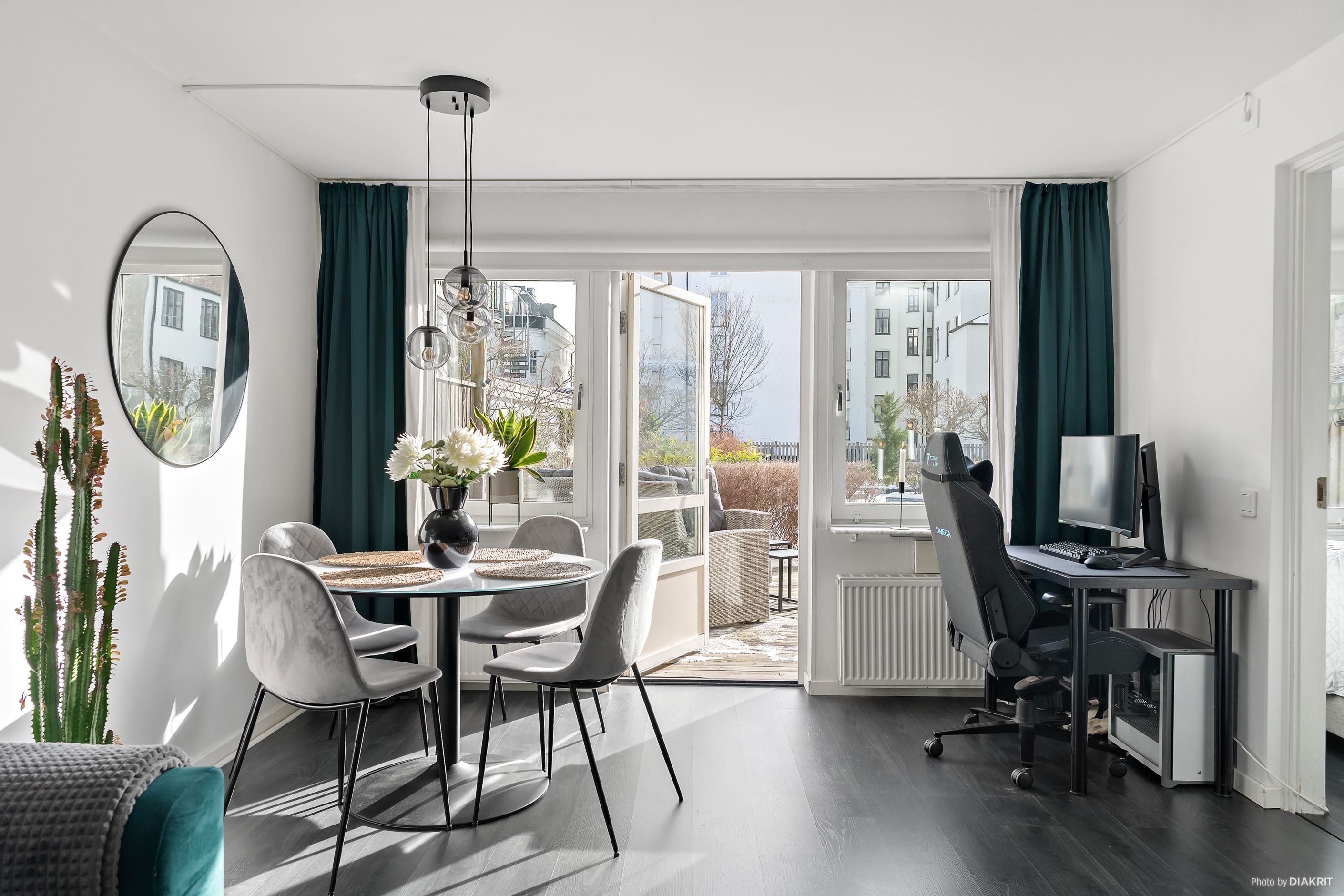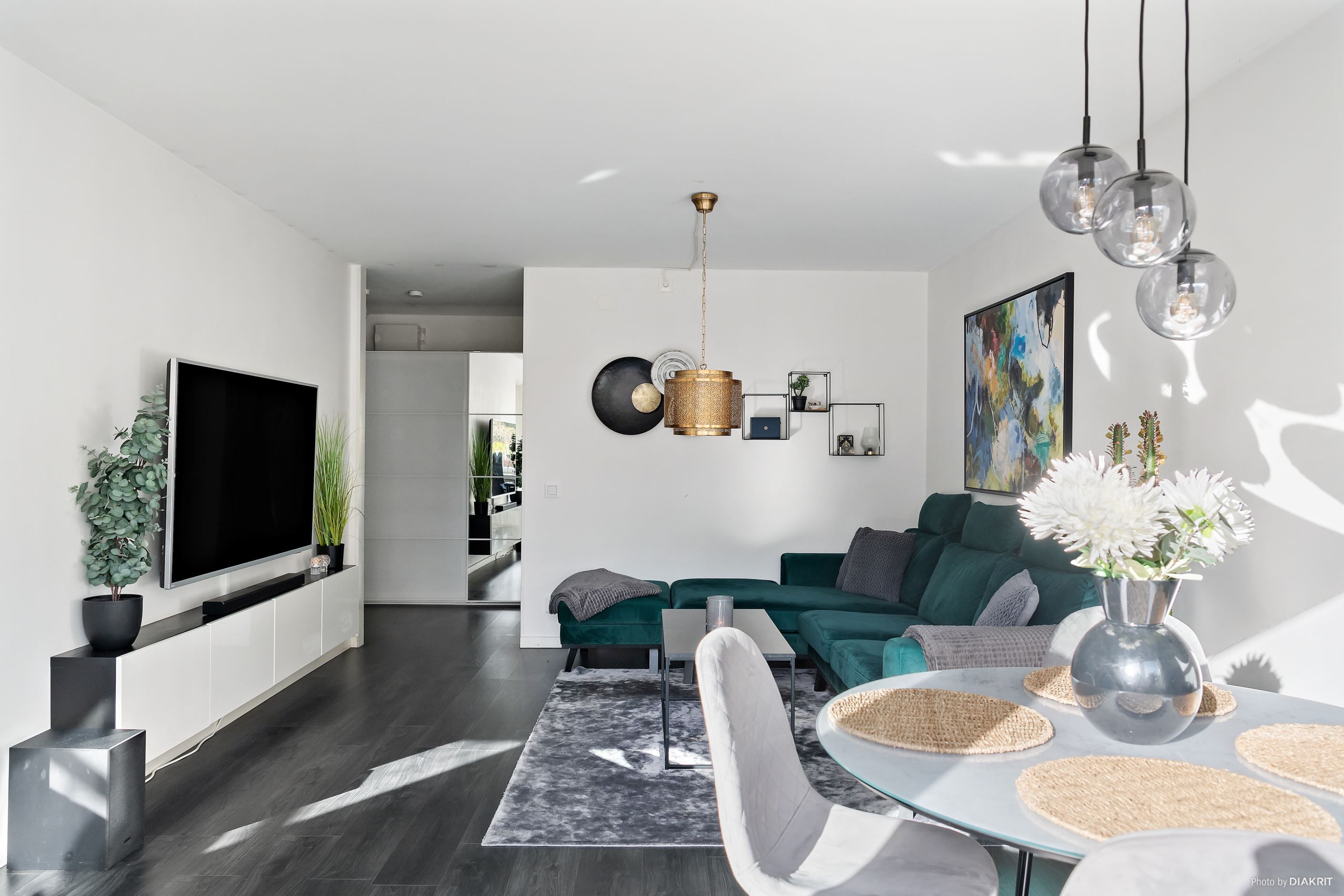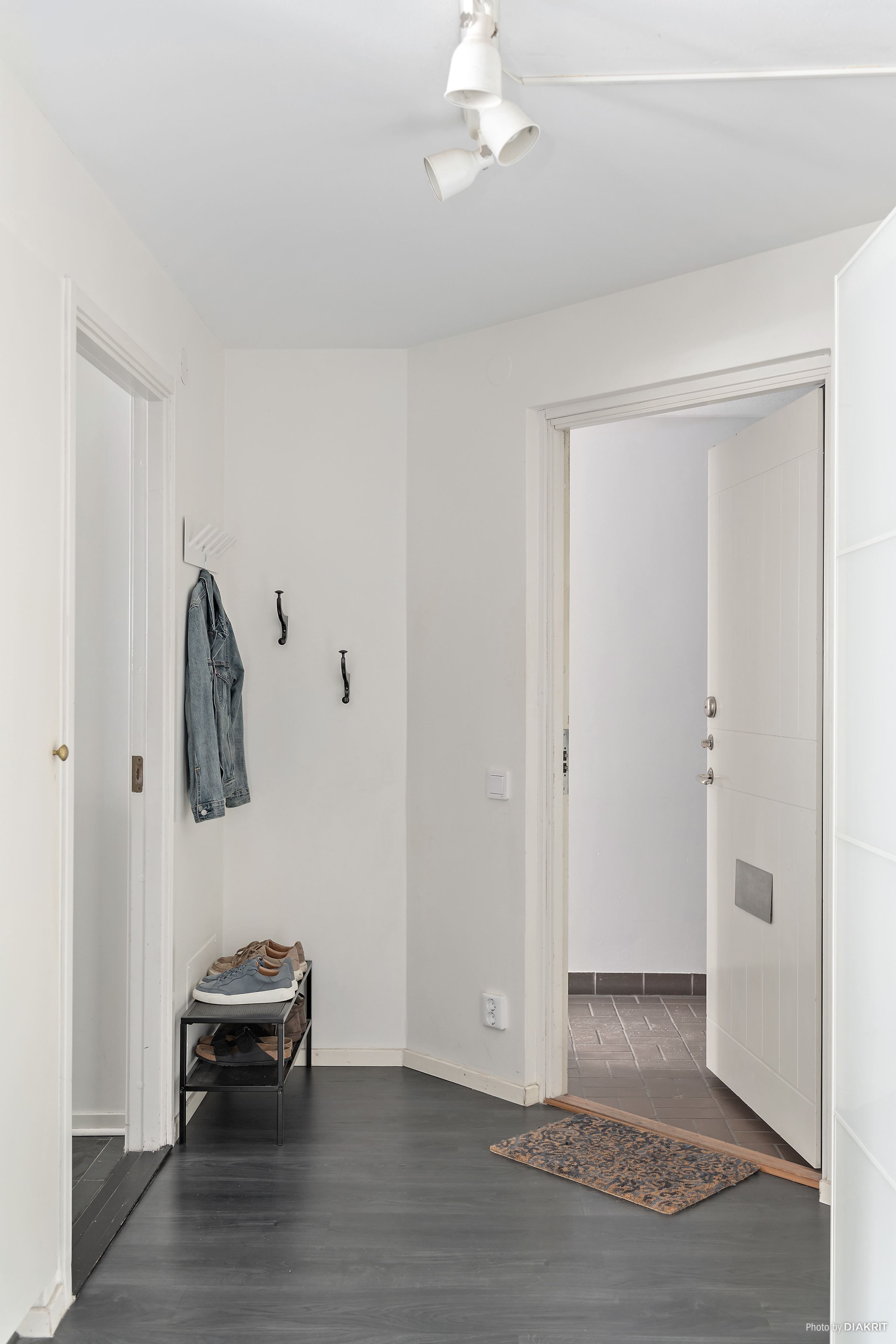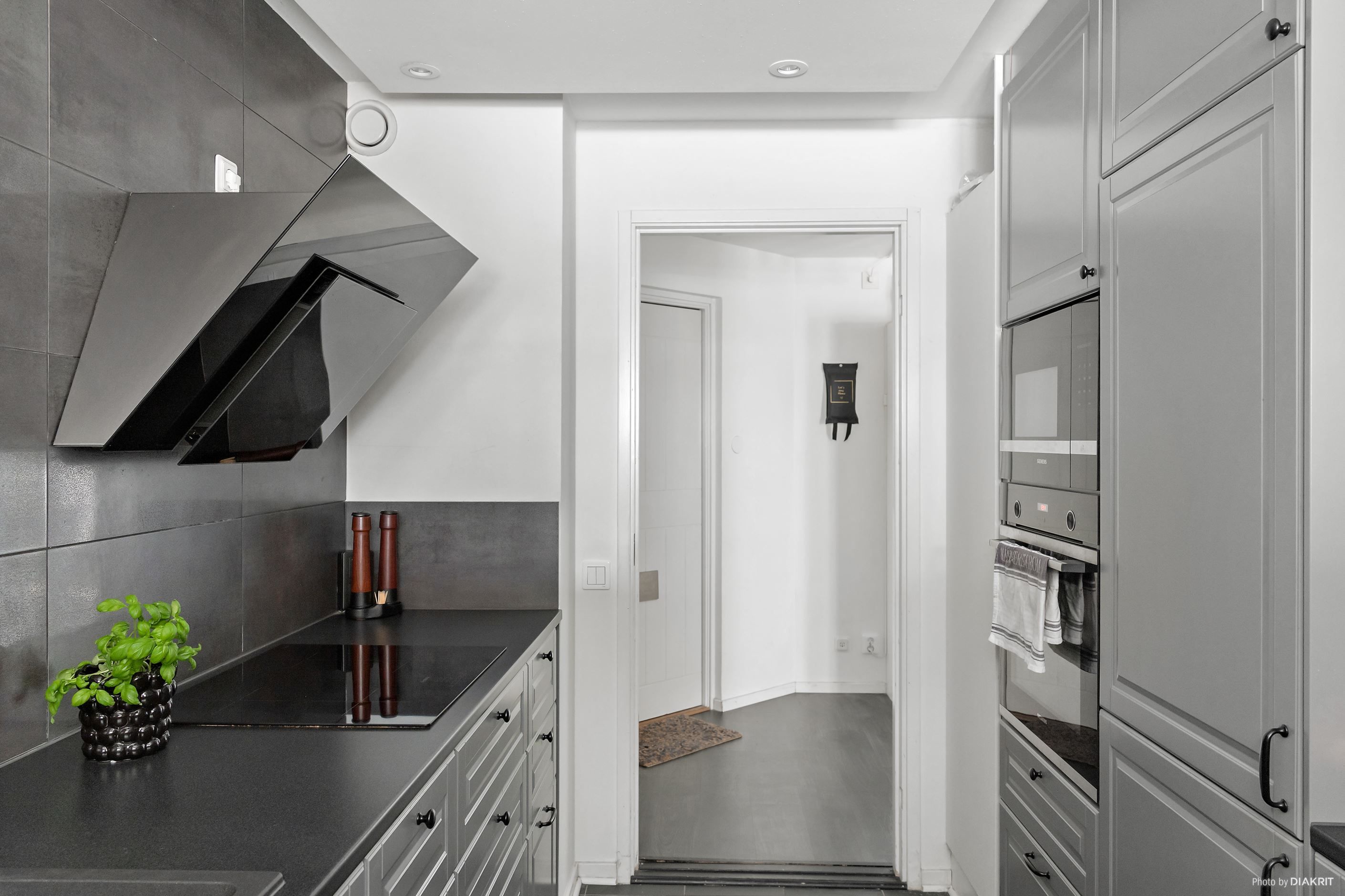 Vi välkomnas in i lägenheten genom en ljus hall med plats för att hänga av ytterkläder. Till höger ligger det stilrena köket, där det mörka golvet samspelar med grå köksinredning, svarta detaljer och vita väggar. Här finns allt man behöver i form av diskmaskin, mikrovågsugn, ugn, induktionshäll, fläkt samt kyl och frys. Vidare in i lägenheten möts vi av vardagsrummet, rymligt nog för både soffgrupp med tv-hörna, matplats och arbetsplats. Ljusinsläppet här är fantastiskt tack vare stora fönster som vetter mot den privata uteplatsen. Här njuter man av härliga dagar och mysiga grillkvällar med vänner och familj, självklart i optimalt söderläge. Här finns även en elektrisk markis att fälla ut för den som önskar skydd från solen.