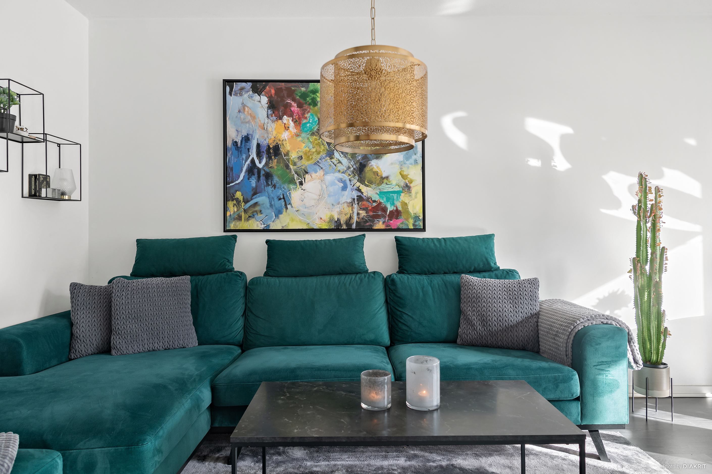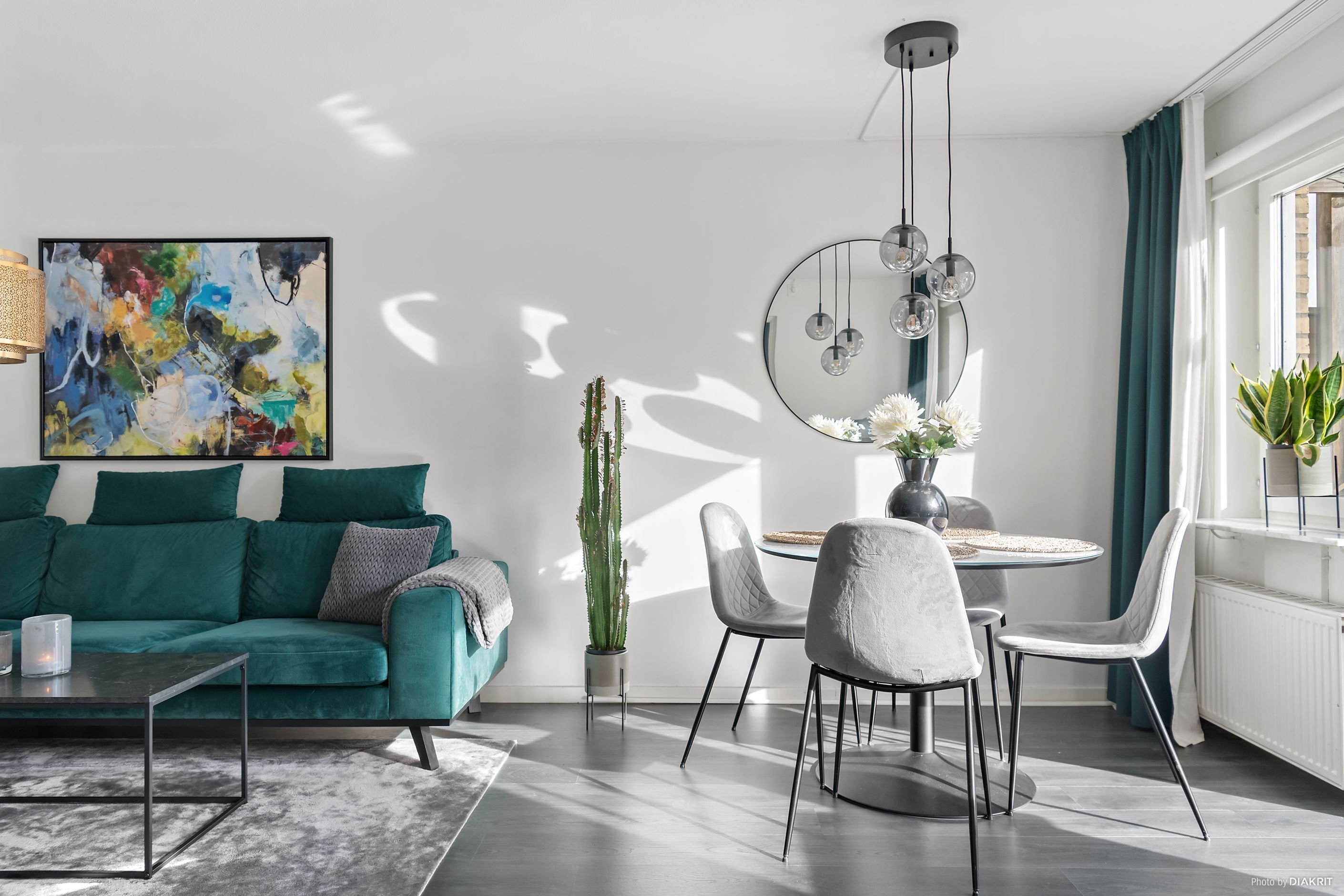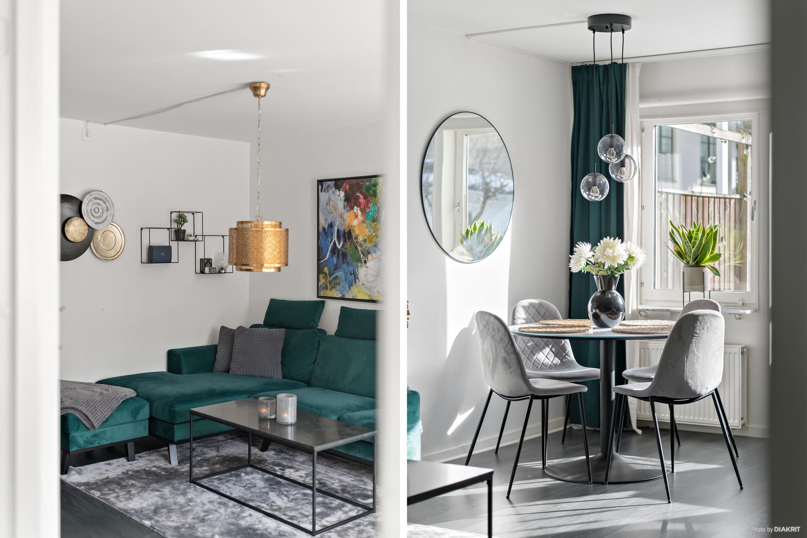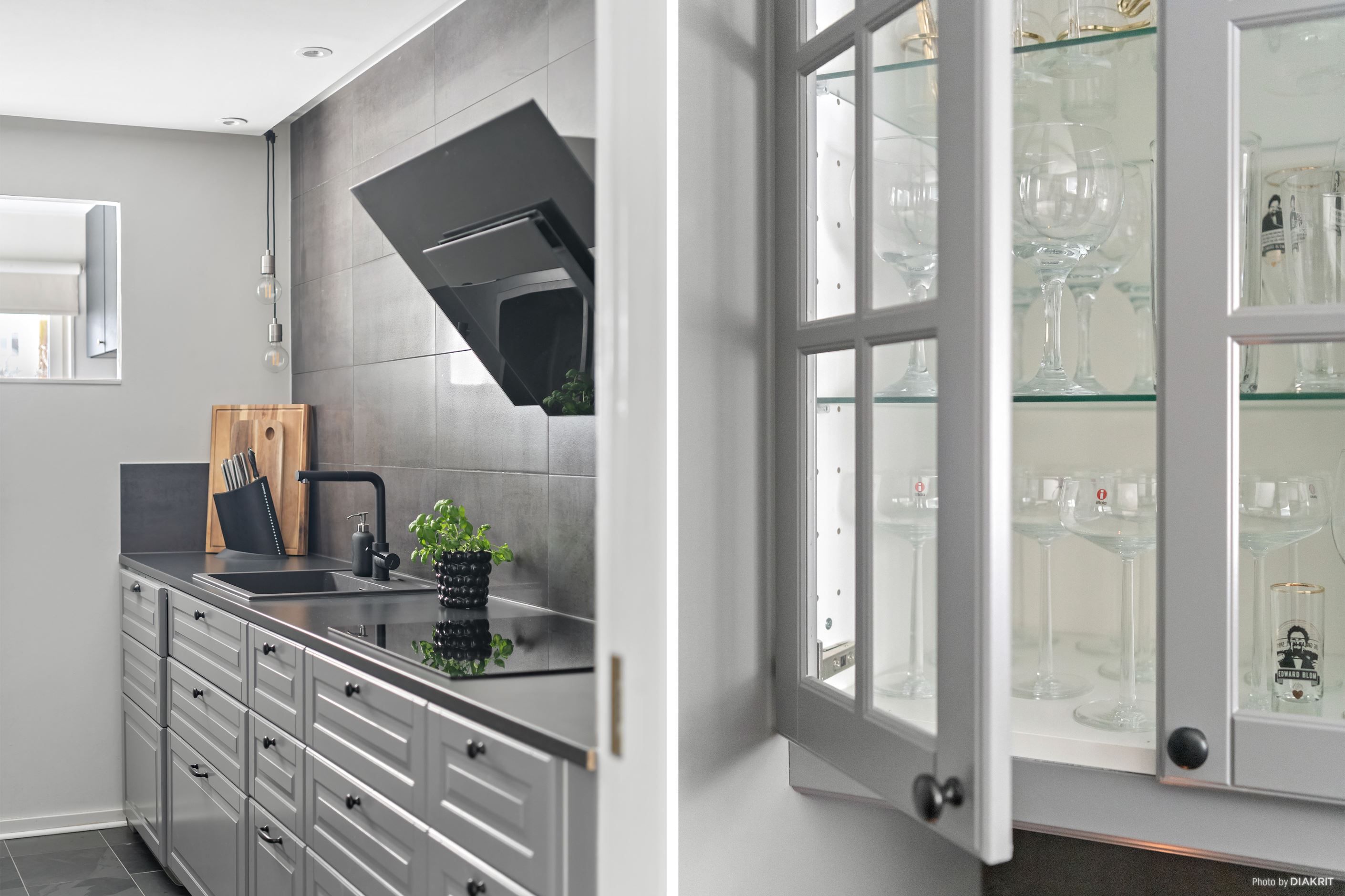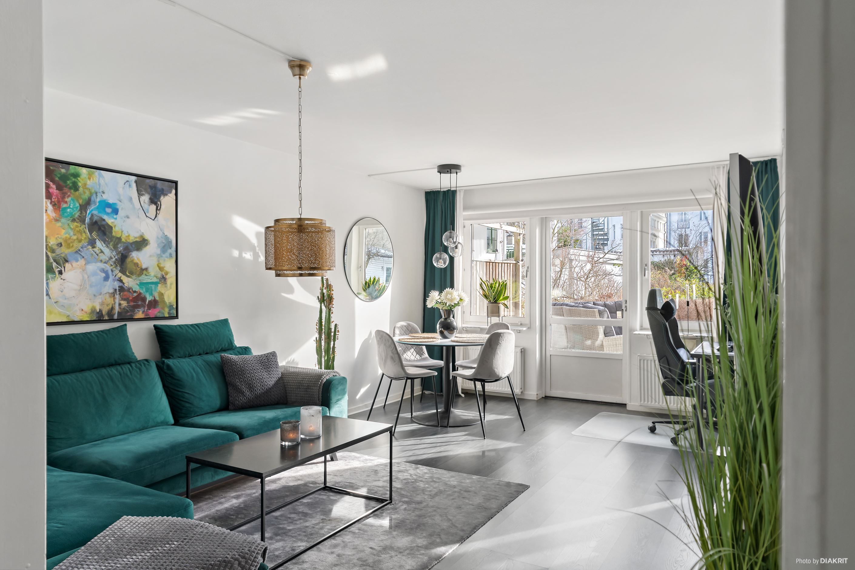Vi välkomnas in i lägenheten genom en ljus hall med plats för att hänga av ytterkläder. Till höger ligger det stilrena köket, där det mörka golvet samspelar med grå köksinredning, svarta detaljer och vita väggar. Här finns allt man behöver i form av diskmaskin, mikrovågsugn, ugn, induktionshäll, fläkt samt kyl och frys. Vidare in i lägenheten möts vi av vardagsrummet, rymligt nog för både soffgrupp med tv-hörna, matplats och arbetsplats. Ljusinsläppet här är fantastiskt tack vare stora fönster som vetter mot den privata uteplatsen. Här njuter man av härliga dagar och mysiga grillkvällar med vänner och familj, självklart i optimalt söderläge. Här finns även en elektrisk markis att fälla ut för den som önskar skydd från solen.