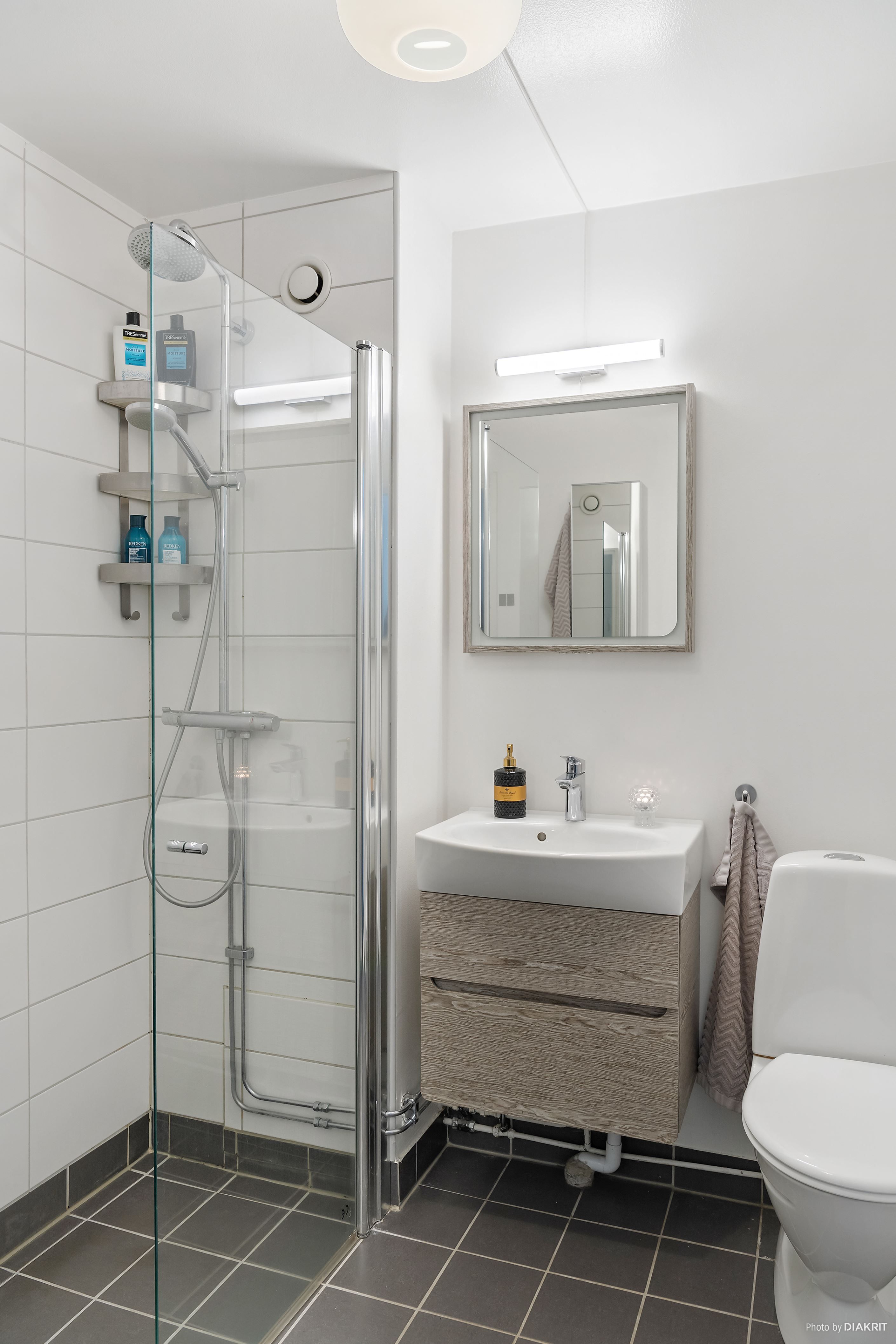 Sovrummet rymmer en dubbelsäng och även här finns fönster mot den härliga uteplatsen. Badrummet är helkaklat i grått och vitt samt utrustat med dusch, wc, handfat med kommod samt spegel.