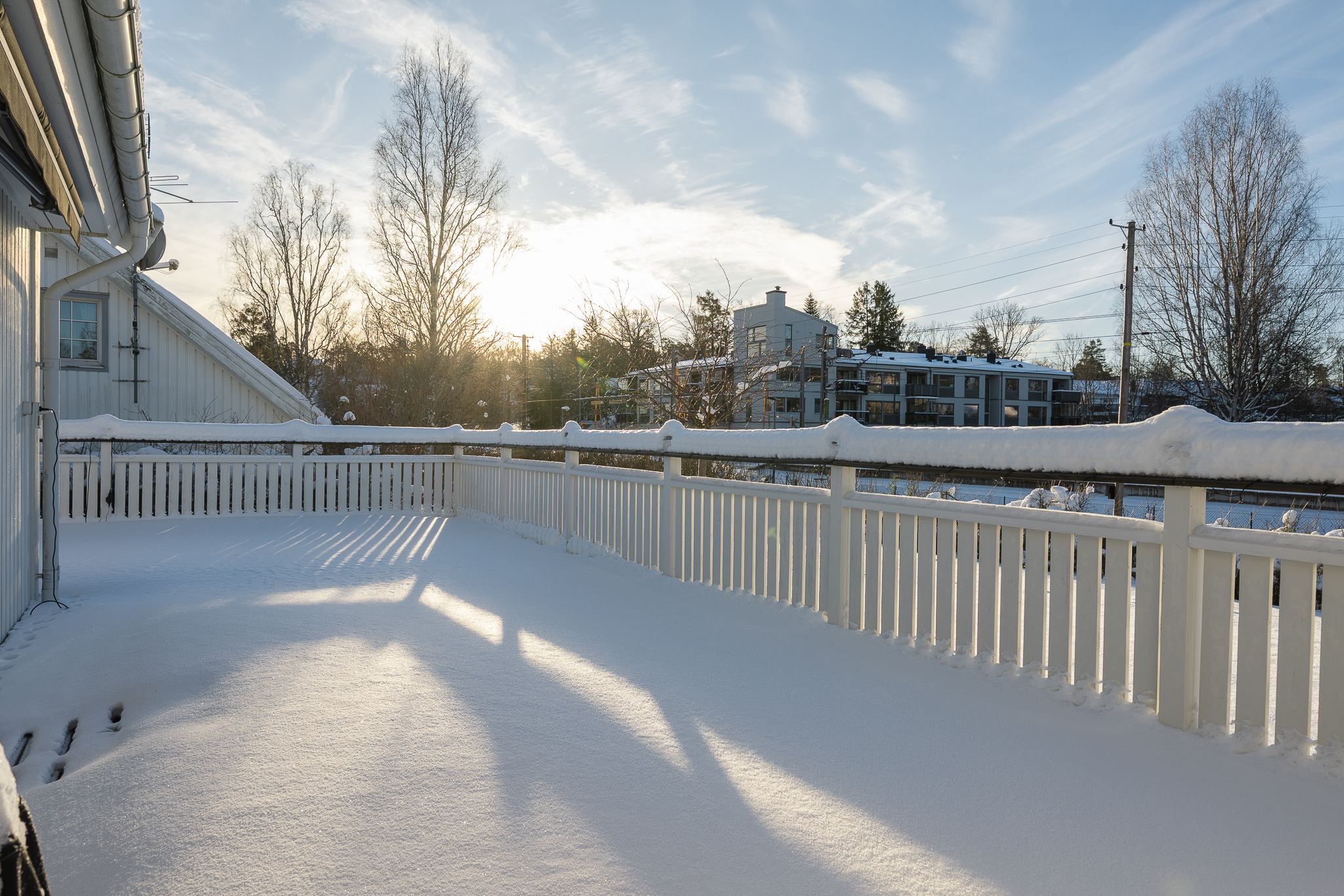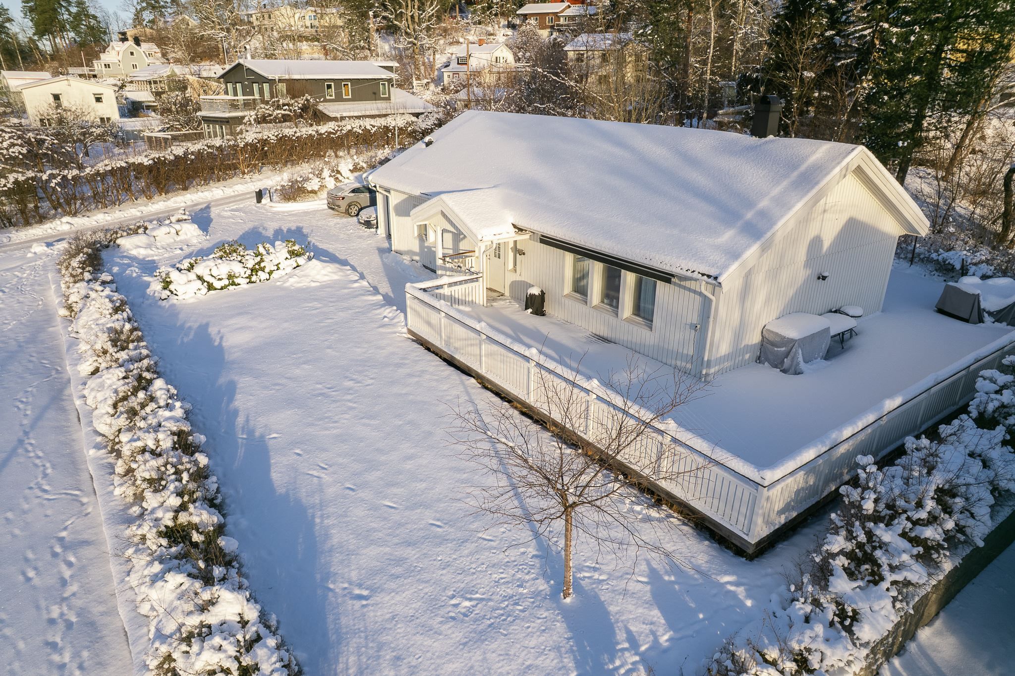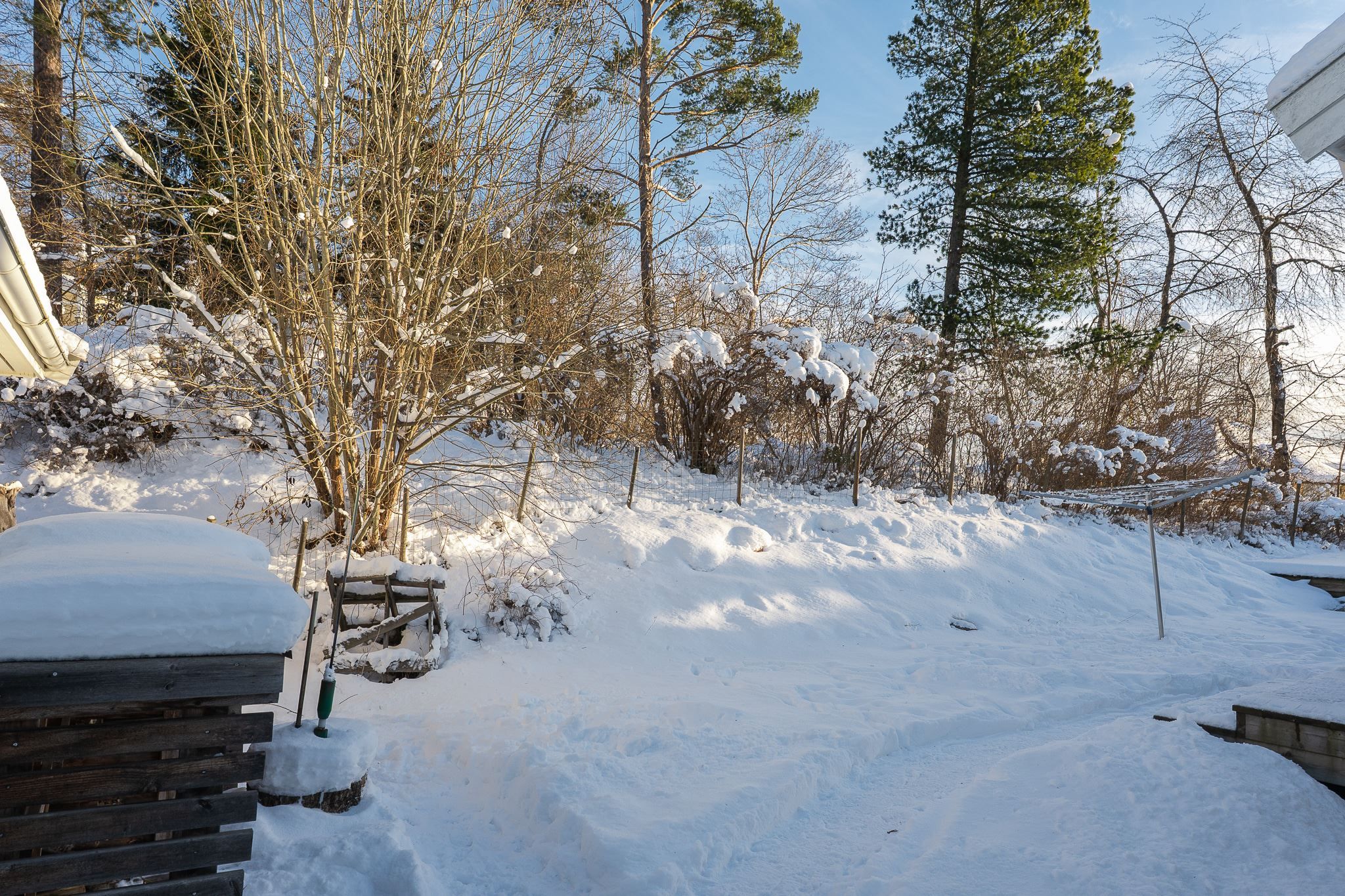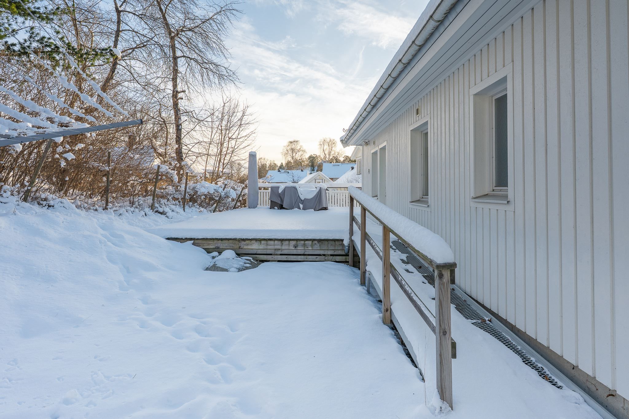 Den insynsskyddade baksidan och den soldränkta tomten ger sol från morgon till sen kväll, även vintertid ges här gott om soltimmar. Här finns en altan på framsidan med markis samt en insynsskyddad altan på baksidan, vilka binds samman via altan även på den ena gaveln – en härlig helhet som skapar flera uteplatser med sol under hela dagen. Tomten är lättskött och erbjuder gott om plats för både avkoppling och umgänge.