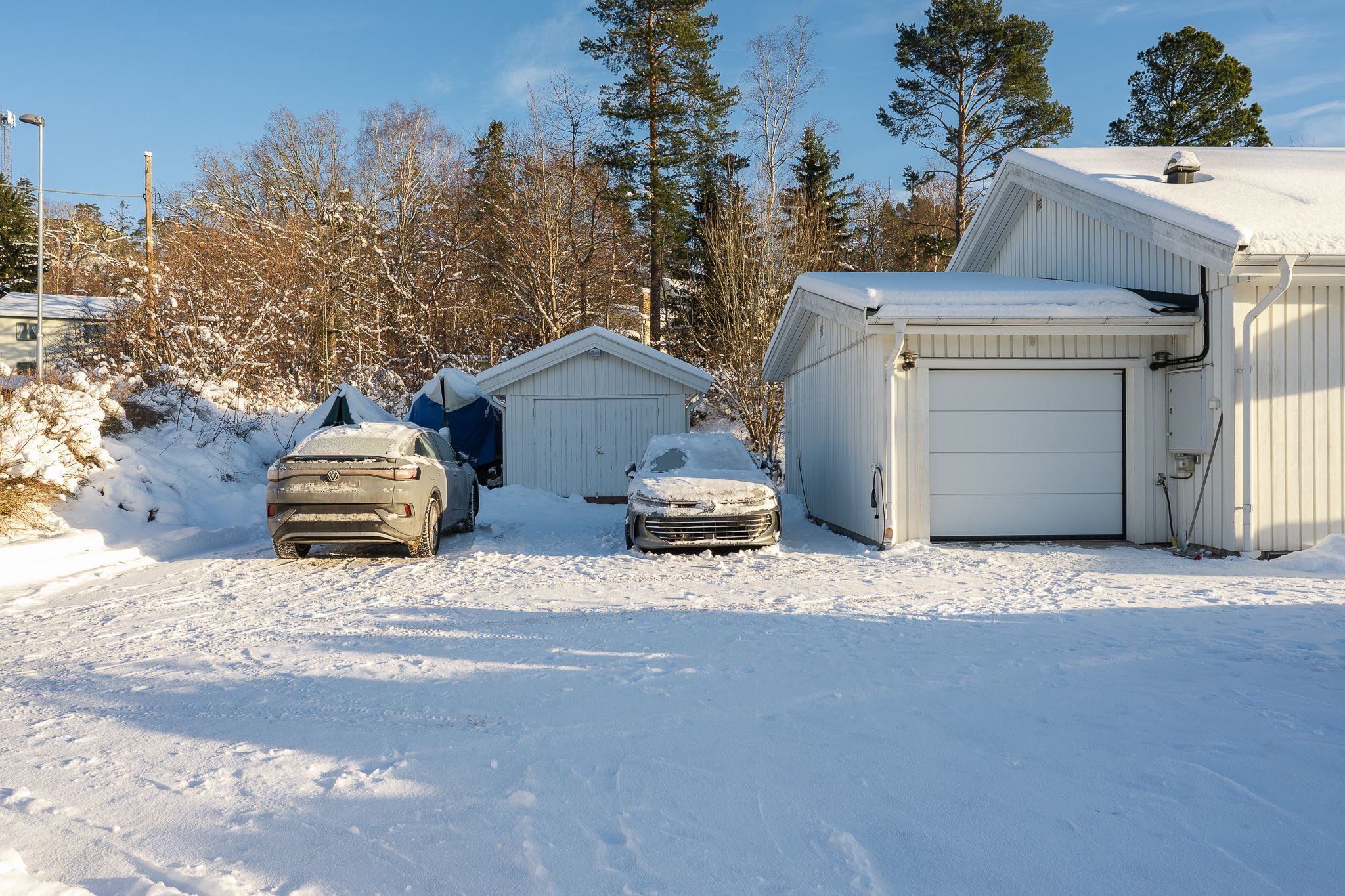 Fastigheten har mycket goda parkeringsmöjligheter med två garage, varav det ena med direktaccess till huset, samt en stor stenlagd uppfart med plats för cirka sex bilar och även möjlighet att placera din båt vintertid.