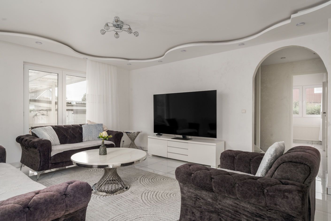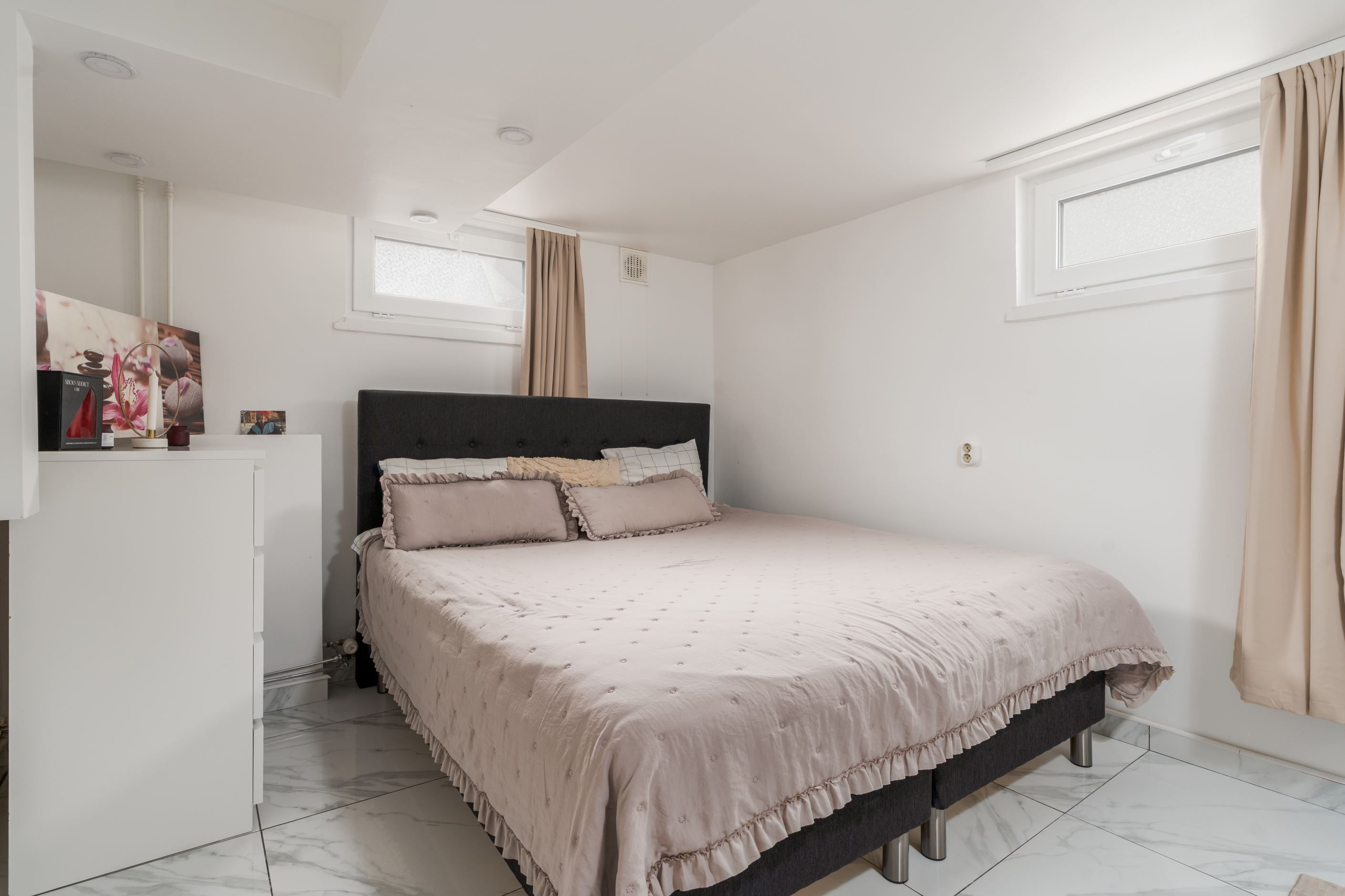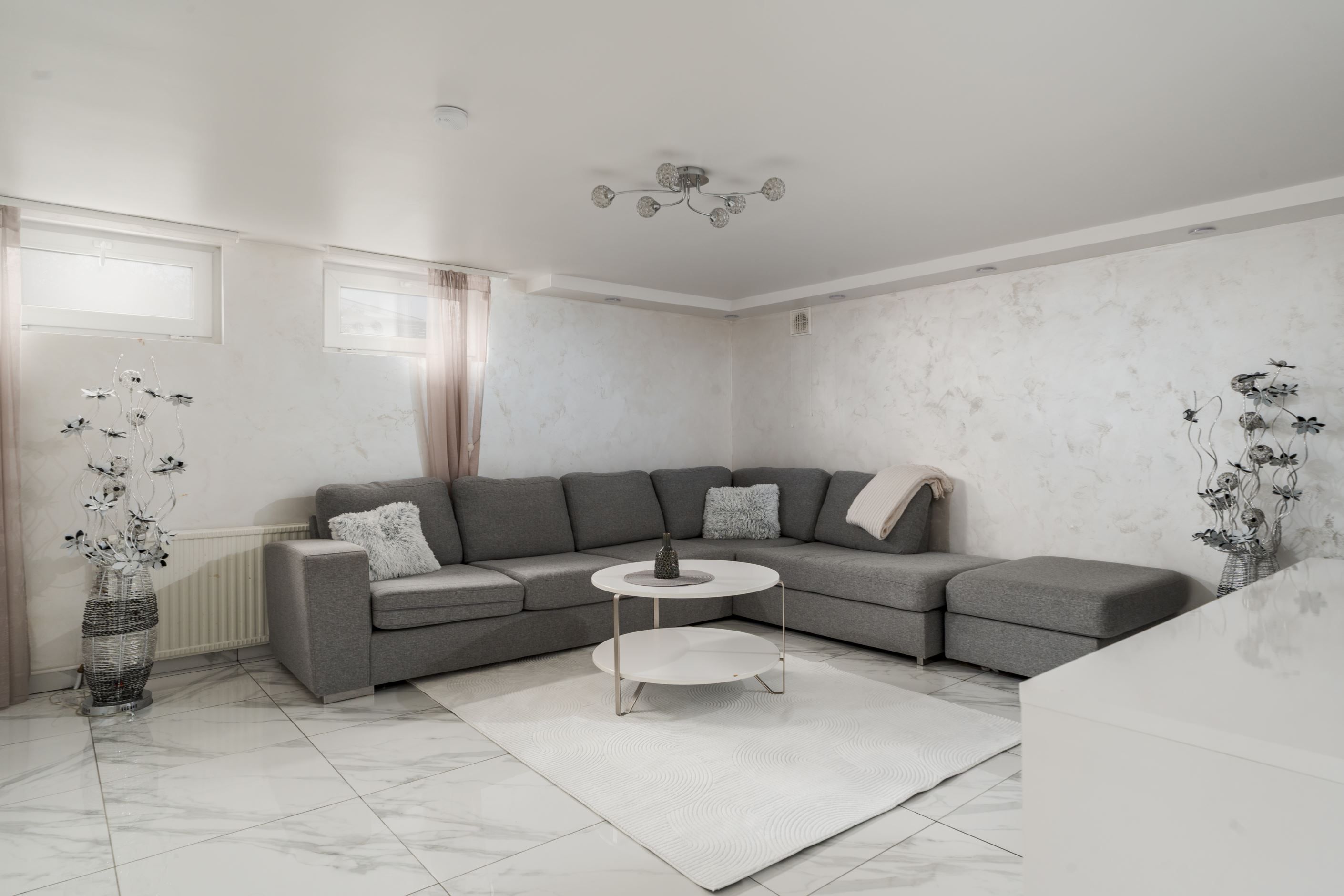 Huset har en välplanerad planlösning med ett stort vardagsrum där det finns plats för både soffa och matbord. De stora fönstren ger fint ljusinsläpp och en öppen känsla. Köket ligger i anslutning till vardagsrummet och har gott om förvaring och arbetsyta.