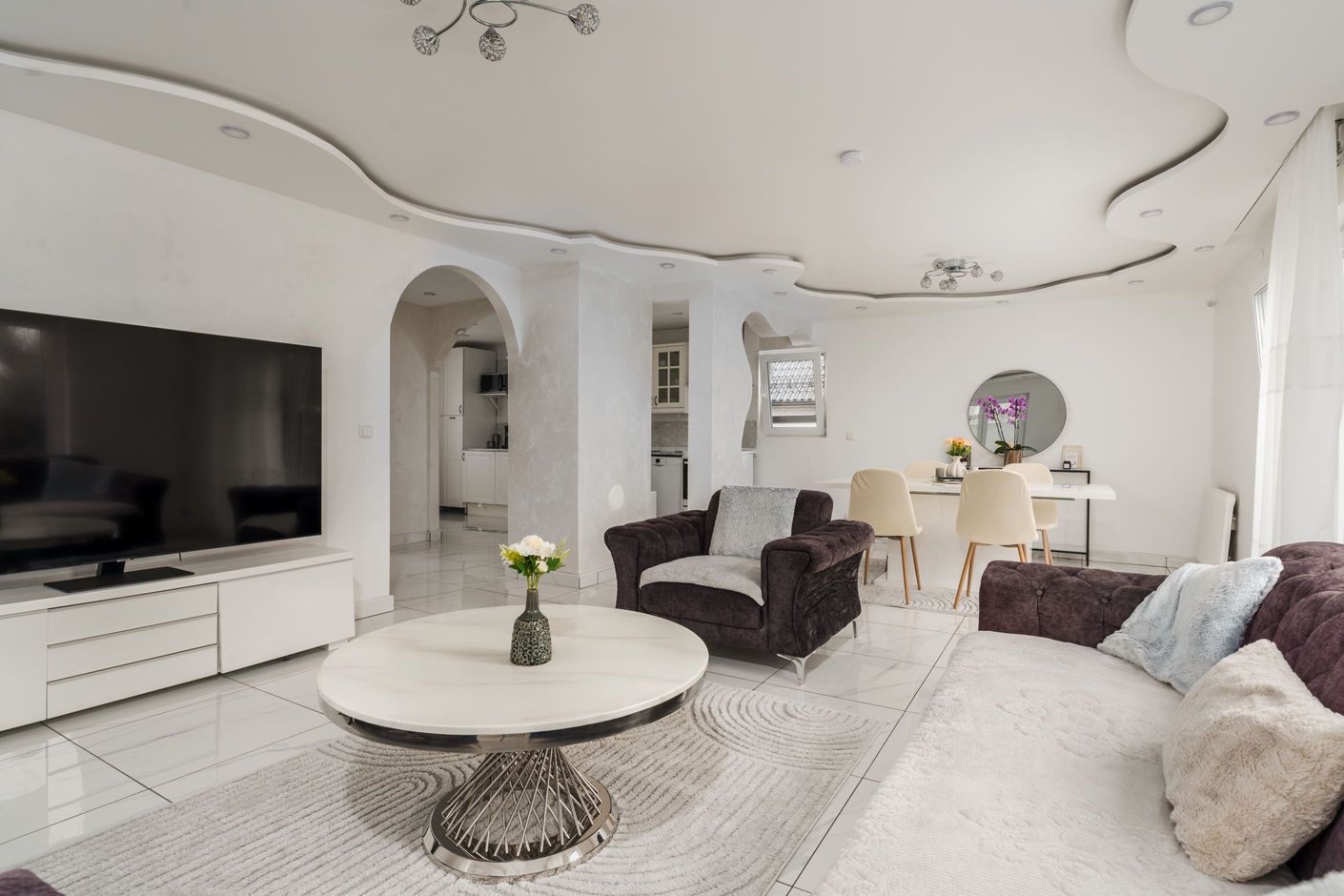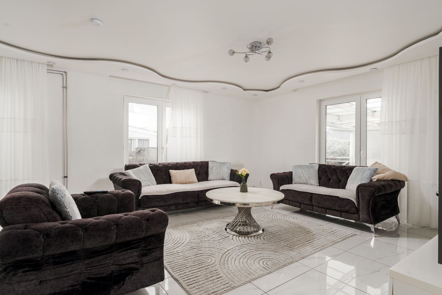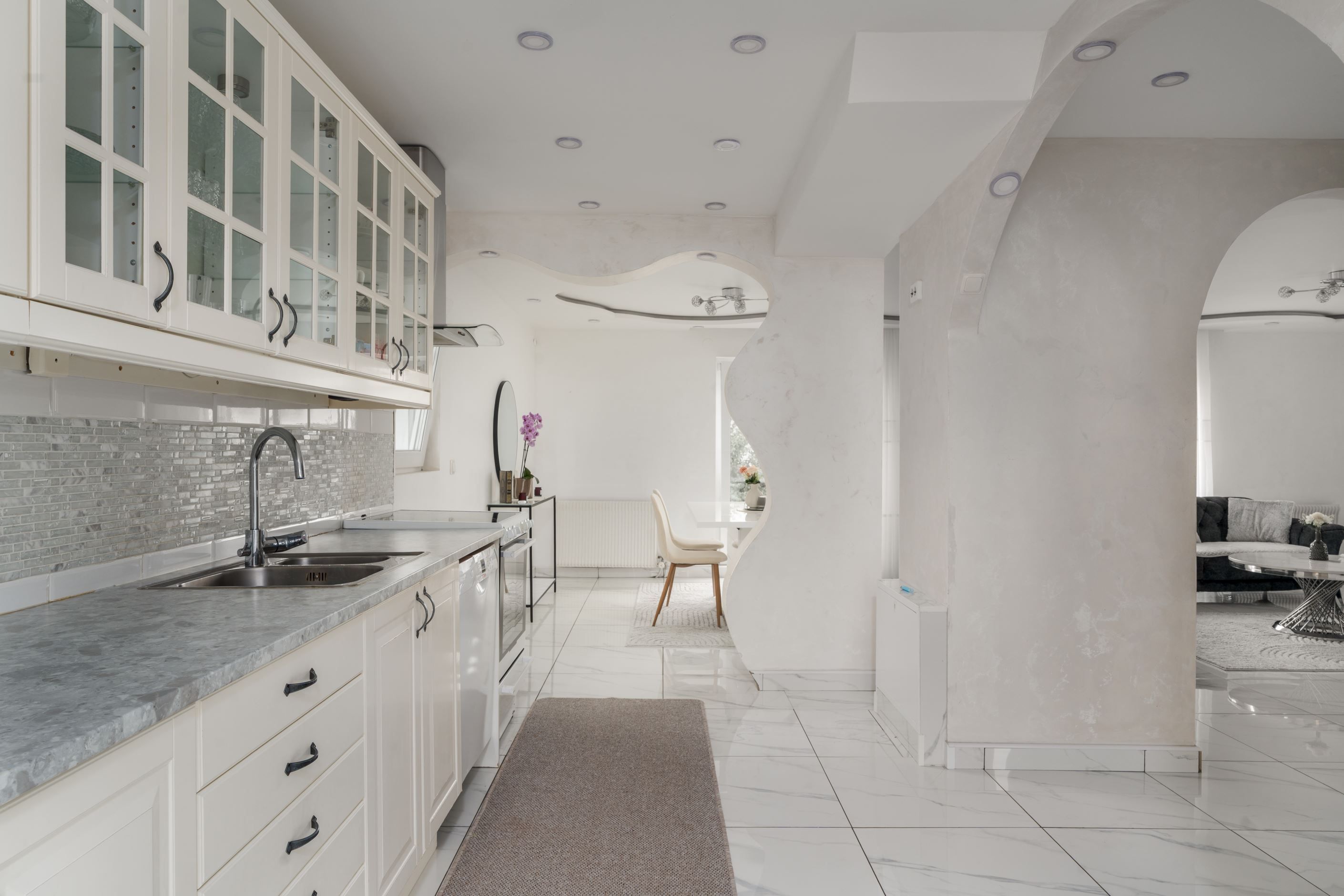 Huset har en välplanerad planlösning med ett stort vardagsrum där det finns plats för både soffa och matbord. De stora fönstren ger fint ljusinsläpp och en öppen känsla. Köket ligger i anslutning till vardagsrummet och har gott om förvaring och arbetsyta.