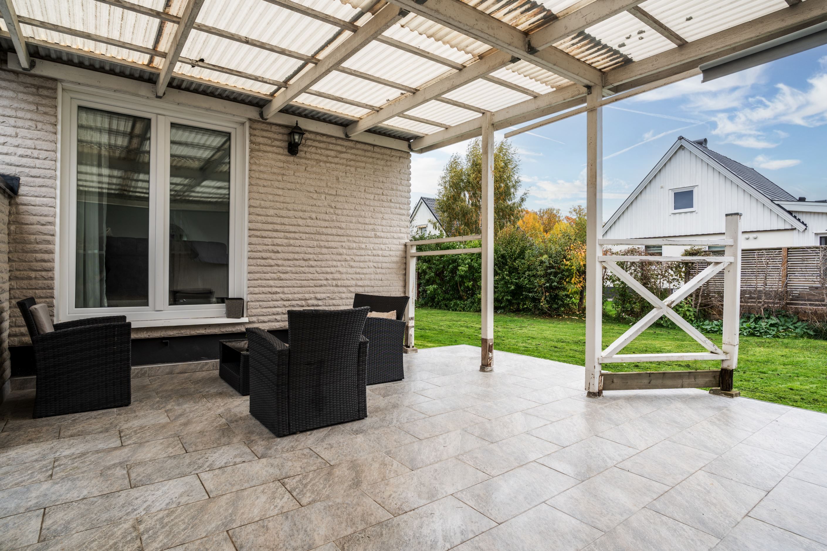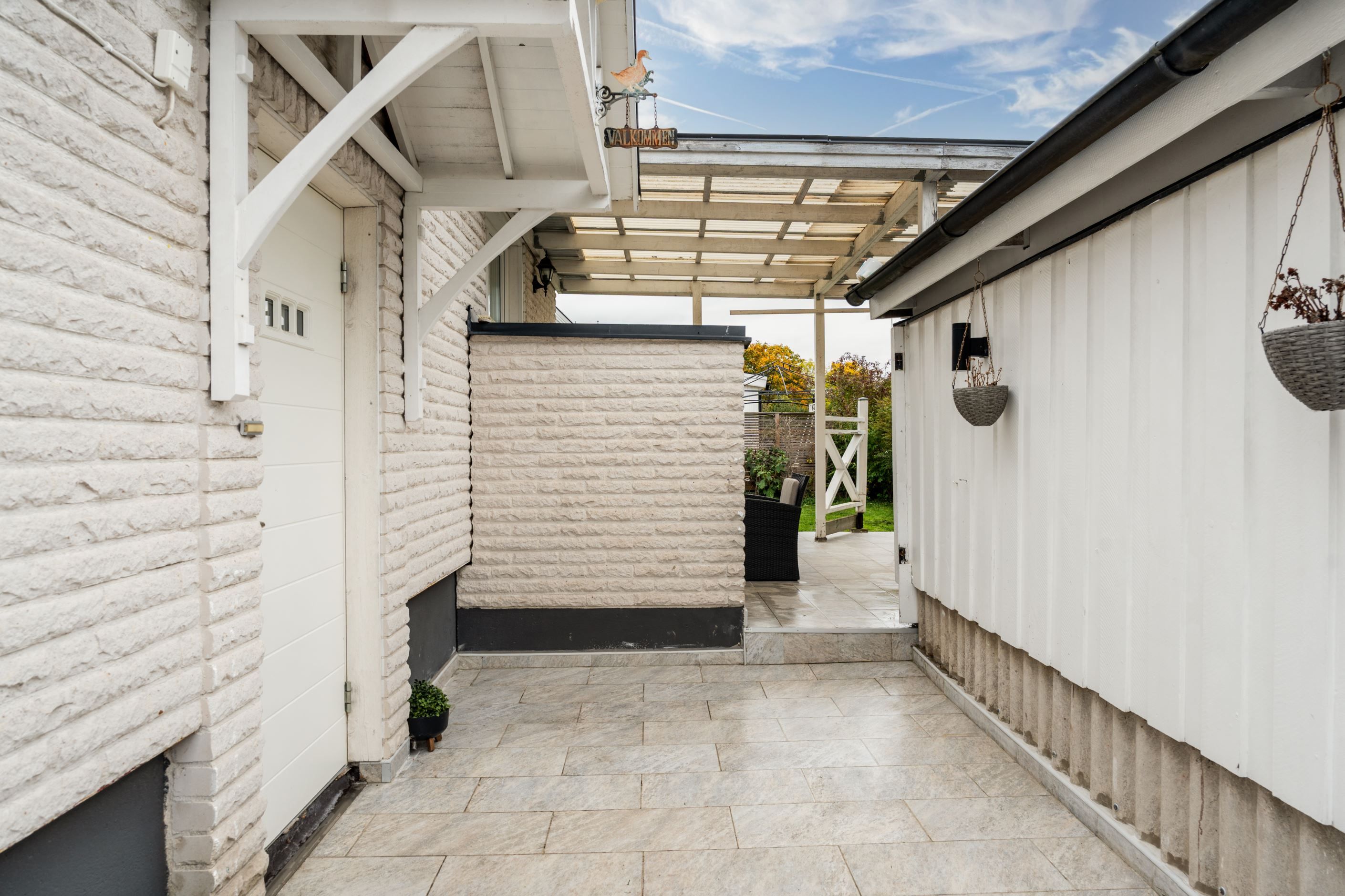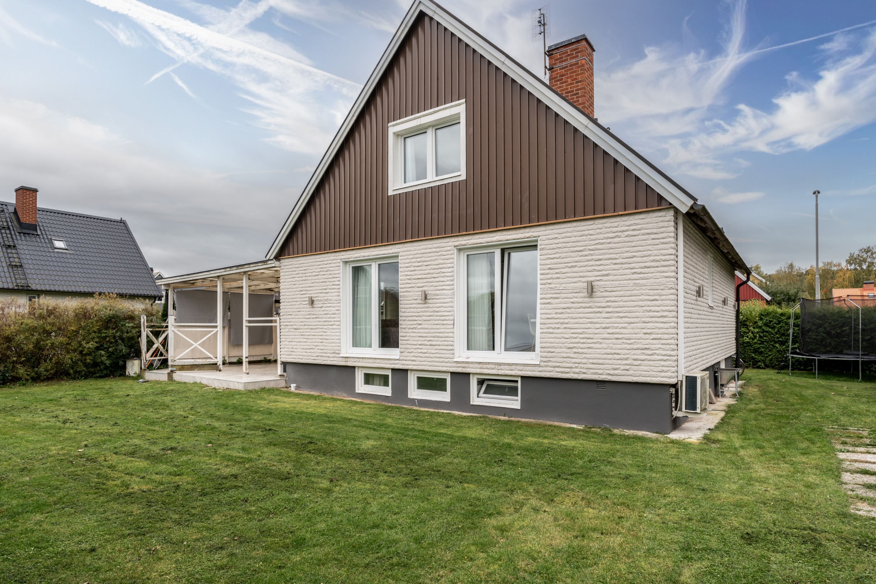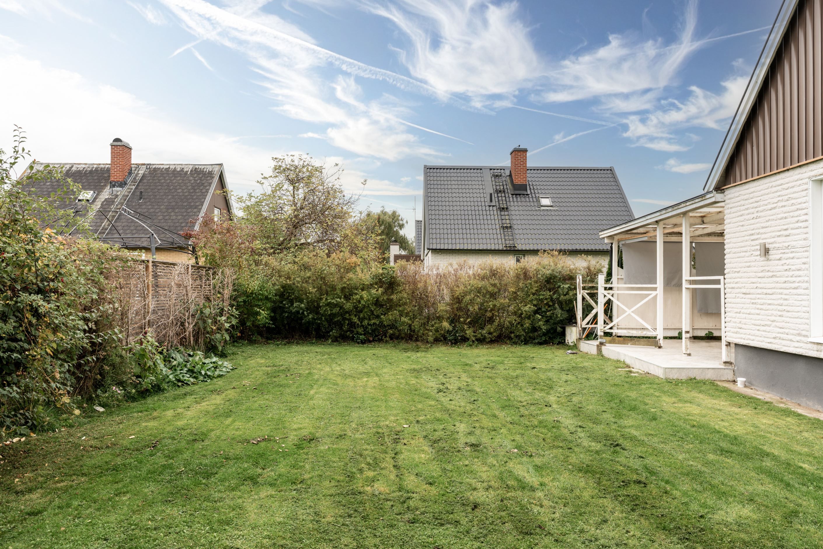 På baksidan finns en plan trädgård med gräsmatta och en altan under tak – perfekt för att umgås eller koppla av utomhus. På framsidan finns uppfart och garage.