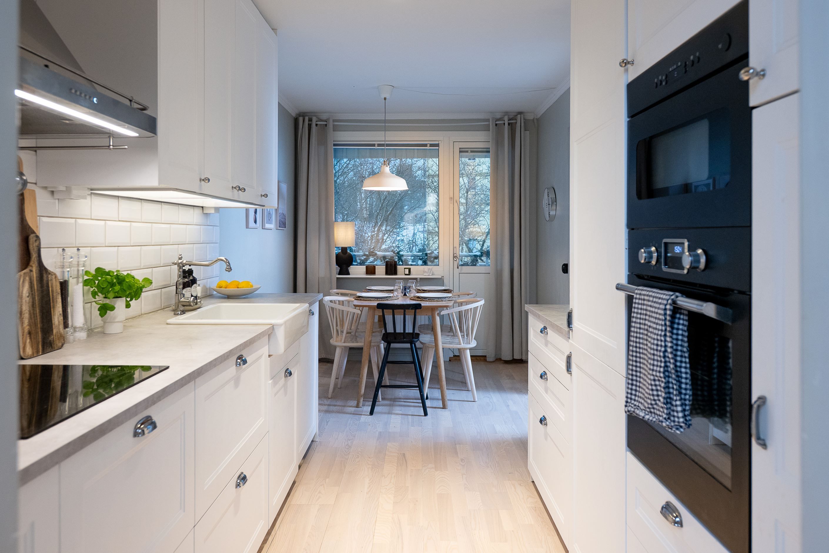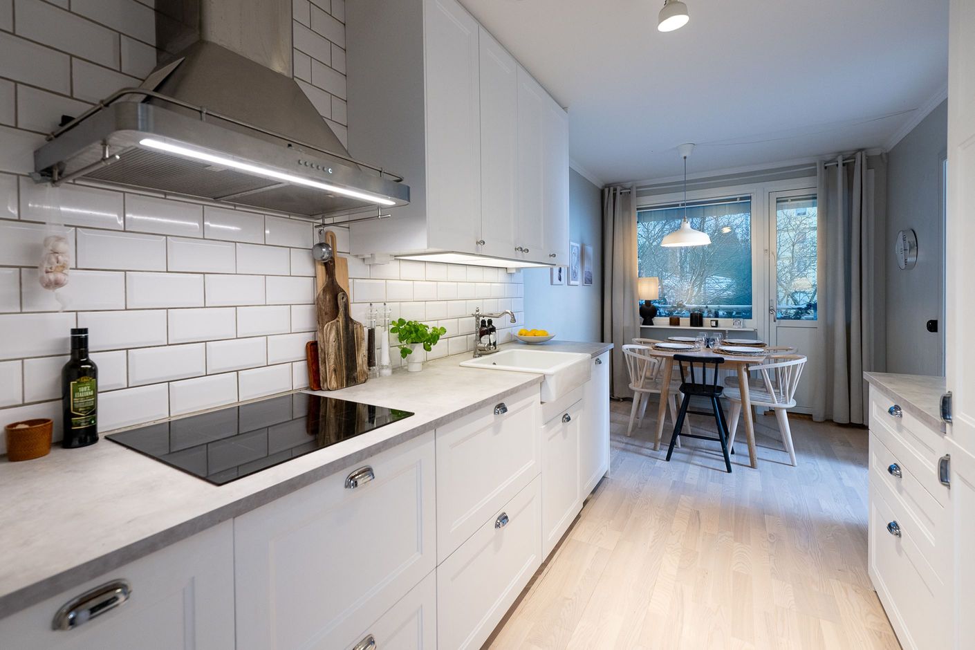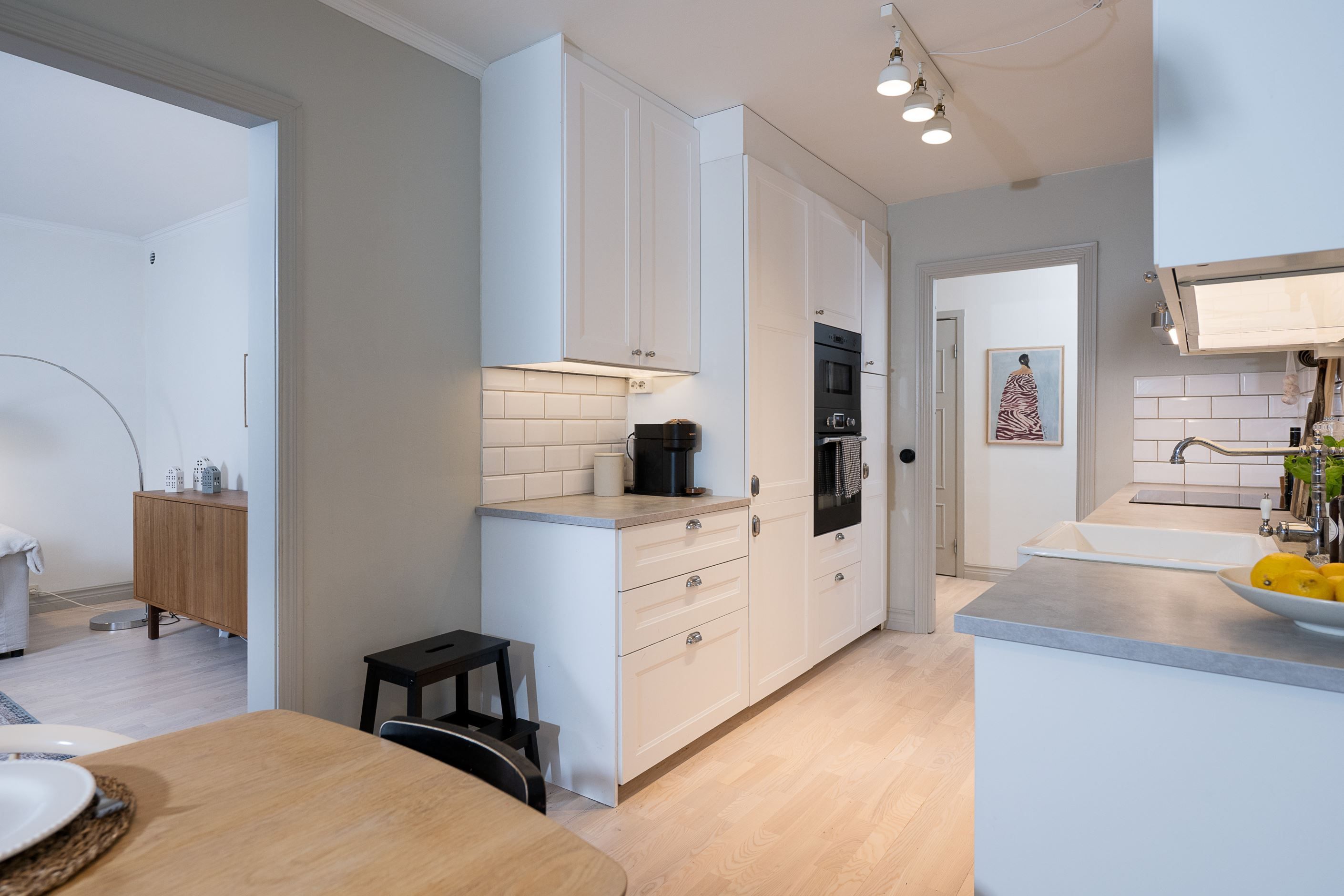 I det stilfulla köket, med sina vita skåpsluckor och elegant kakel, har du både funktion och design. Balkongen, precis intill köket och vardagsrummet, bjuder på mysiga kaffestunder. Det moderna, helkaklade badrummet med grått golv och duschhörna erbjuder en fräsch start på dagen.