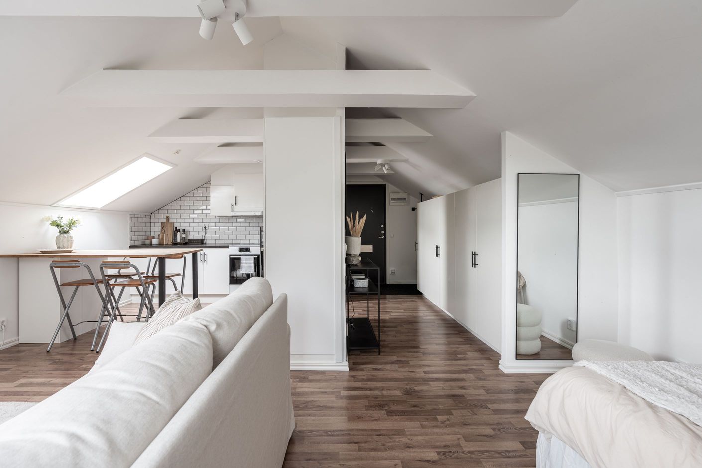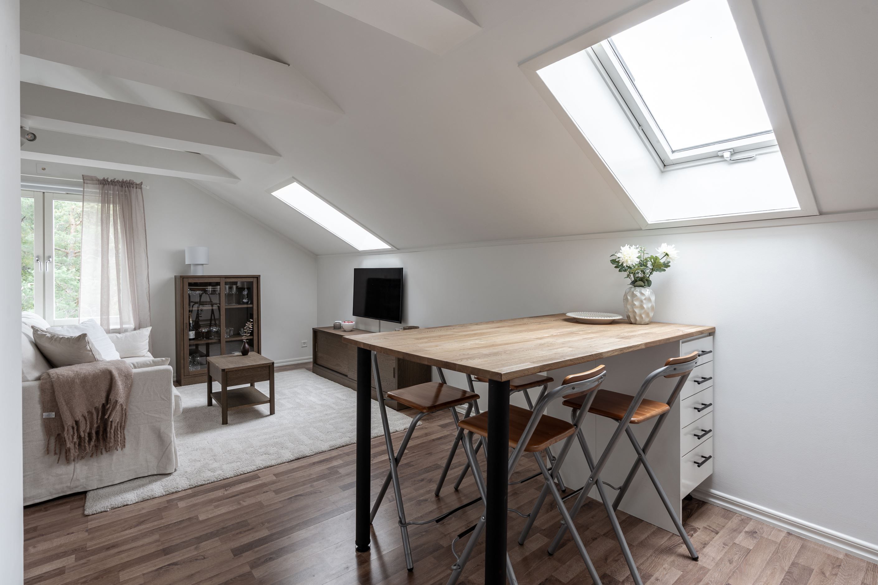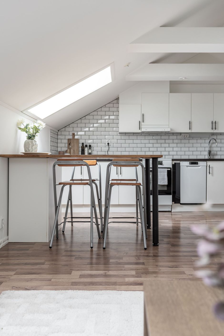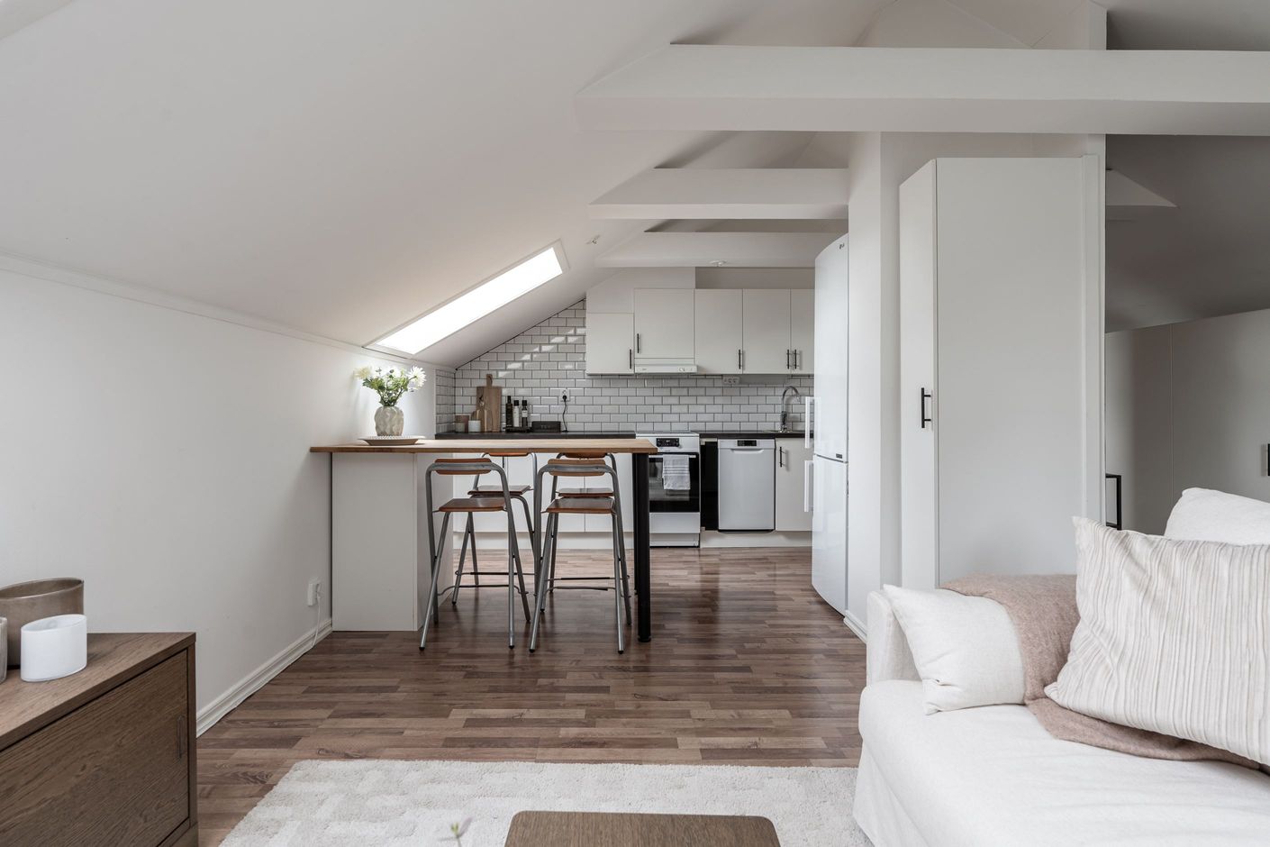 De karaktärsfulla inslagen såsom synliga takbjälkar, vackra snedtak och generösa takfönster ger bostaden både personlighet och ett fint ljusinsläpp som förstärker den luftiga känslan. Den öppna planlösningen mellan kök och allrum skapar en social och rymlig yta som passar perfekt för en välplanerad enrummare.