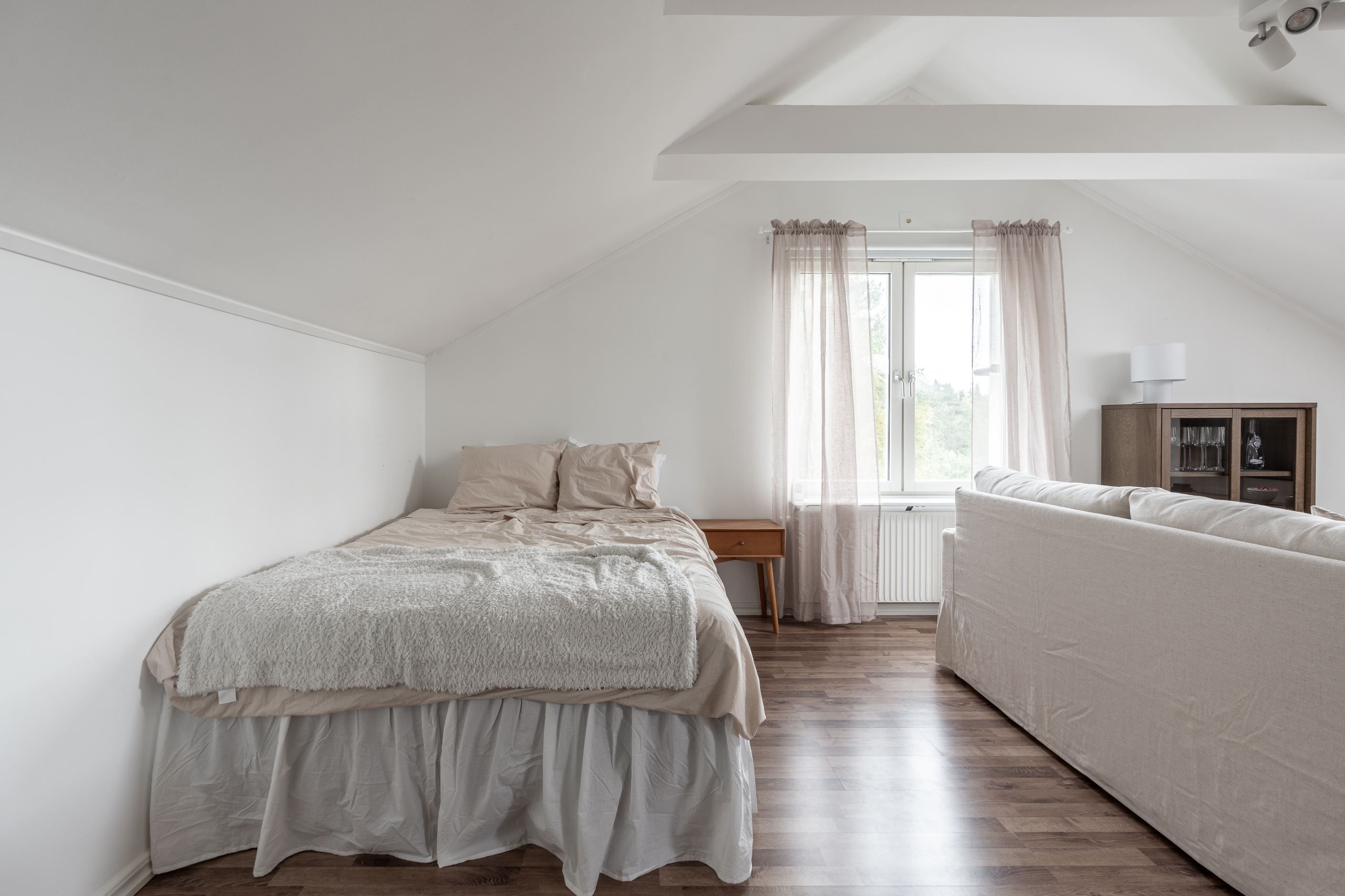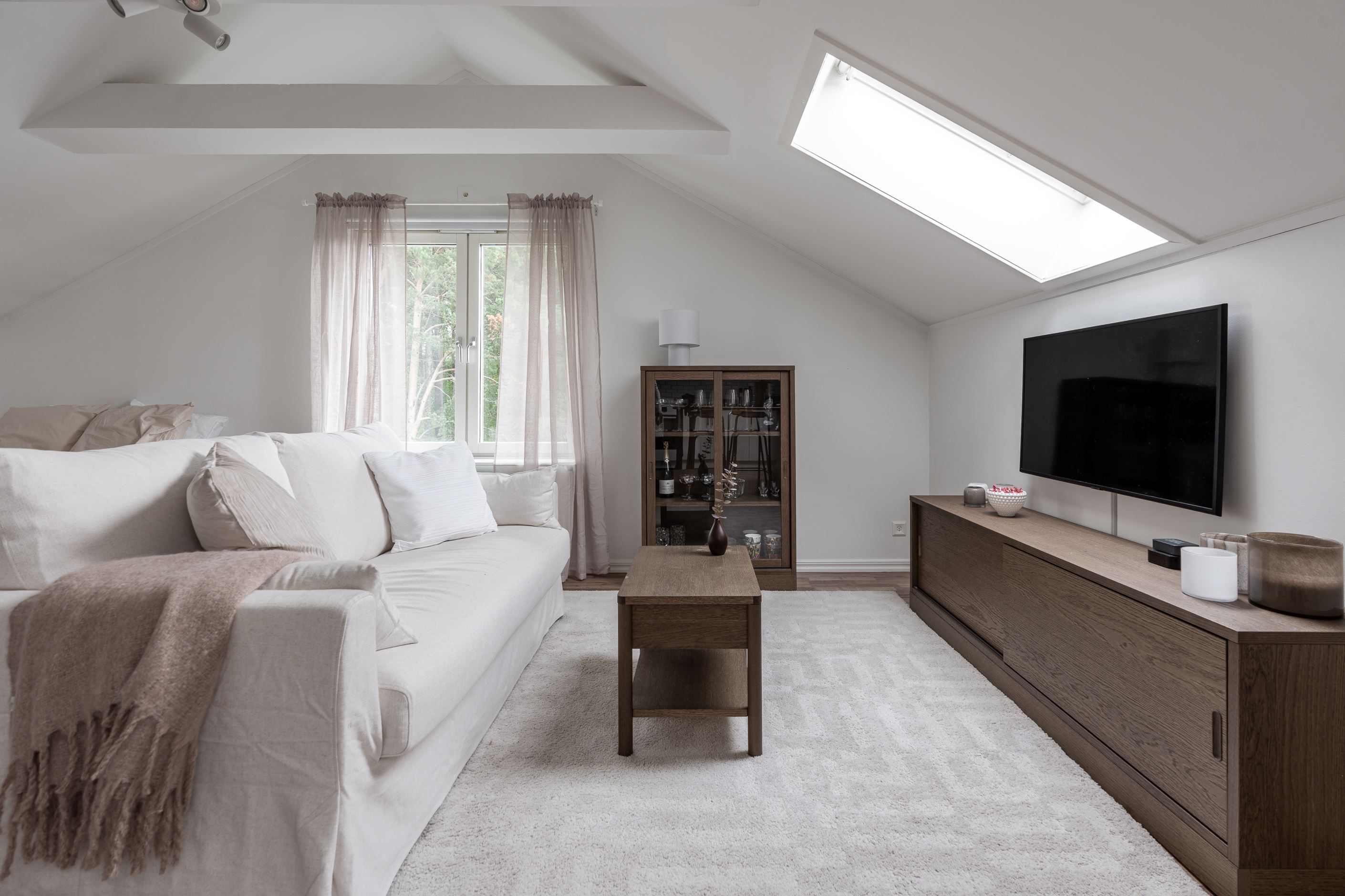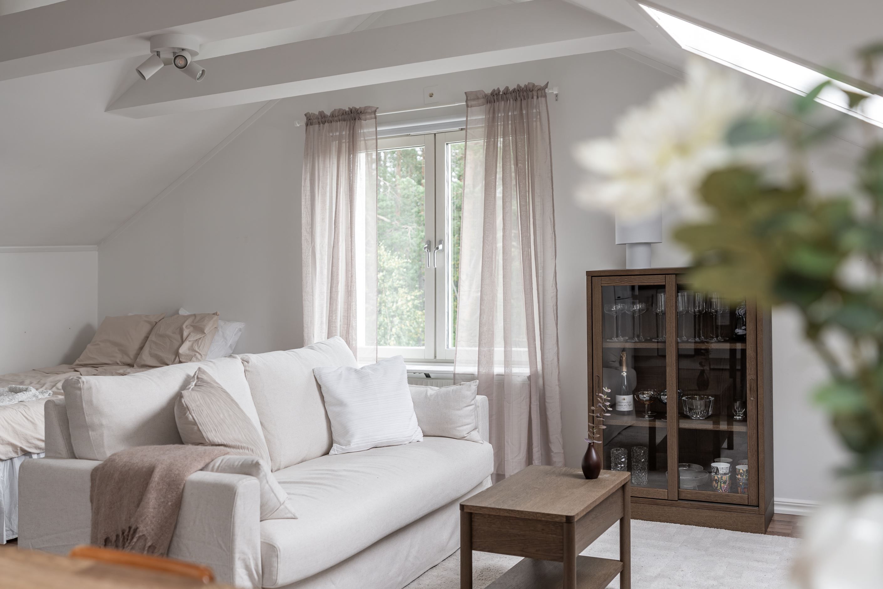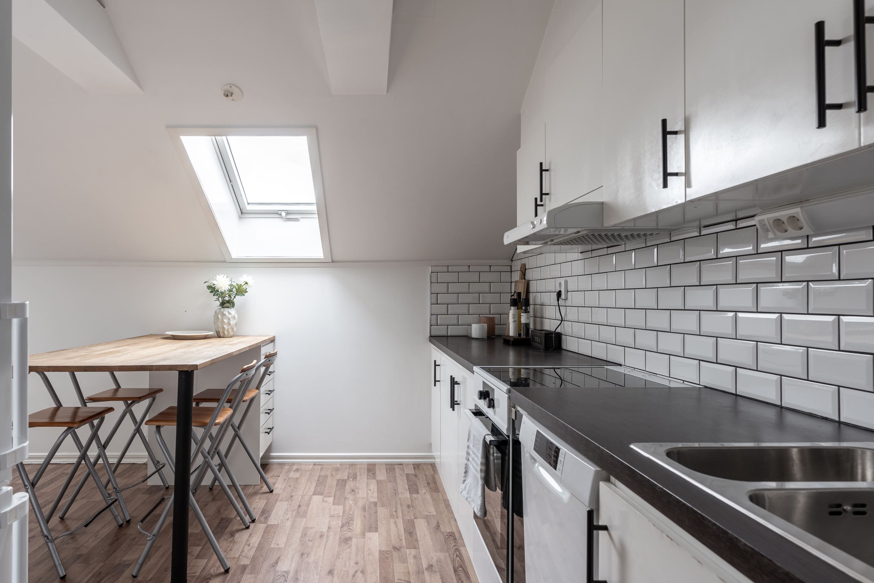 De karaktärsfulla inslagen såsom synliga takbjälkar, vackra snedtak och generösa takfönster ger bostaden både personlighet och ett fint ljusinsläpp som förstärker den luftiga känslan. Den öppna planlösningen mellan kök och allrum skapar en social och rymlig yta som passar perfekt för en välplanerad enrummare.