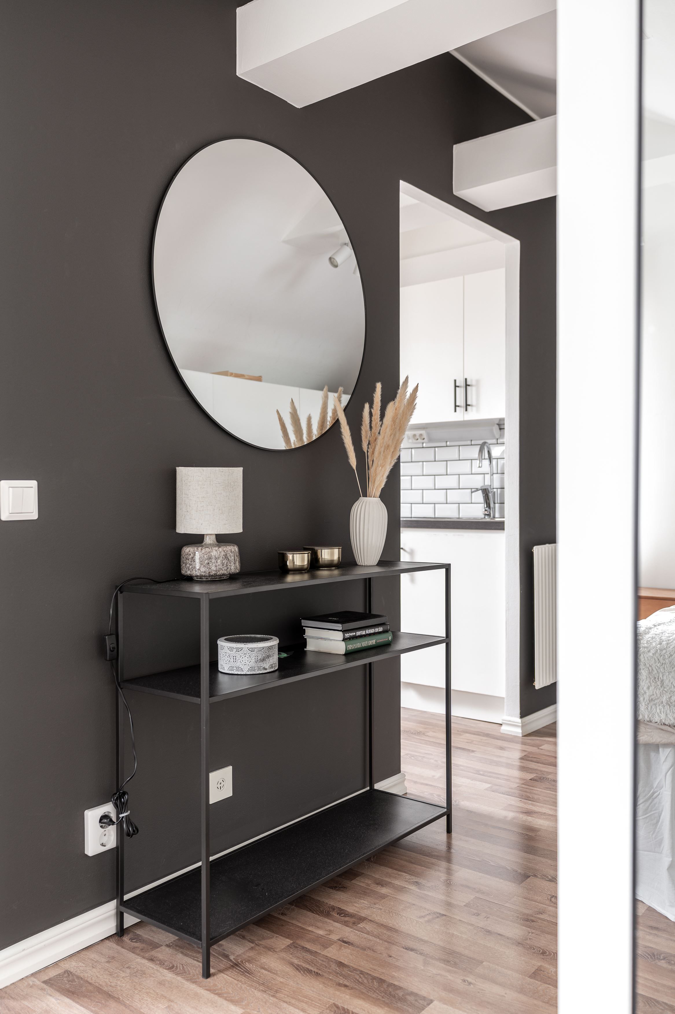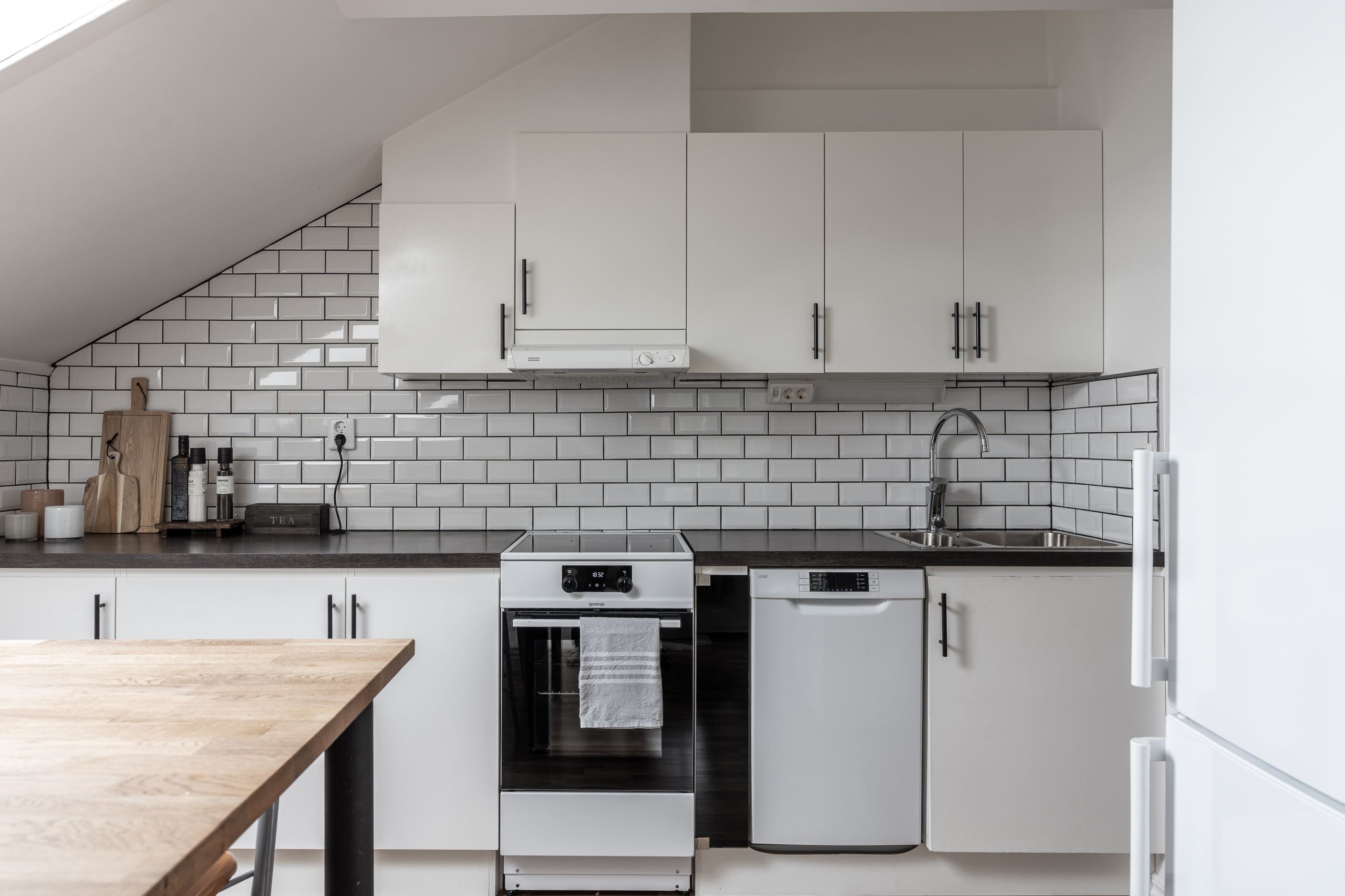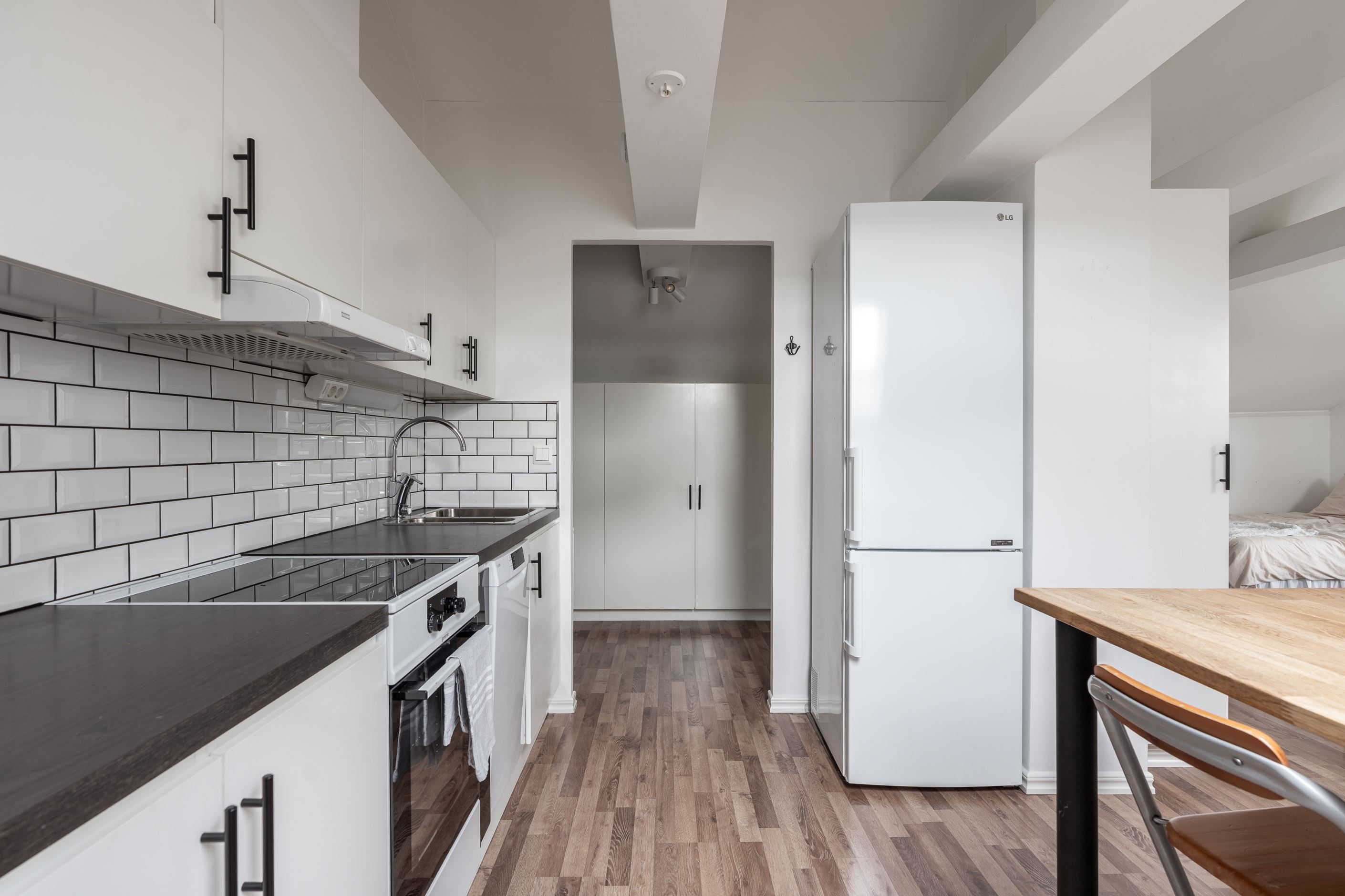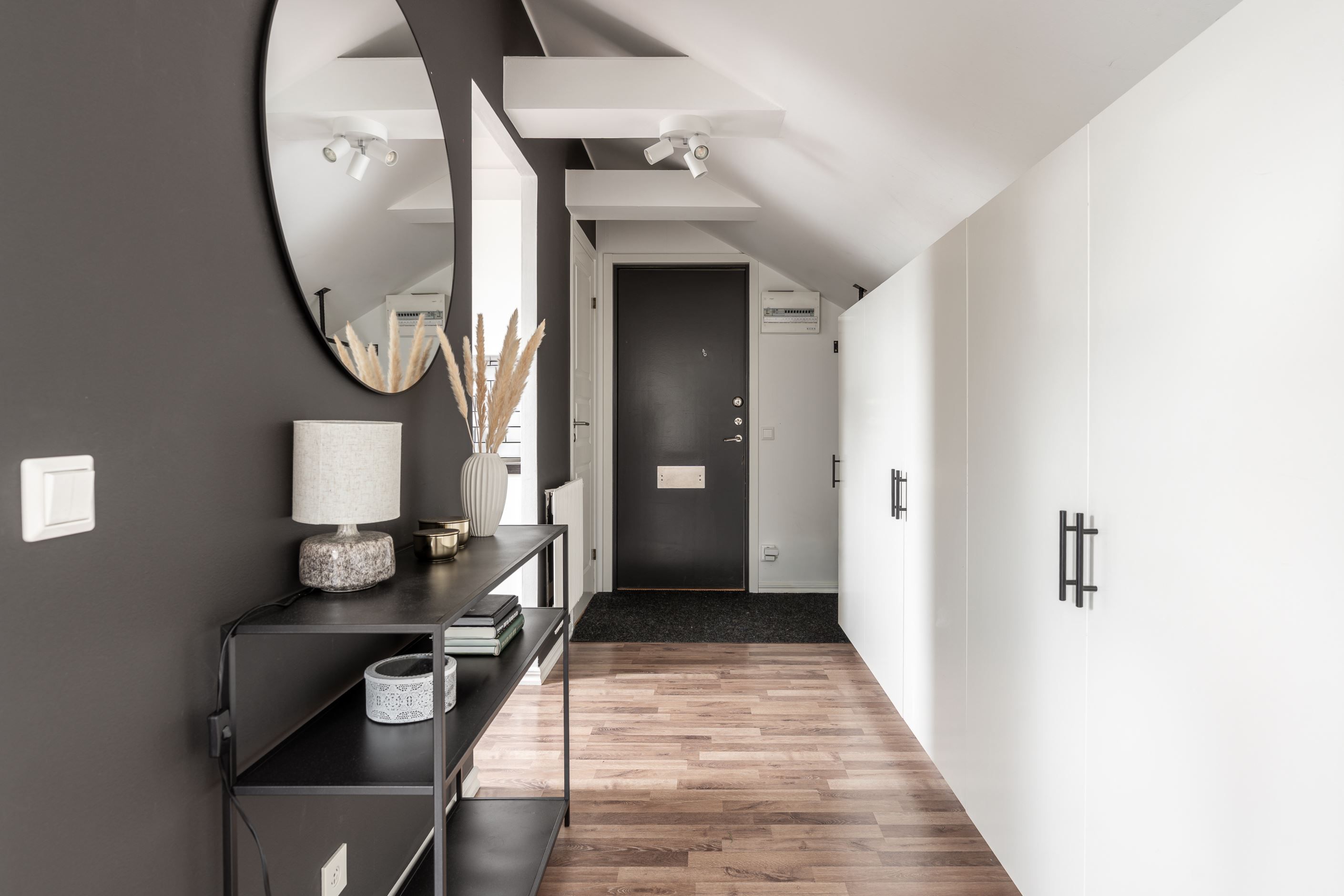 De karaktärsfulla inslagen såsom synliga takbjälkar, vackra snedtak och generösa takfönster ger bostaden både personlighet och ett fint ljusinsläpp som förstärker den luftiga känslan. Den öppna planlösningen mellan kök och allrum skapar en social och rymlig yta som passar perfekt för en välplanerad enrummare.