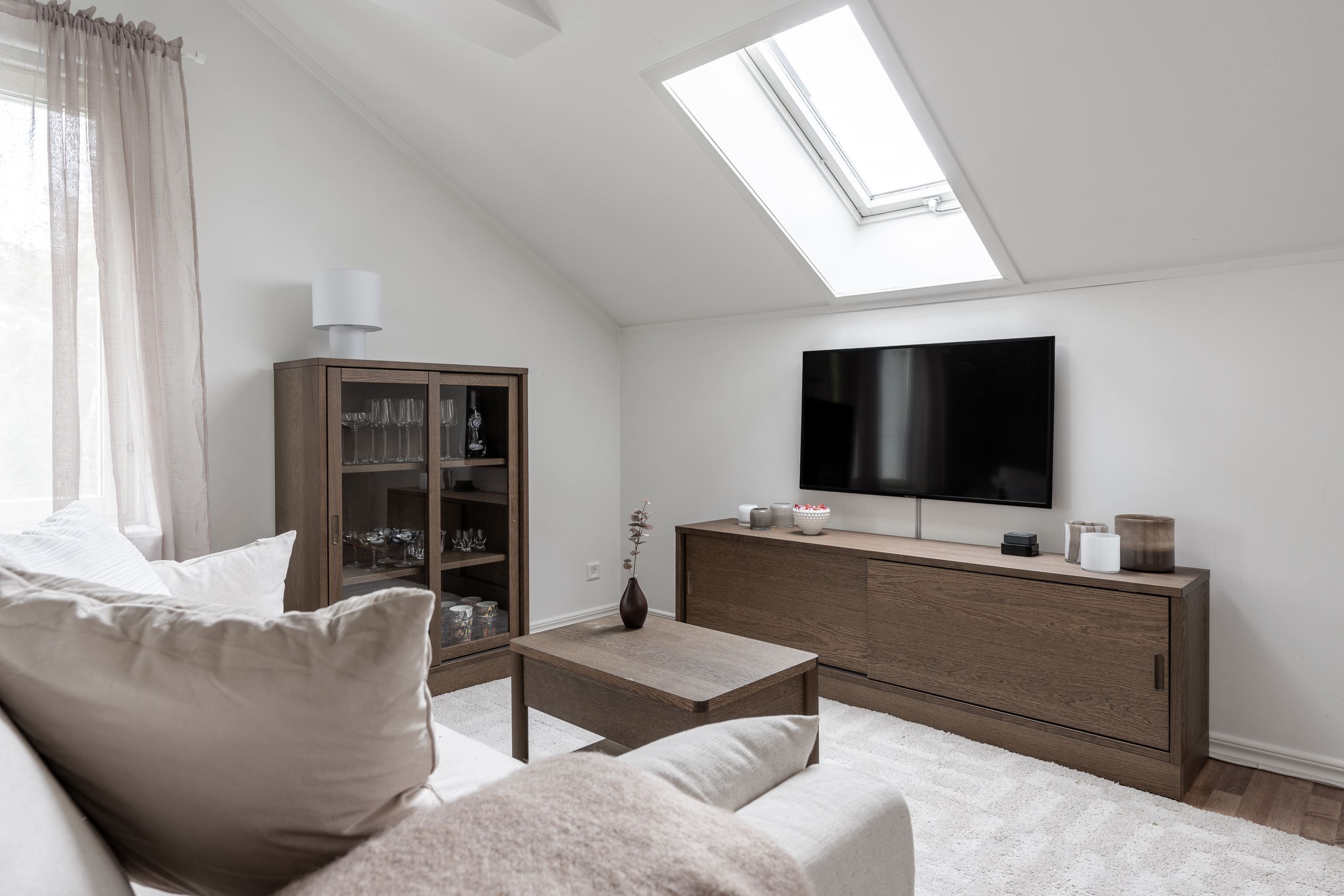 Bostaden har renoverats och erbjuder idag ett stilrent, harmoniskt hem där det bara är att flytta in och börja njuta av tillvaron.