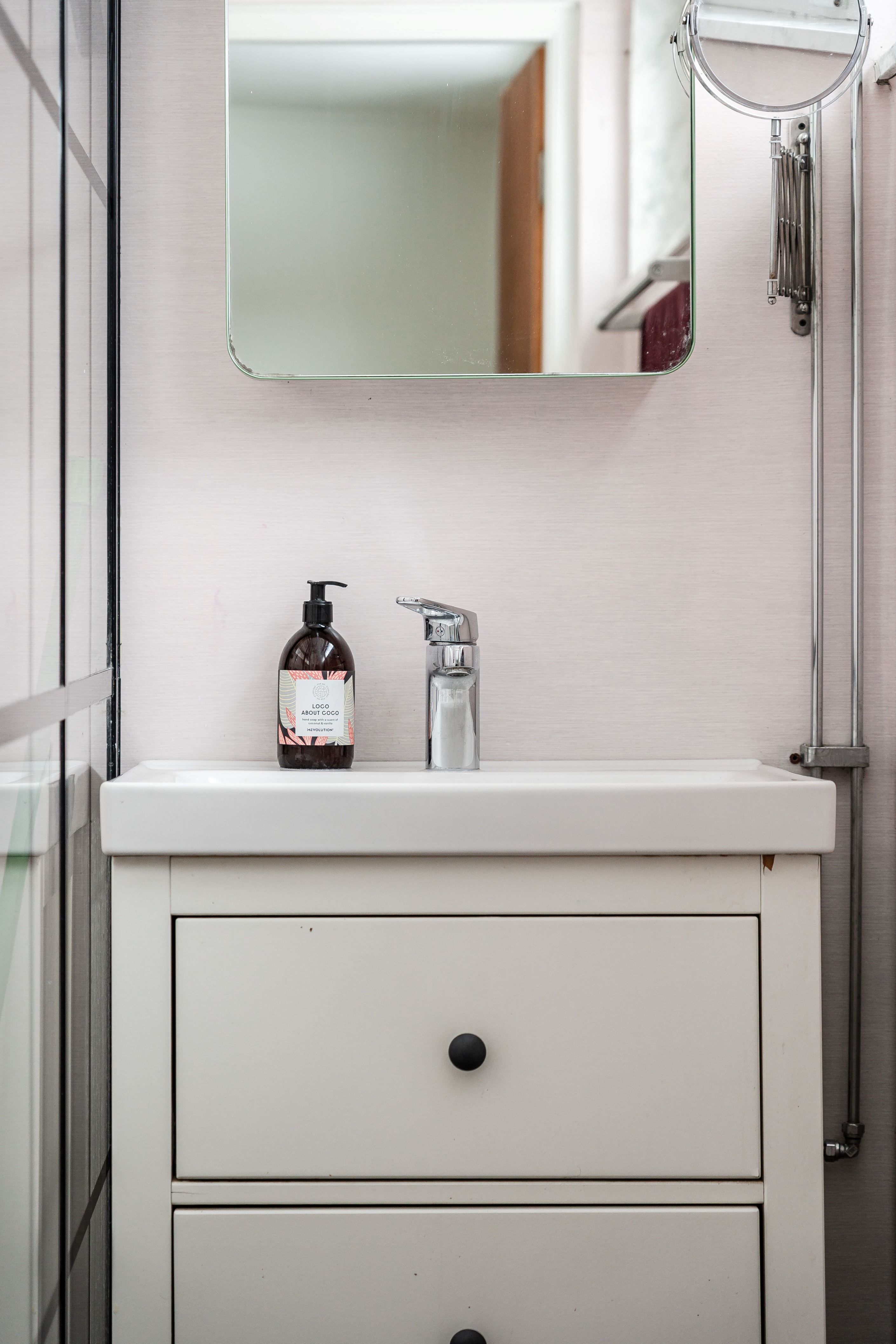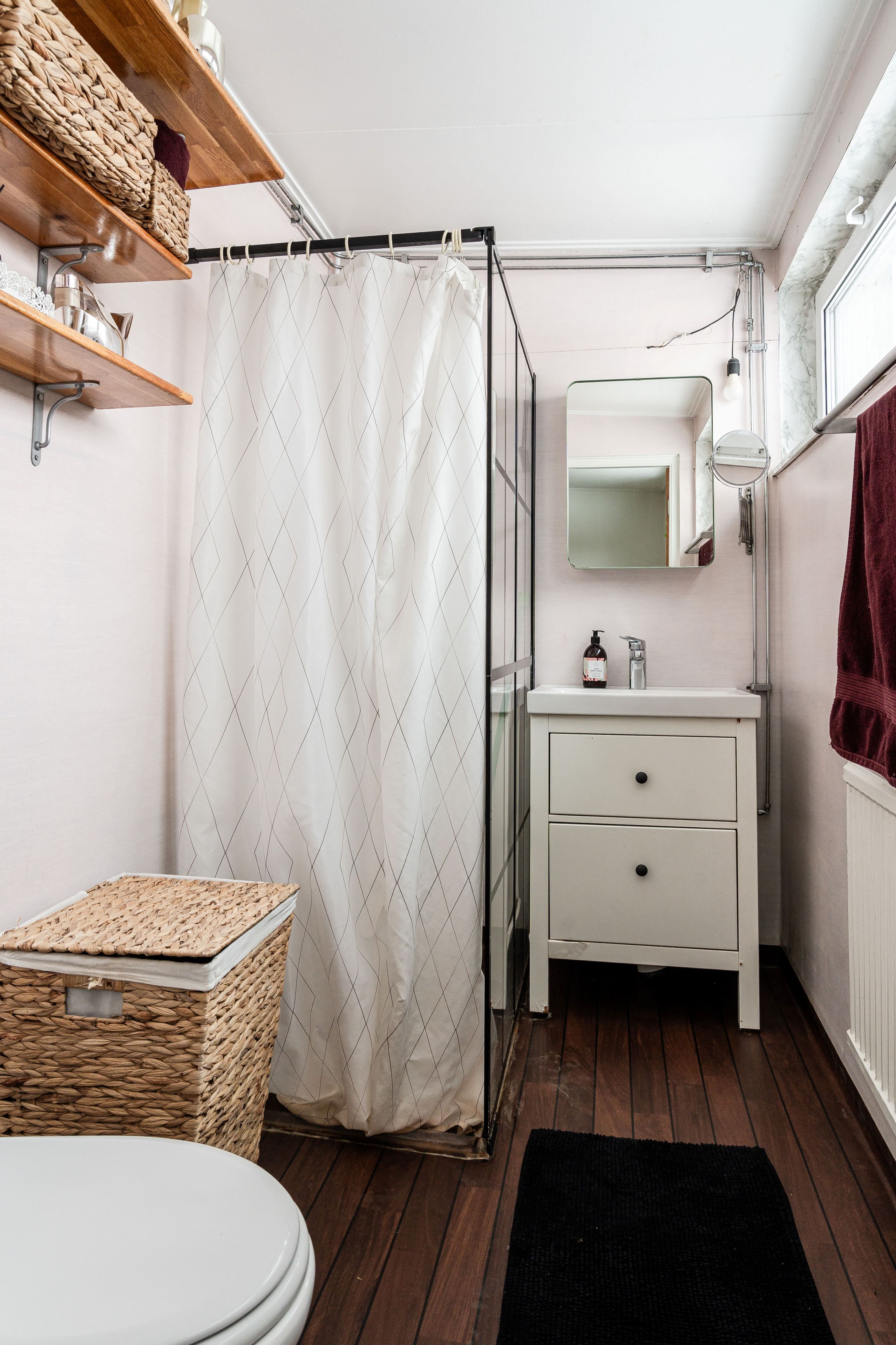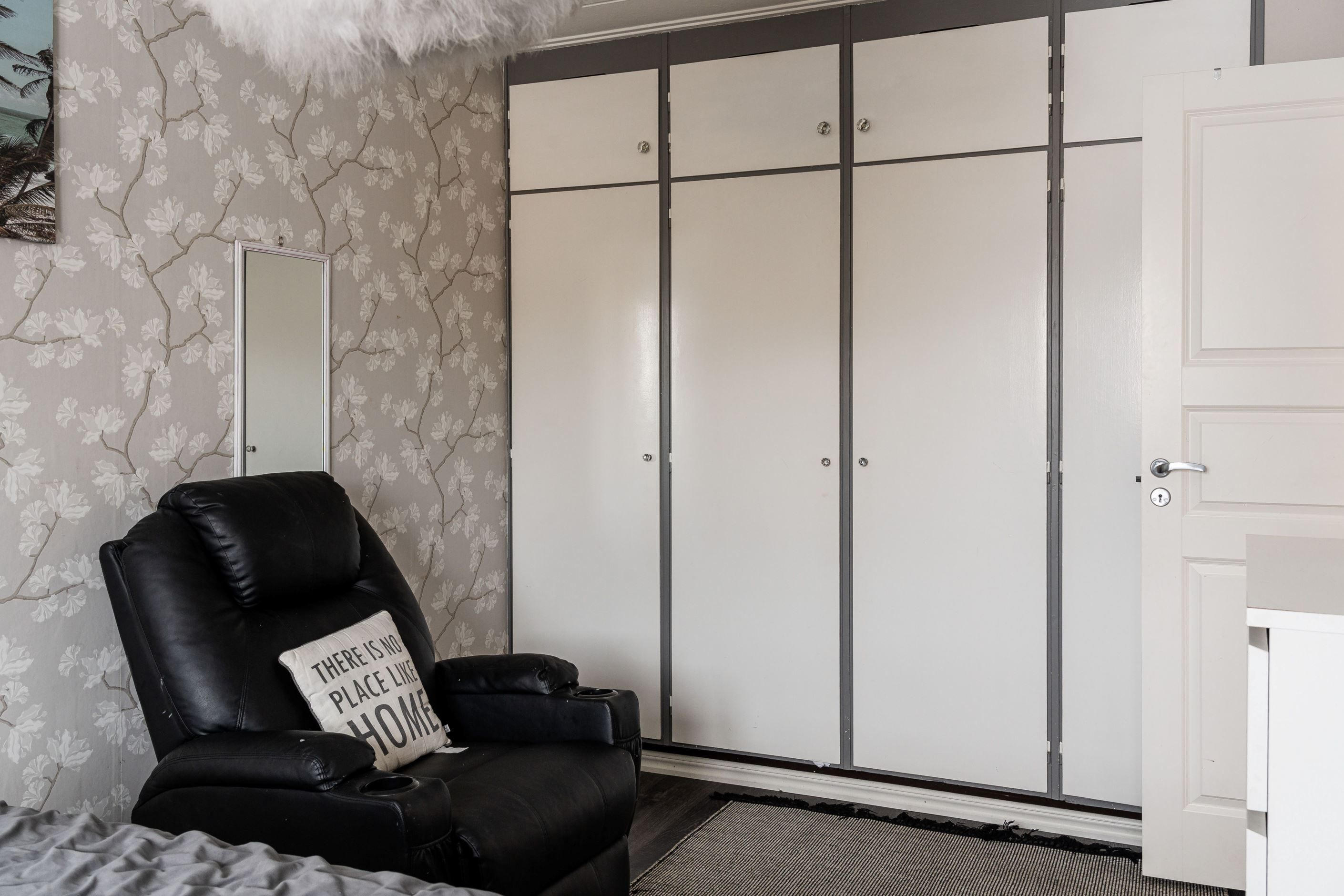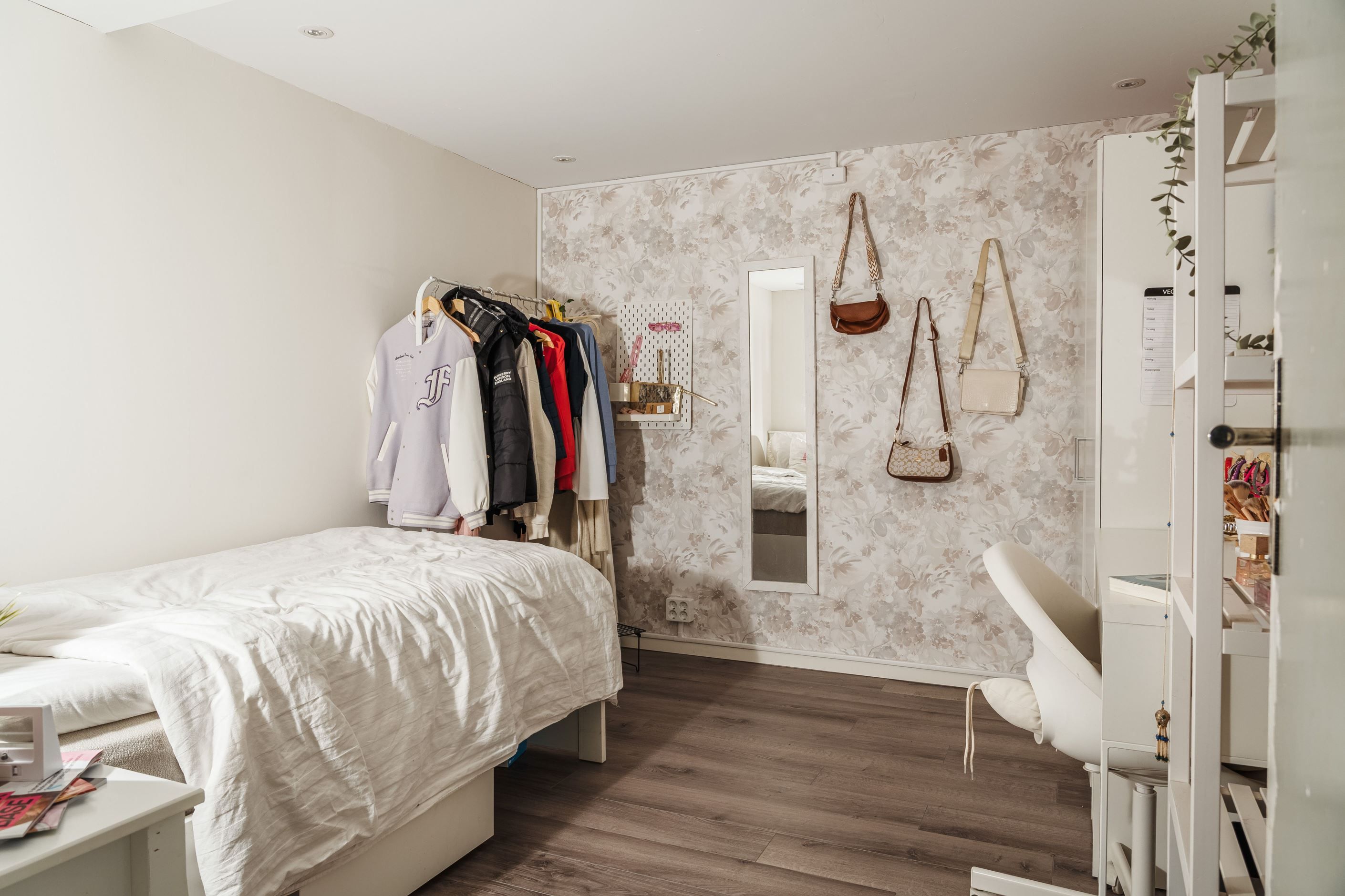 På övre plan möts du av generös takhöjd, två sovrum och ett stilrent badrum med dusch.