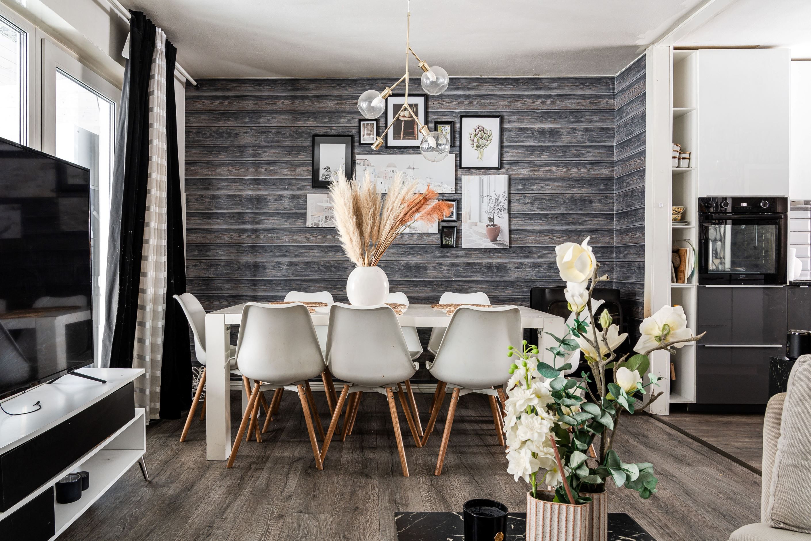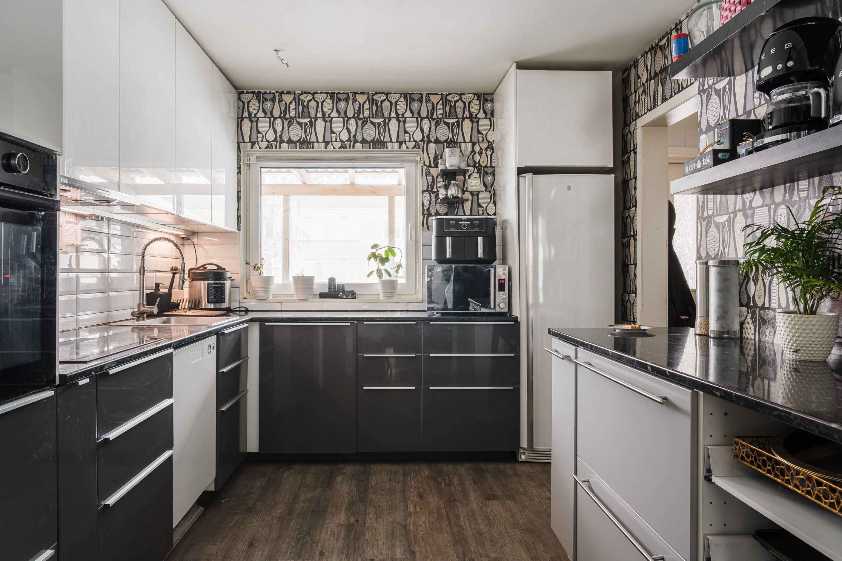 Detta radhus är smart planerat över tre plan. På entréplan möts du av en öppen, ljus och trivsam planlösning som skapar generösa ytor för umgänge och större sällskap. Det renoverade köket ligger i öppen anslutning till vardagsrummet, vilket ger en social och inbjudande atmosfär. Vardagsrummet har ett härligt ljusinsläpp från de stora fönsterna och de två helglasade balkongdörrar. Braskaminen sprider värme och mys under årets kallare dagar. Härifrån når du den inglasade altanen med anslutande trädäck, en perfekt plats att njuta av solen från förmiddag till tidig kväll.