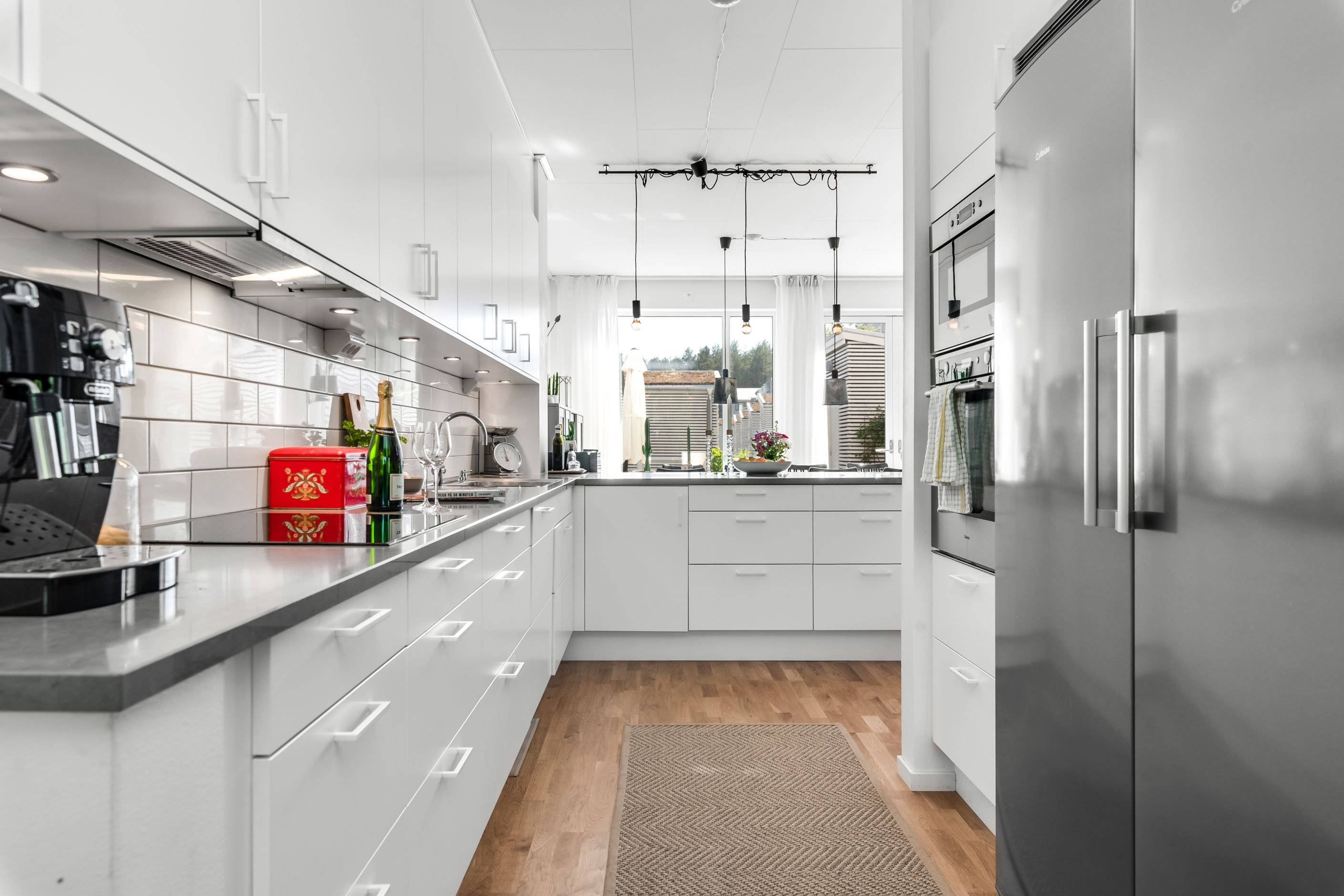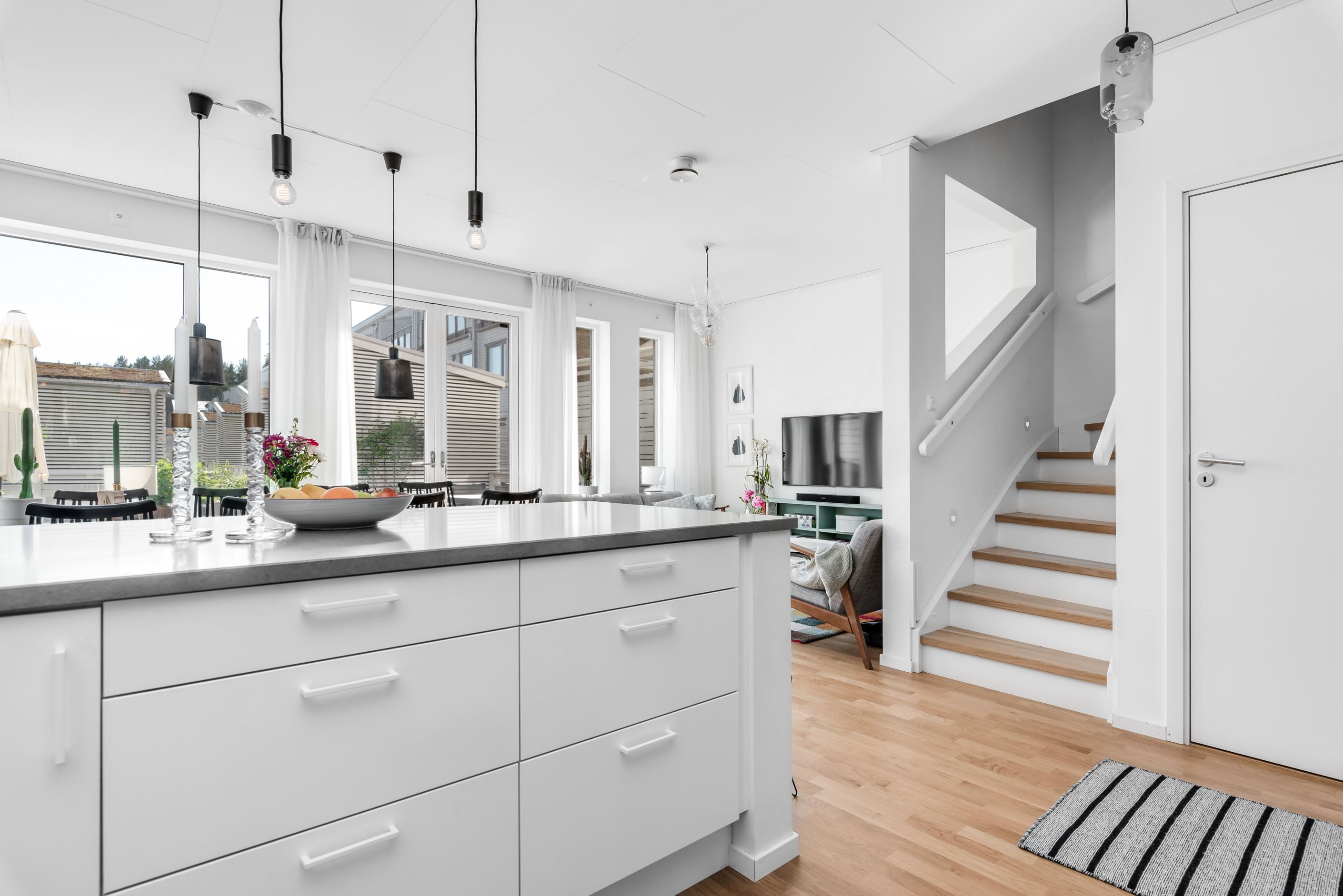 Välkommen till Mjölkudden och detta moderna stadsradhus om 164 m2 med totalt tre uteplatser.
