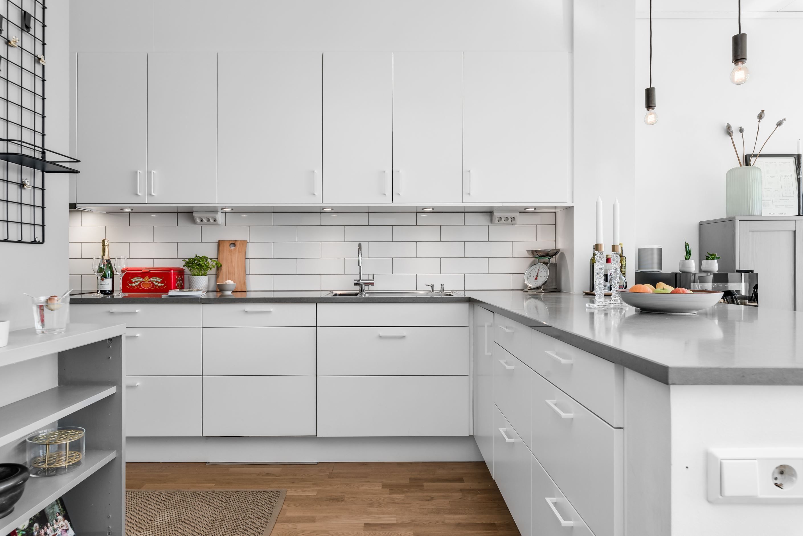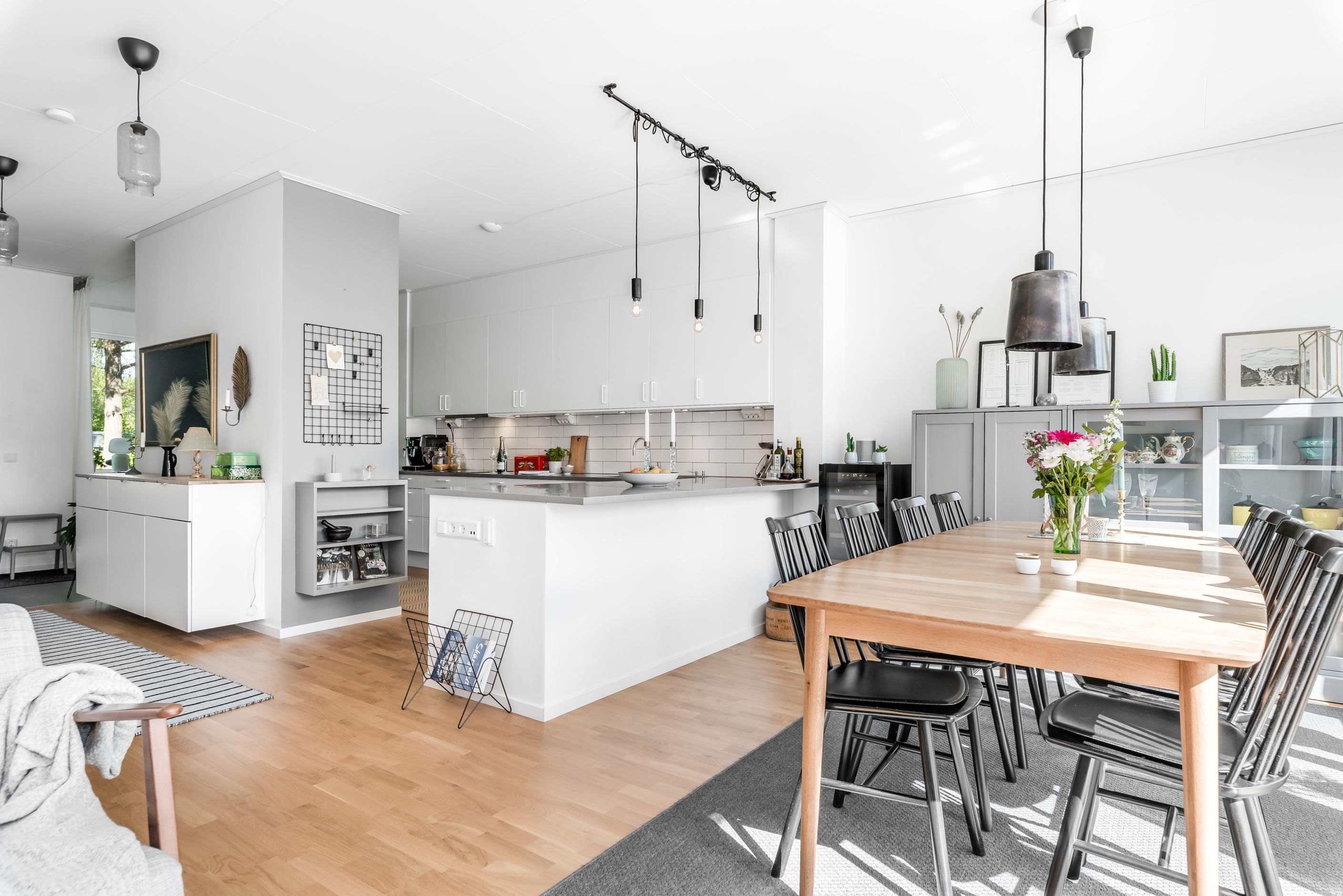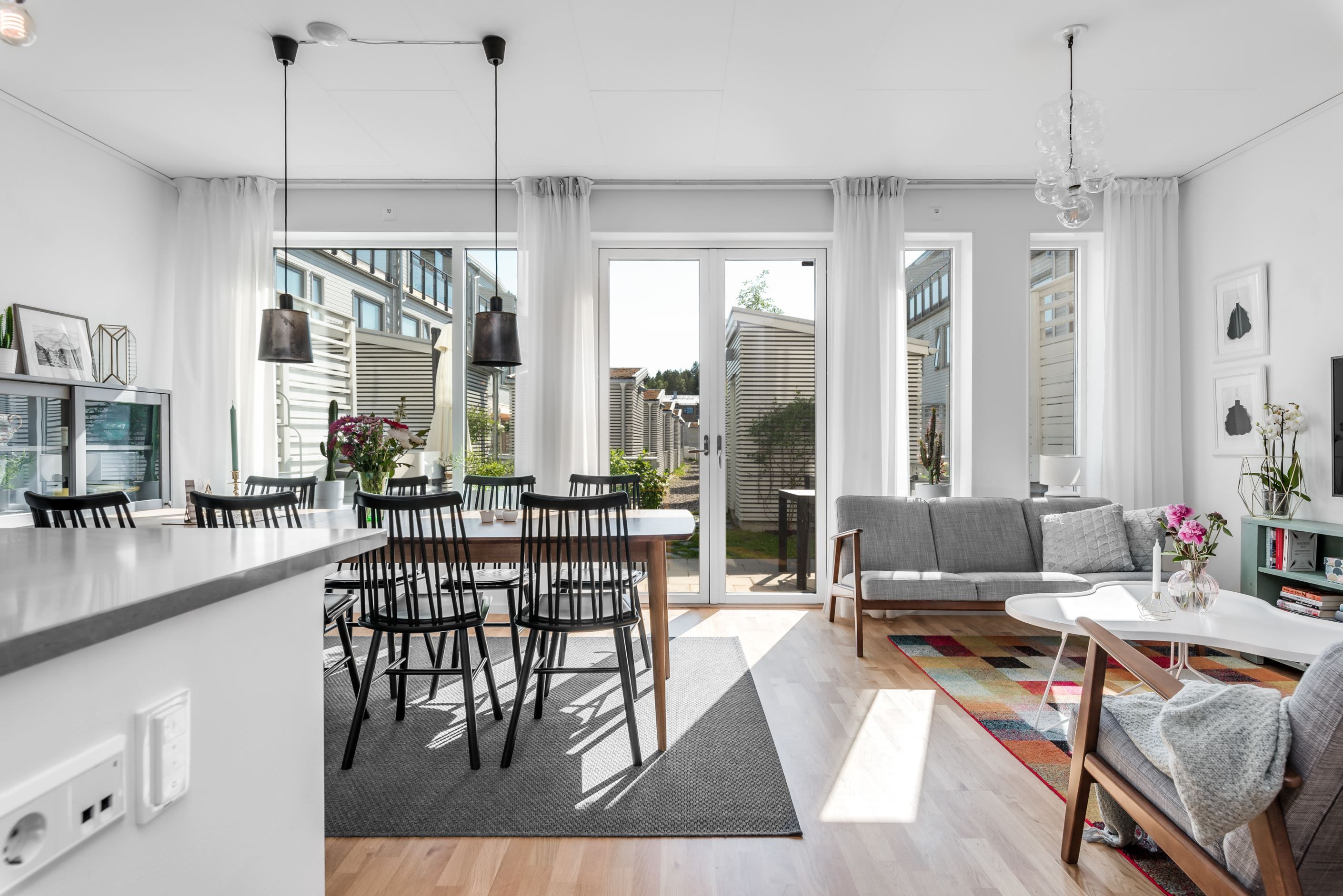 Hela bostaden andas ljus och rymd med dess stora fönsterpartier, höga takhöjd och ljusa färgsättning.