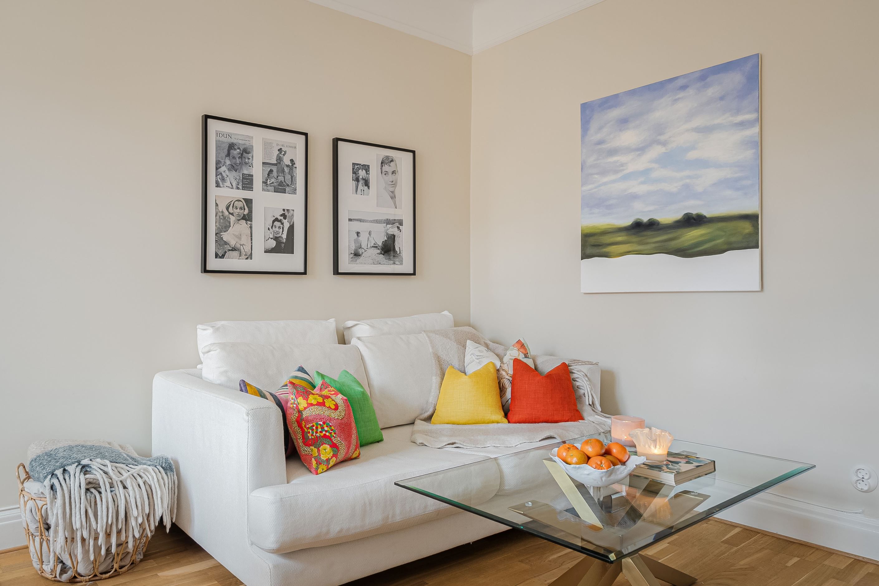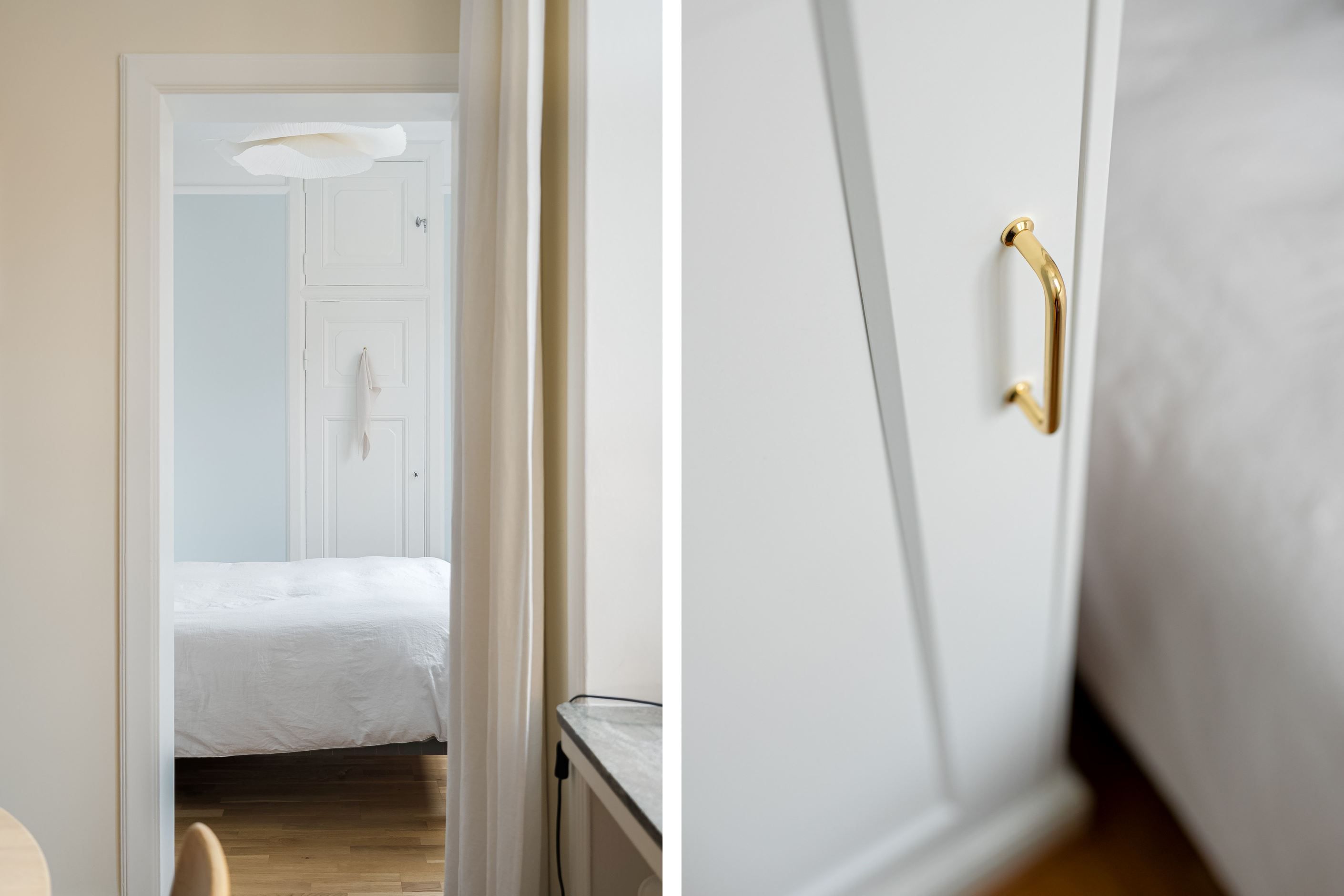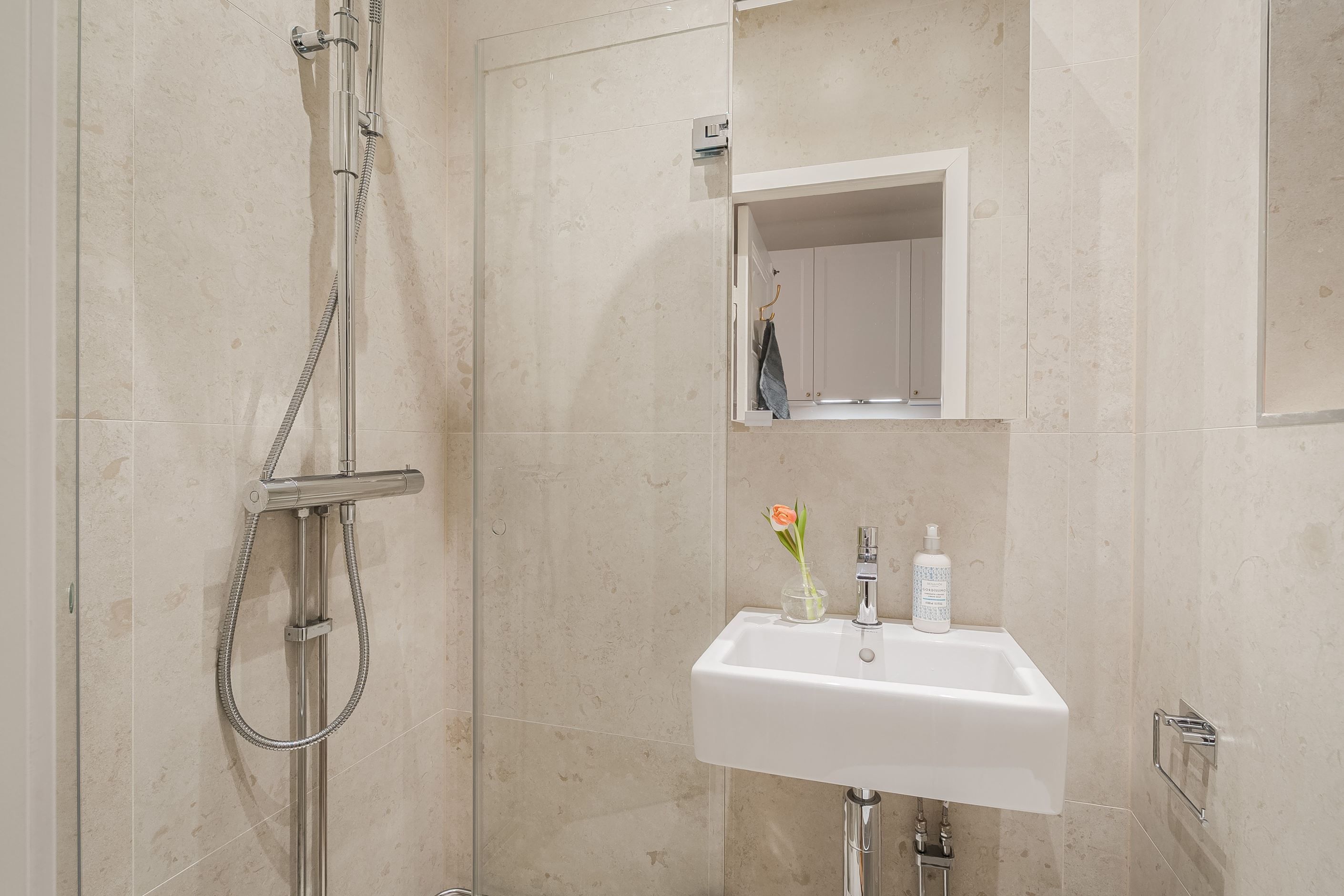 Lägenheten präglas av stilrena och genomgående materialval, där köket är byggt i klassisk shakerstil och badrummet präglas av stora kakelplattor i glaskeramik med vackert stenmönster. Den öppna planlösningen mot sällskapsrummet skapar en luftig och social atmosfär med gott om plats för både soffgrupp och matbord. Här finns också tillgång till klädkammare/förråd. Sovrummet är väl tilltaget och rymmer enkelt dubbelsäng samt erbjuder utmärkt förvaring genom platsbyggda garderober och en rymlig klädkammare.