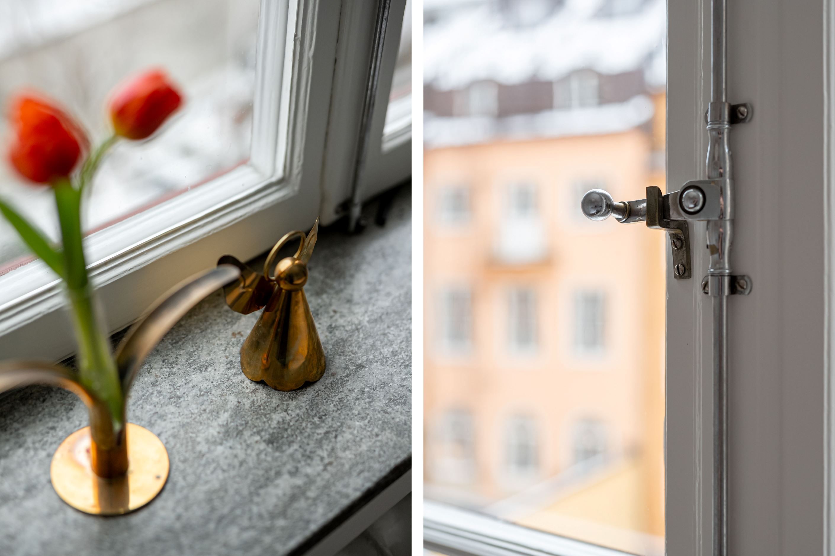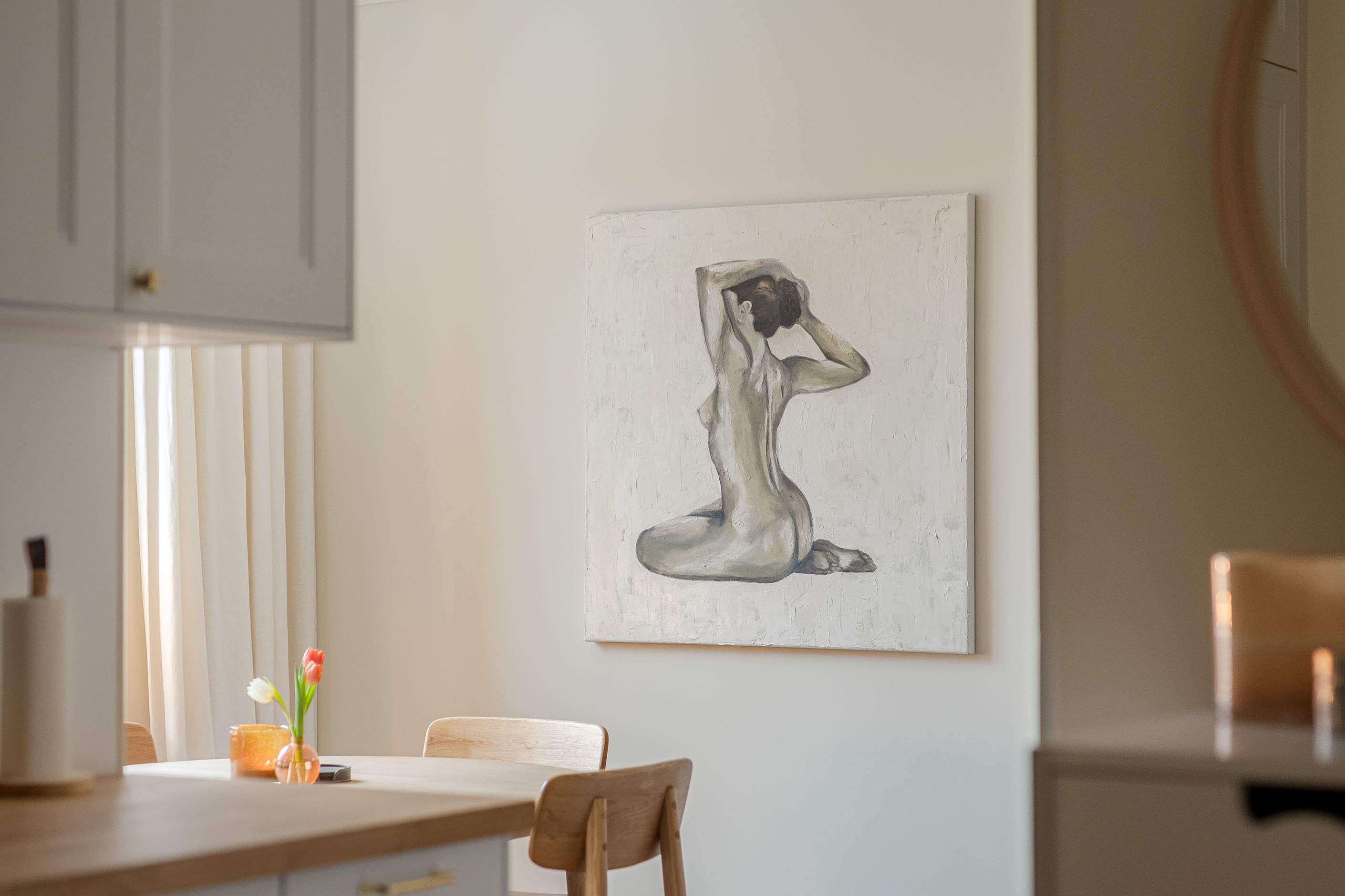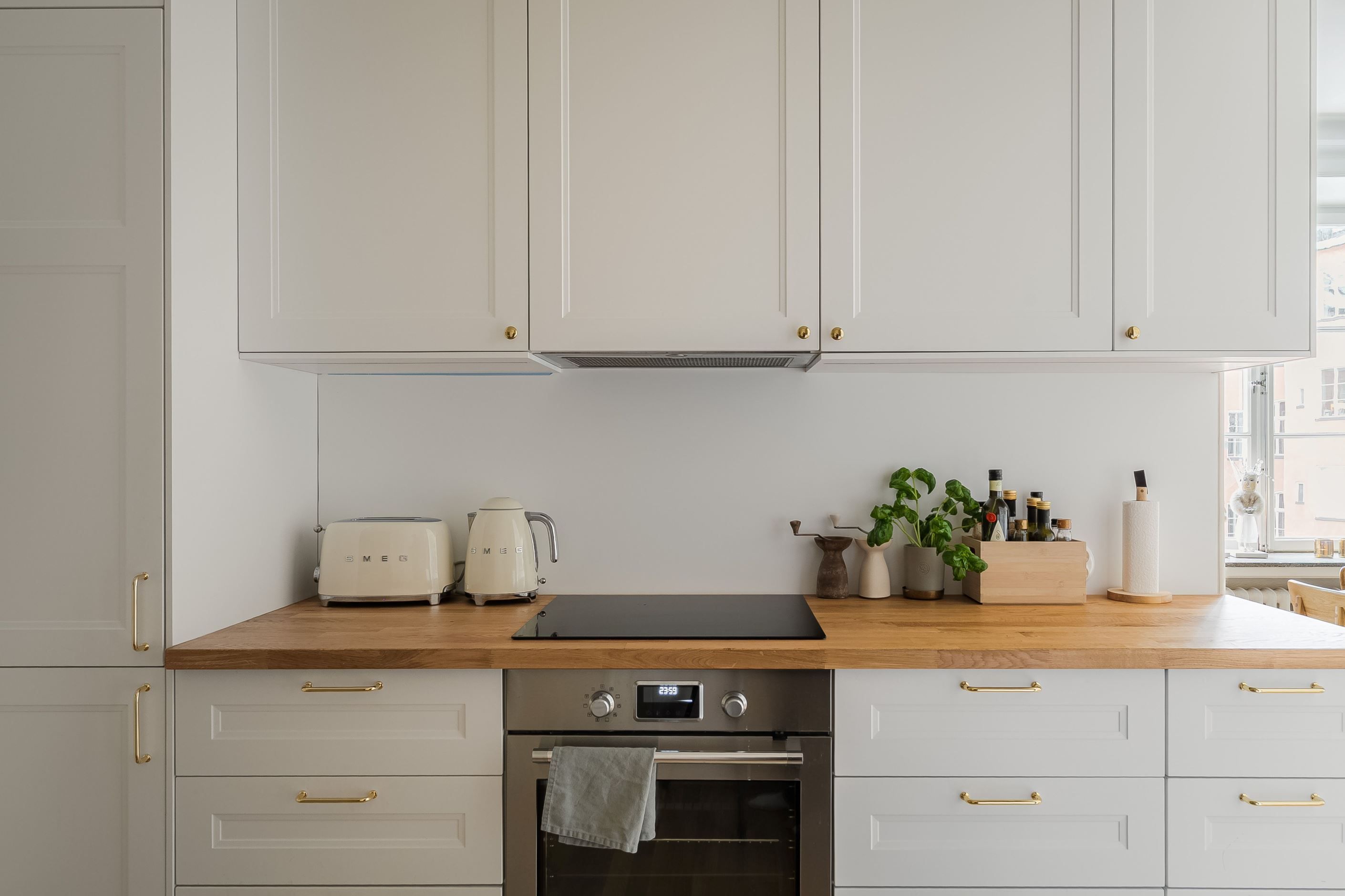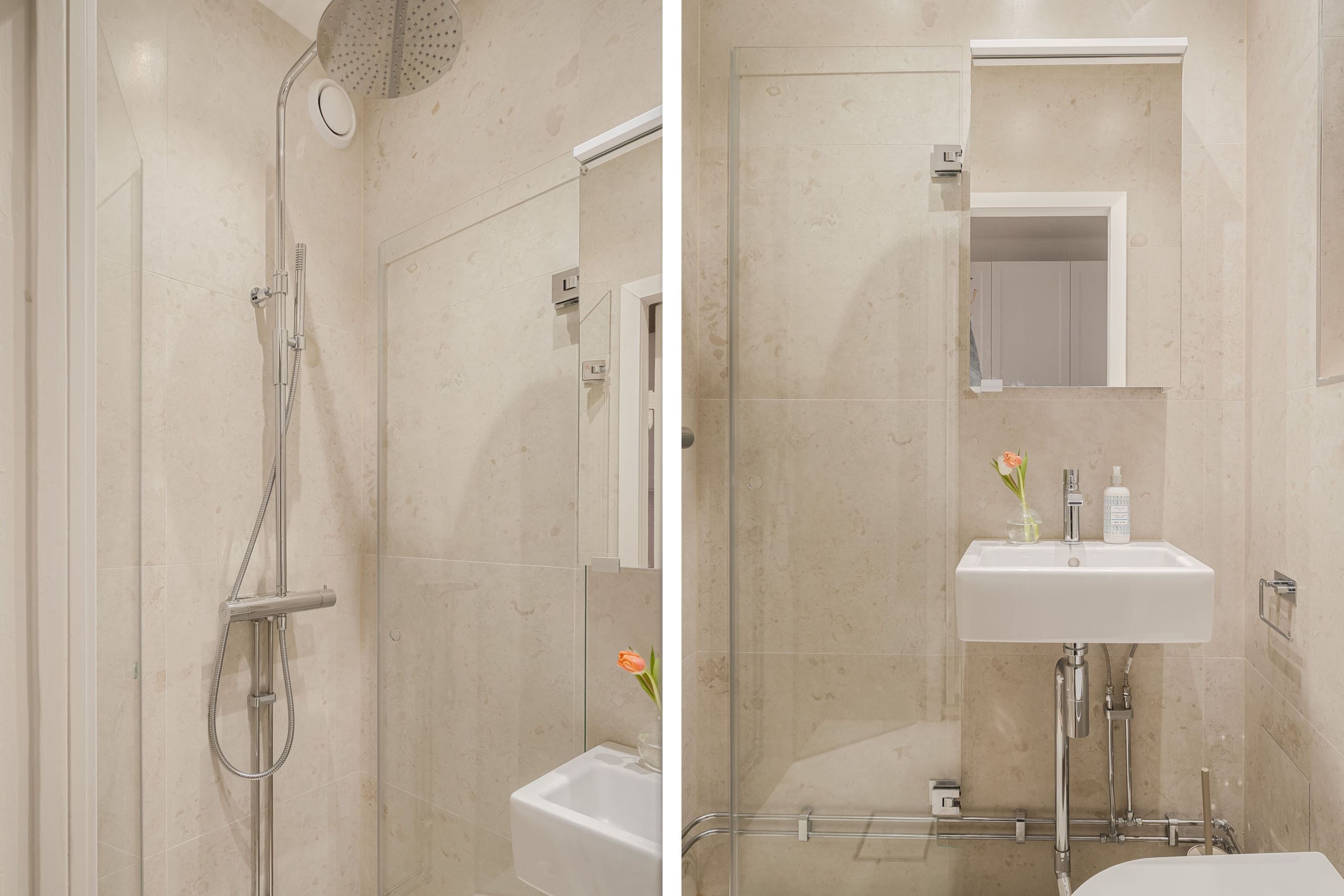 Lägenheten präglas av stilrena och genomgående materialval, där köket är byggt i klassisk shakerstil och badrummet präglas av stora kakelplattor i glaskeramik med vackert stenmönster. Den öppna planlösningen mot sällskapsrummet skapar en luftig och social atmosfär med gott om plats för både soffgrupp och matbord. Här finns också tillgång till klädkammare/förråd. Sovrummet är väl tilltaget och rymmer enkelt dubbelsäng samt erbjuder utmärkt förvaring genom platsbyggda garderober och en rymlig klädkammare.