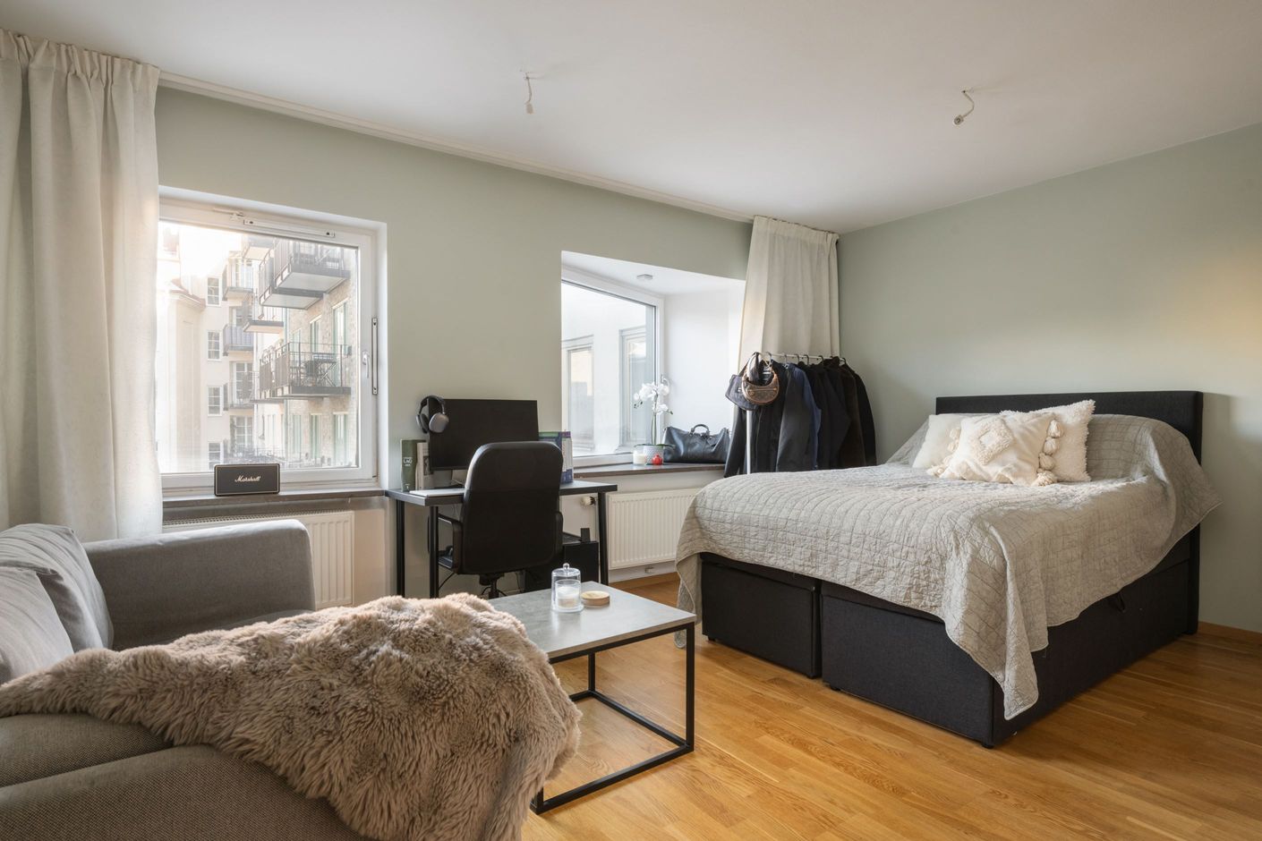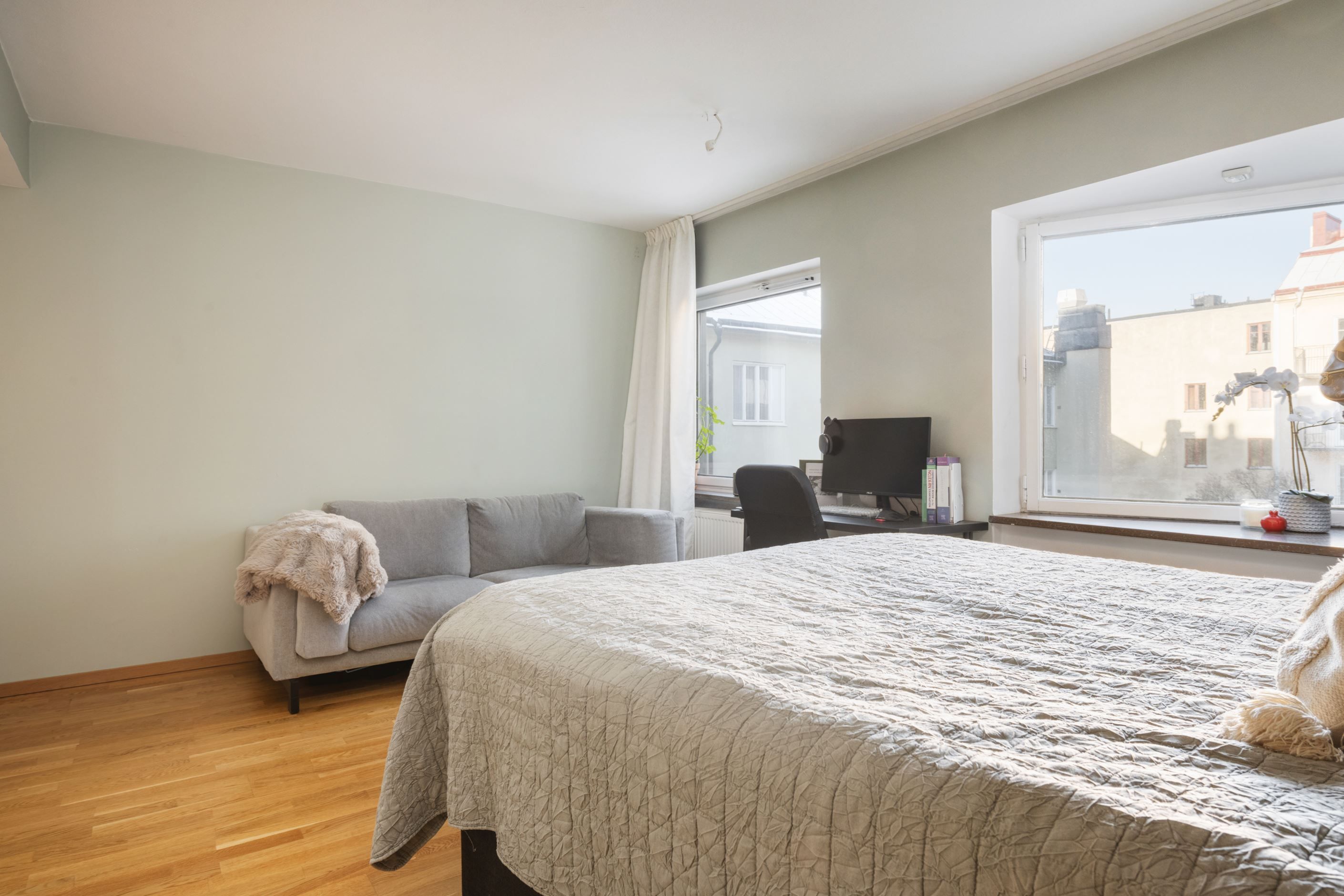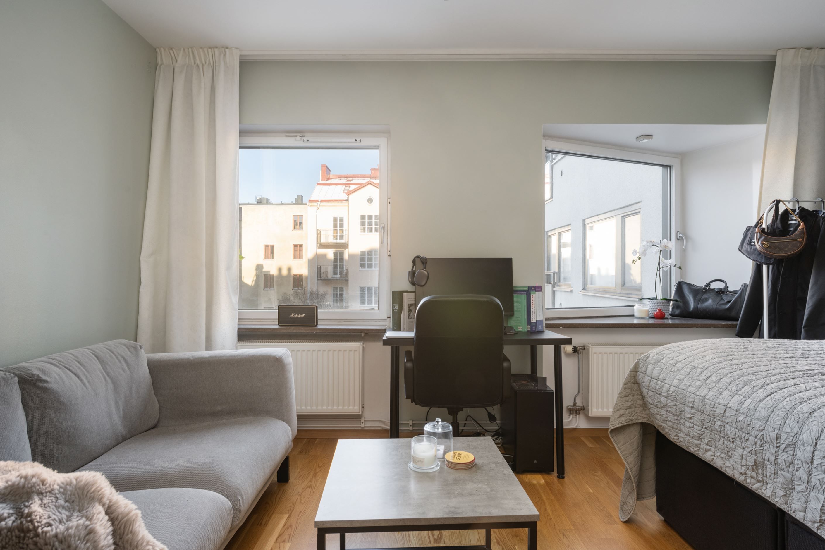 Stilrena och funktionella materialval genomsyrar bostaden, från inredning till ytskikt och det stora fönsterpartiet ger ett underbart ljusinsläpp. Genomgående trägolv skapar en varm och enhetlig känsla. Smakfullt badrum, säng med praktisk förvaring undertill samt ett ändamålsenligt, platsbyggt kök som har maskinell utrustning i form av kyl, ugn, spis, diskho och tvättmaskin. Här erbjuds kompakt boende när det är som bäst. Dessa egenskaper är endast ett smakprov på vad som gör denna bostad till en oöverträfflig studiolägenhet.