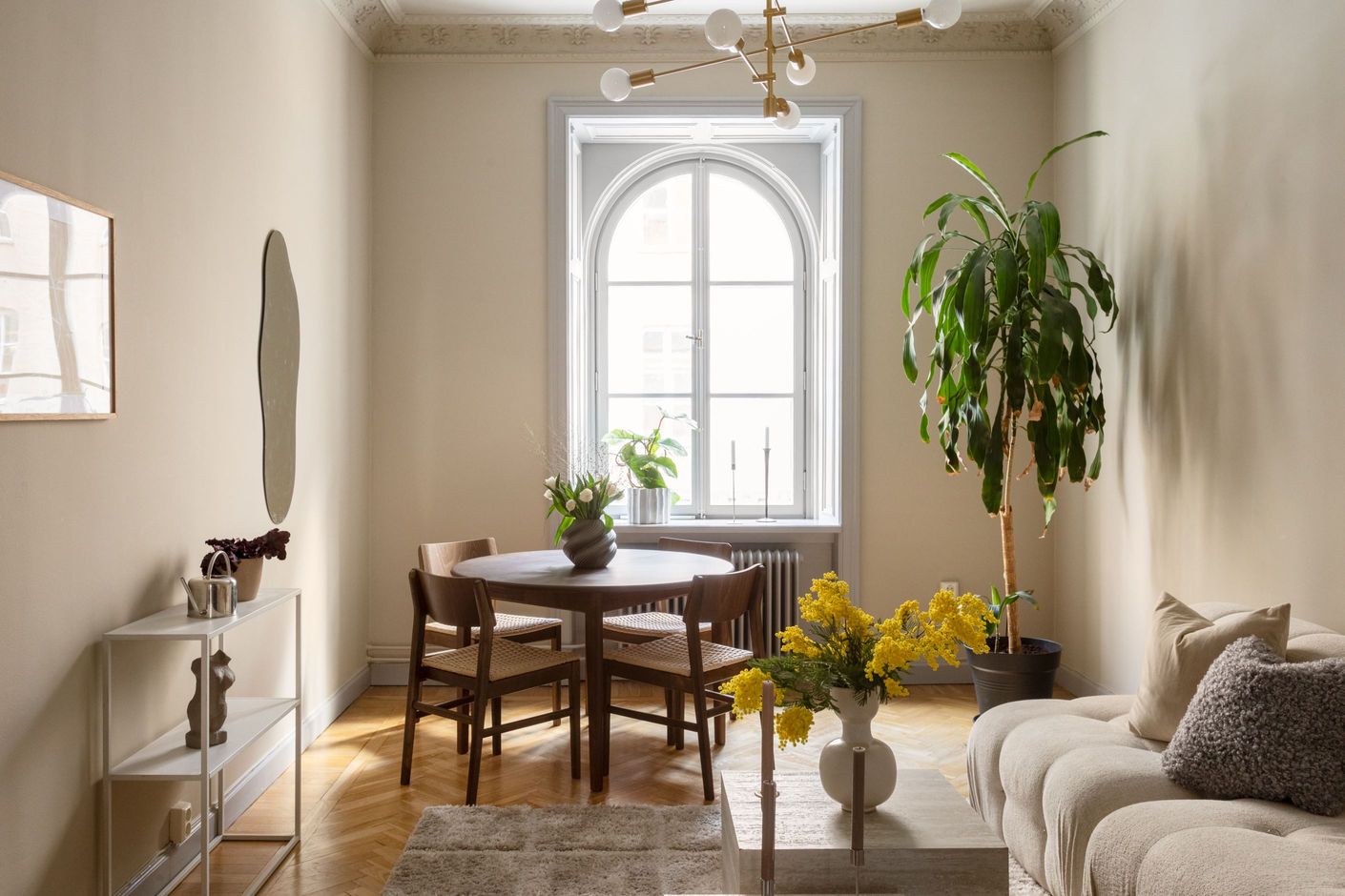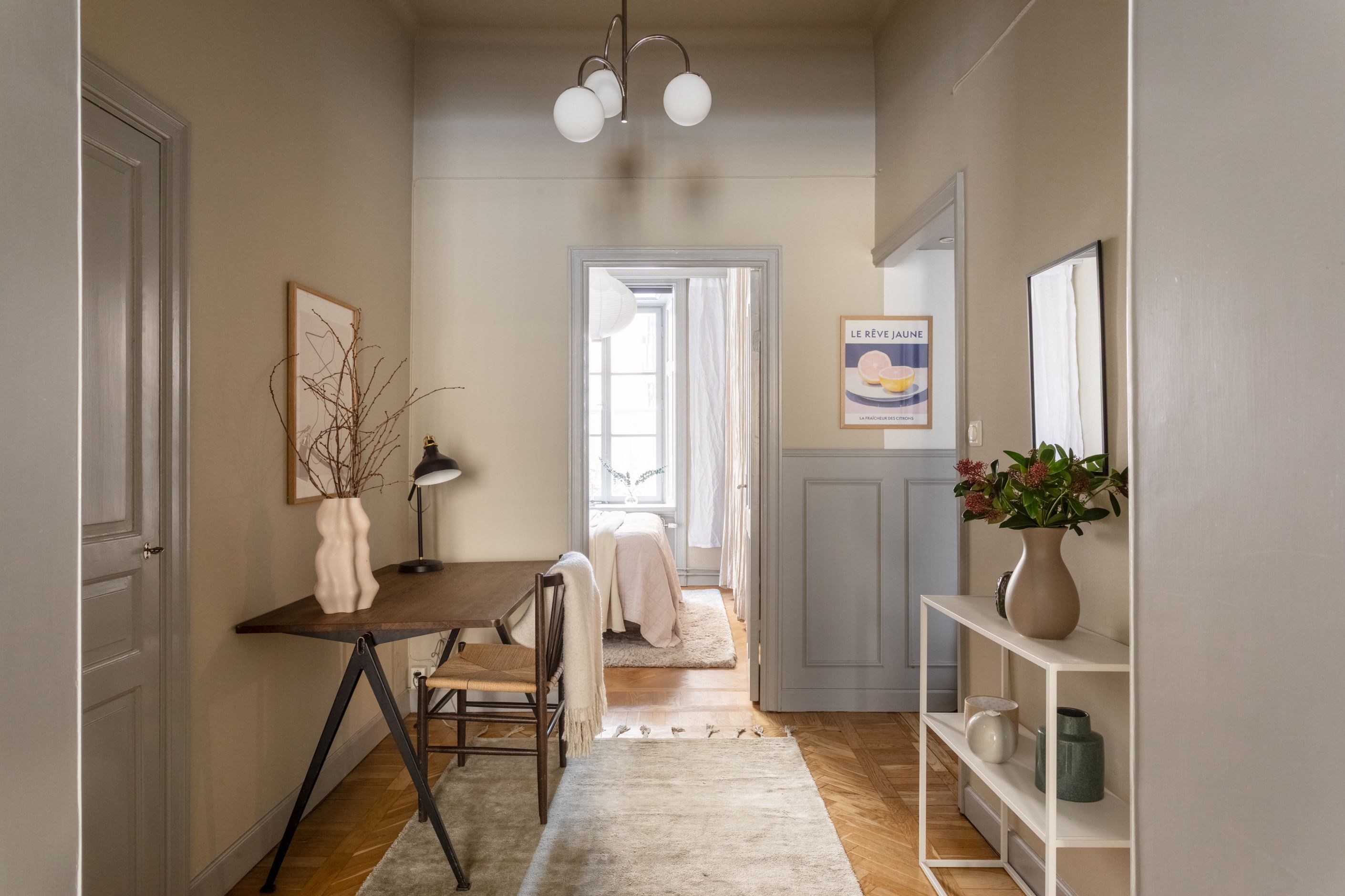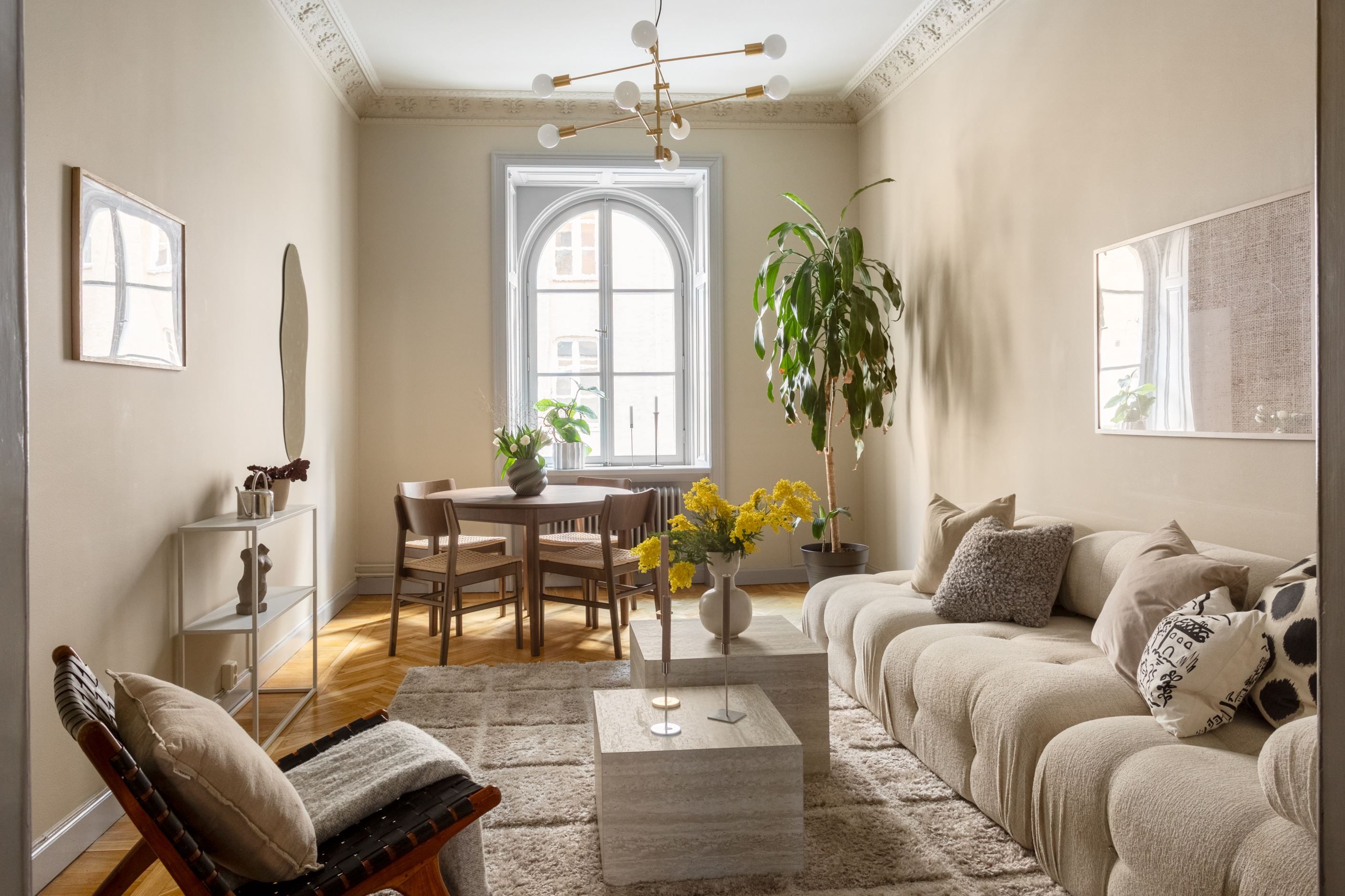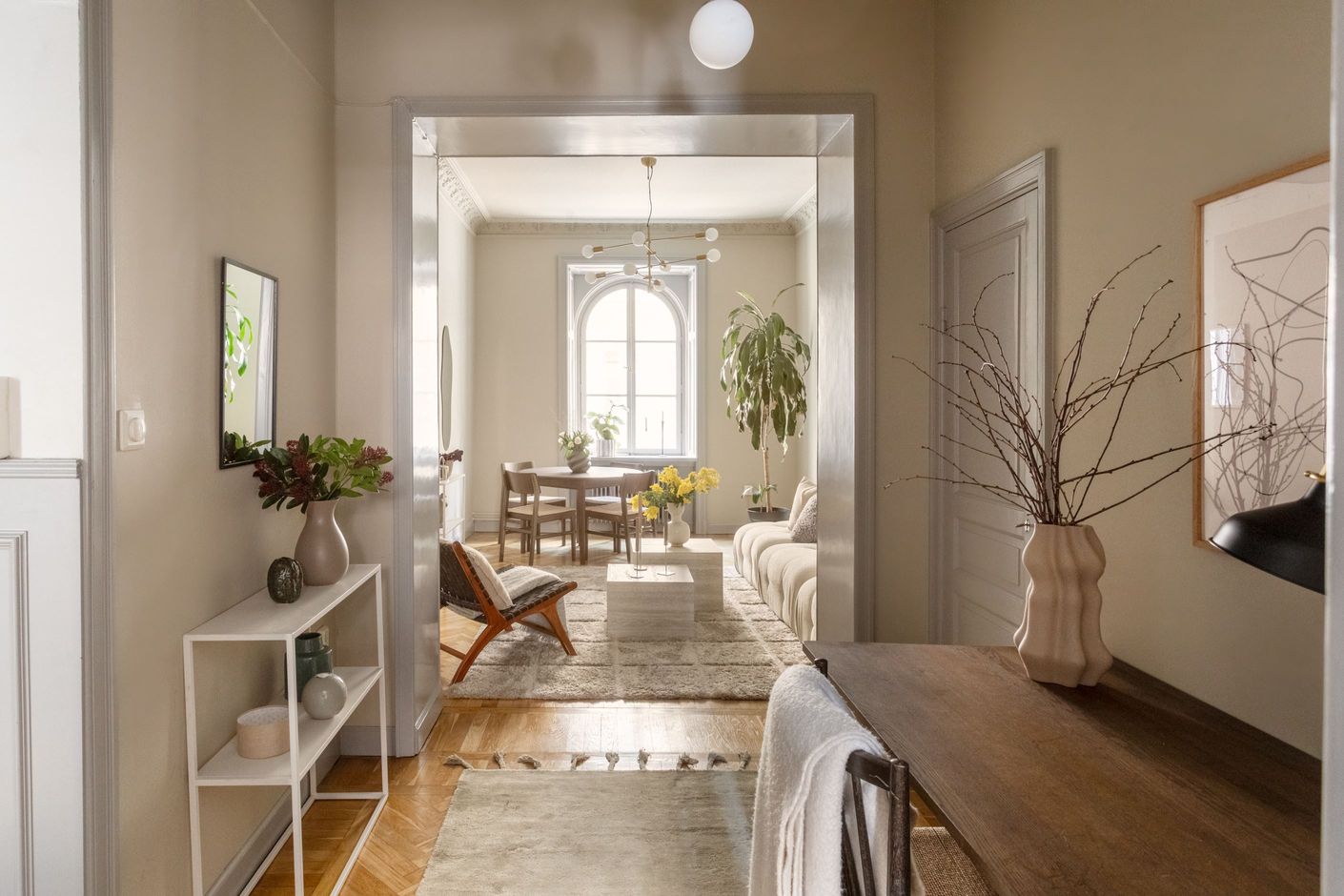 Varmt välkomna till denna välplanerade sekelskiftestrea! Här erbjuds charmiga detaljer såsom en otrolig takhöjd, vackra stuckaturer och snickerier samt stora spröjsade fönster. Genomgående vackra parkettgolv och en perfekt planlösning med stort vardagsrum och två utmärkta sovrum som är belägna i lugnt läge mot föreningens innergård. Bostaden har väldigt goda förvaringsmöjligheter med flera garderober och skåp där takhöjden nyttjas till fullo. Lägenheten ligger på en halv trappa upp och därmed i ett insynsskyddat läge från gatan.