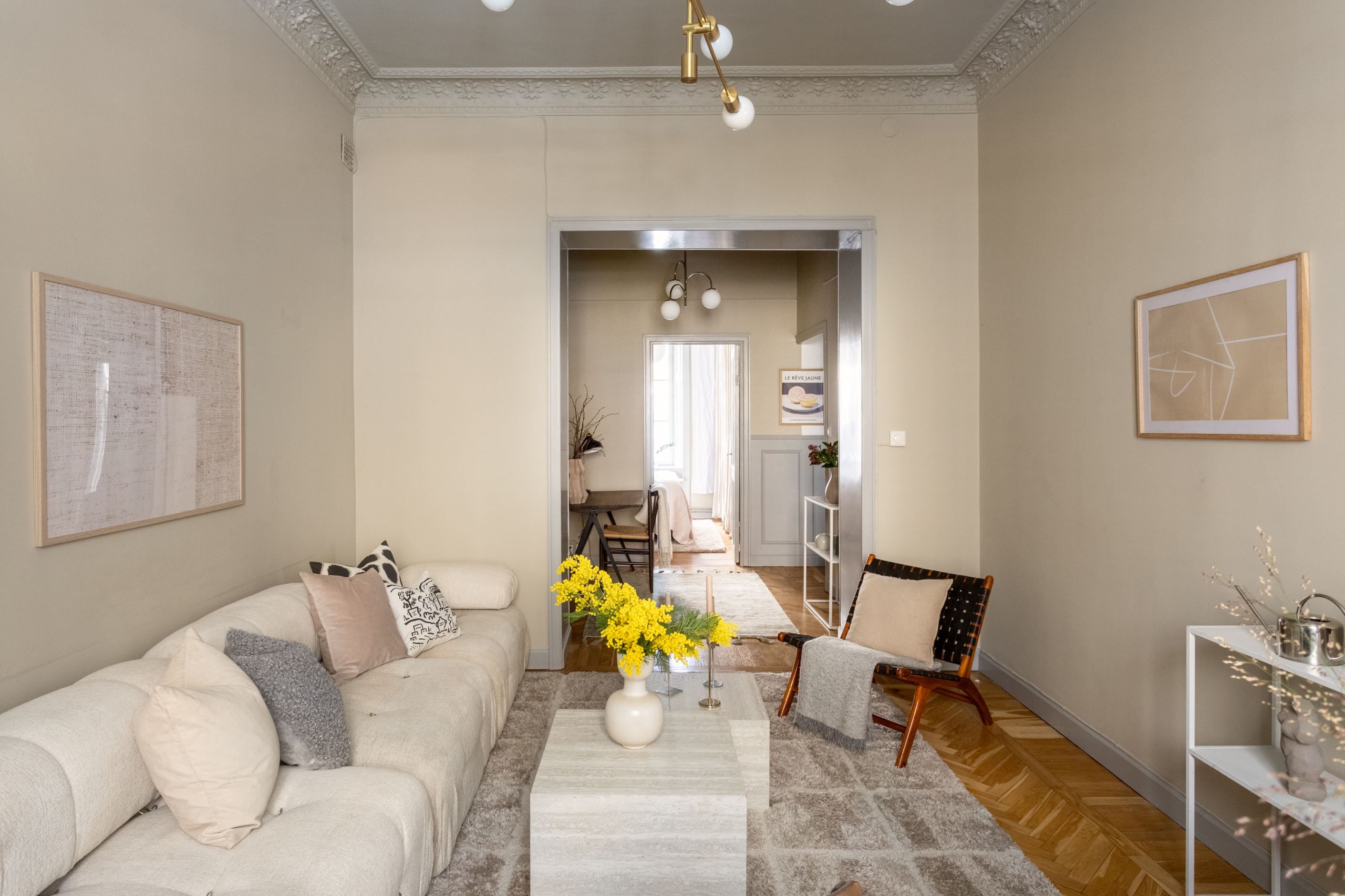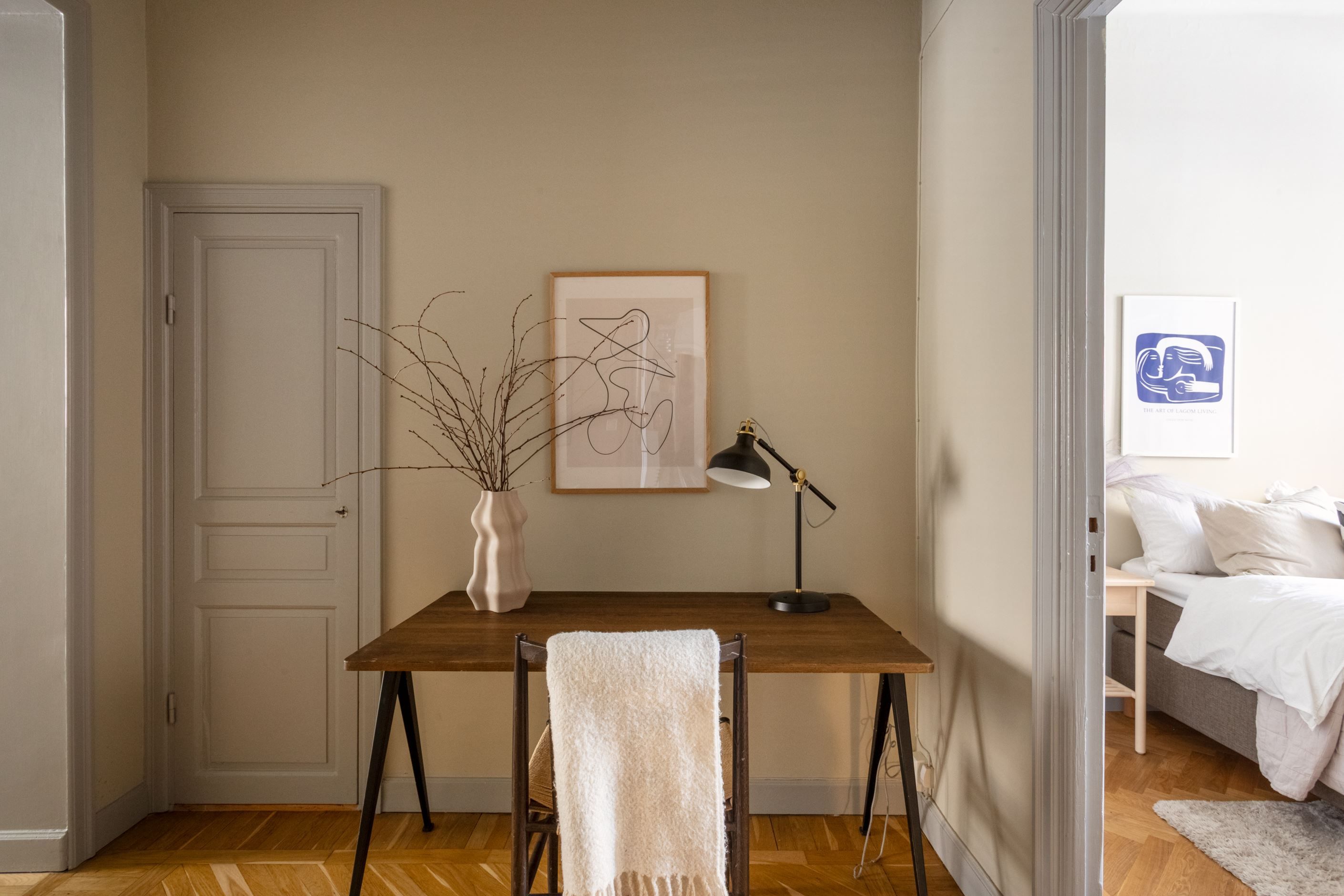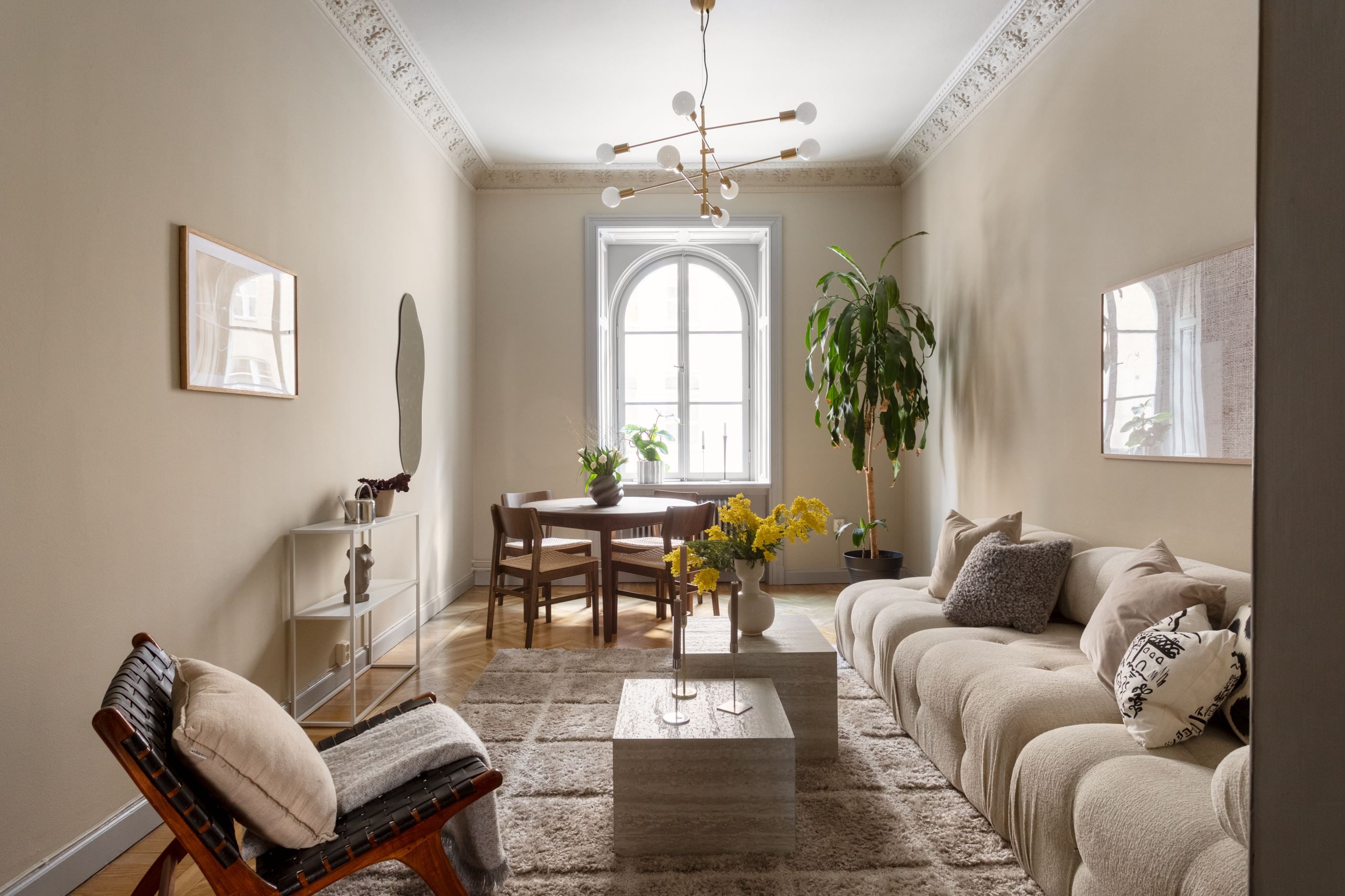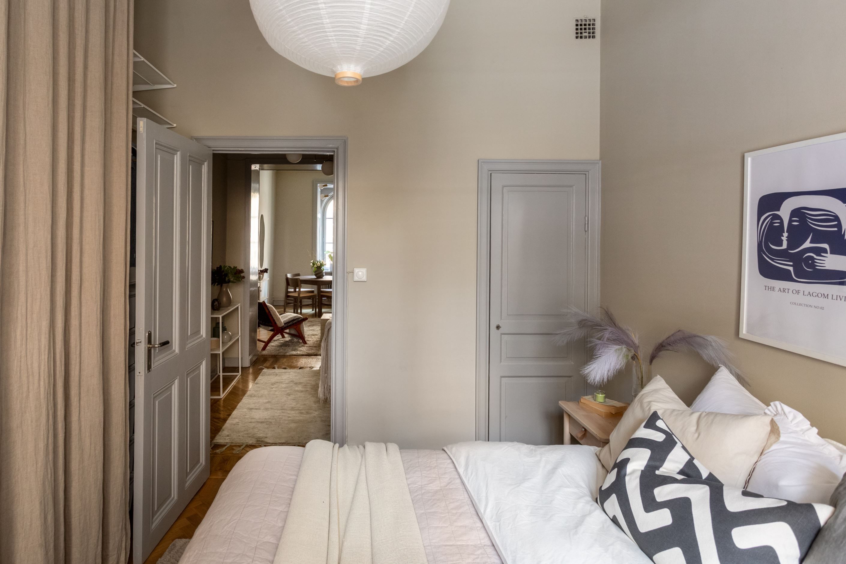 Varmt välkomna till denna välplanerade sekelskiftestrea! Här erbjuds charmiga detaljer såsom en otrolig takhöjd, vackra stuckaturer och snickerier samt stora spröjsade fönster. Genomgående vackra parkettgolv och en perfekt planlösning med stort vardagsrum och två utmärkta sovrum som är belägna i lugnt läge mot föreningens innergård. Bostaden har väldigt goda förvaringsmöjligheter med flera garderober och skåp där takhöjden nyttjas till fullo. Lägenheten ligger på en halv trappa upp och därmed i ett insynsskyddat läge från gatan.