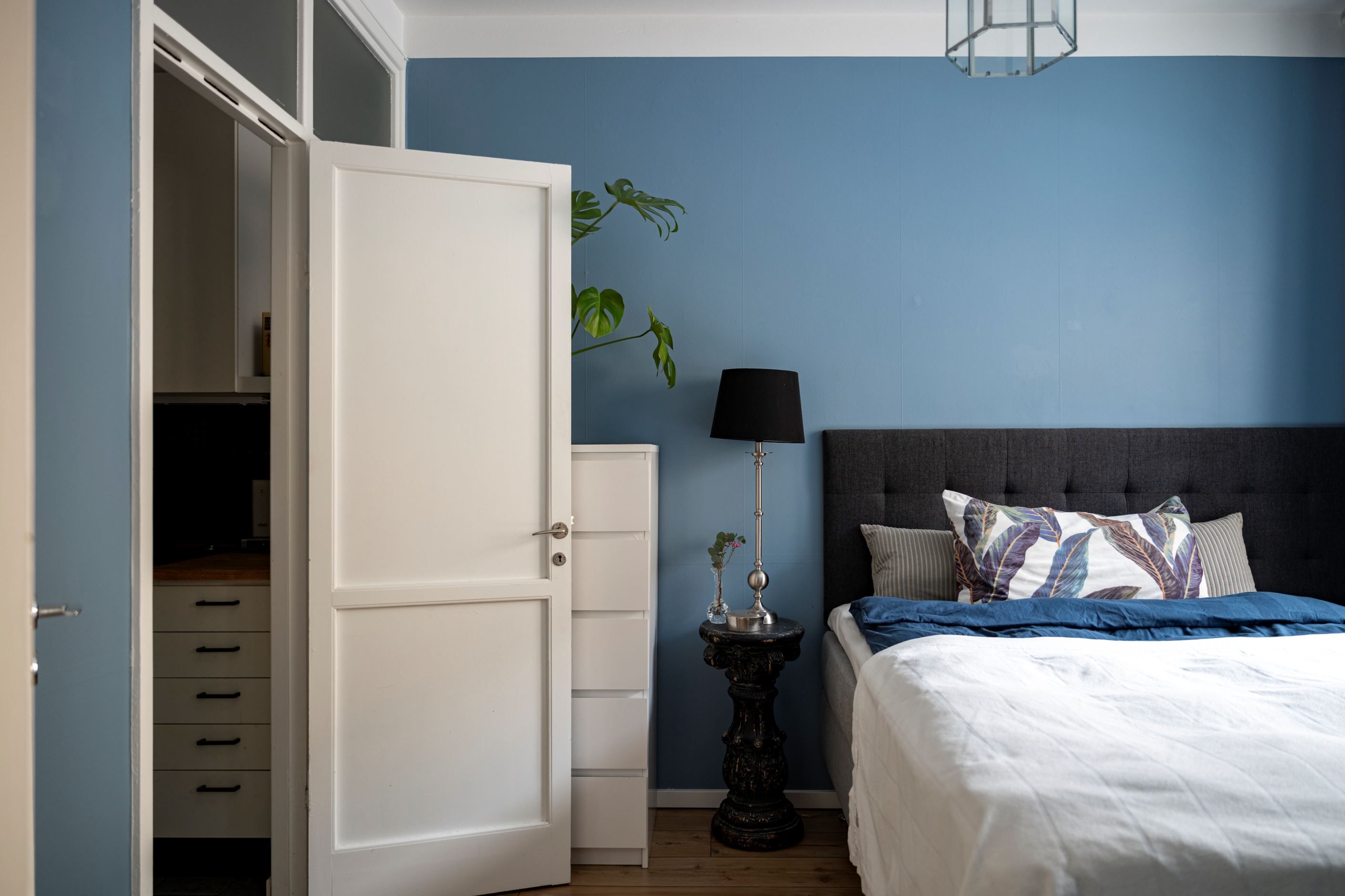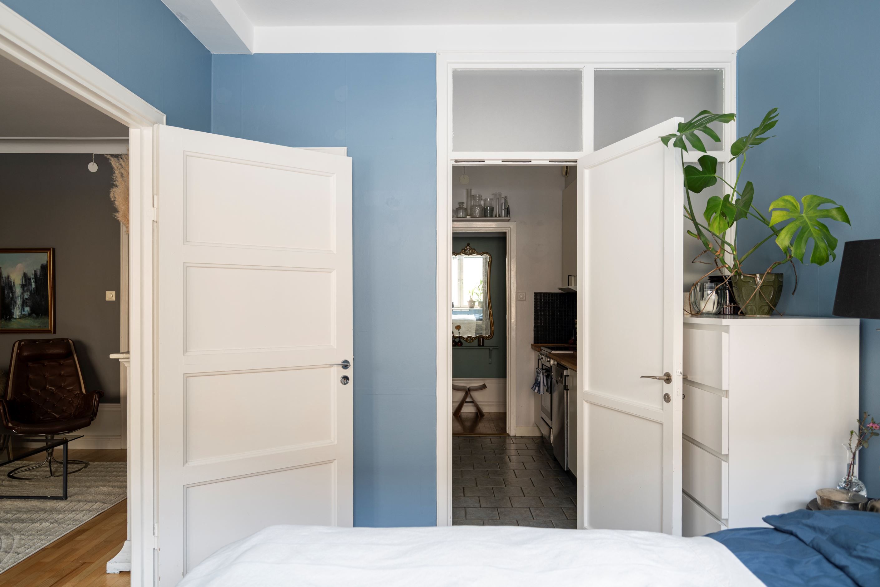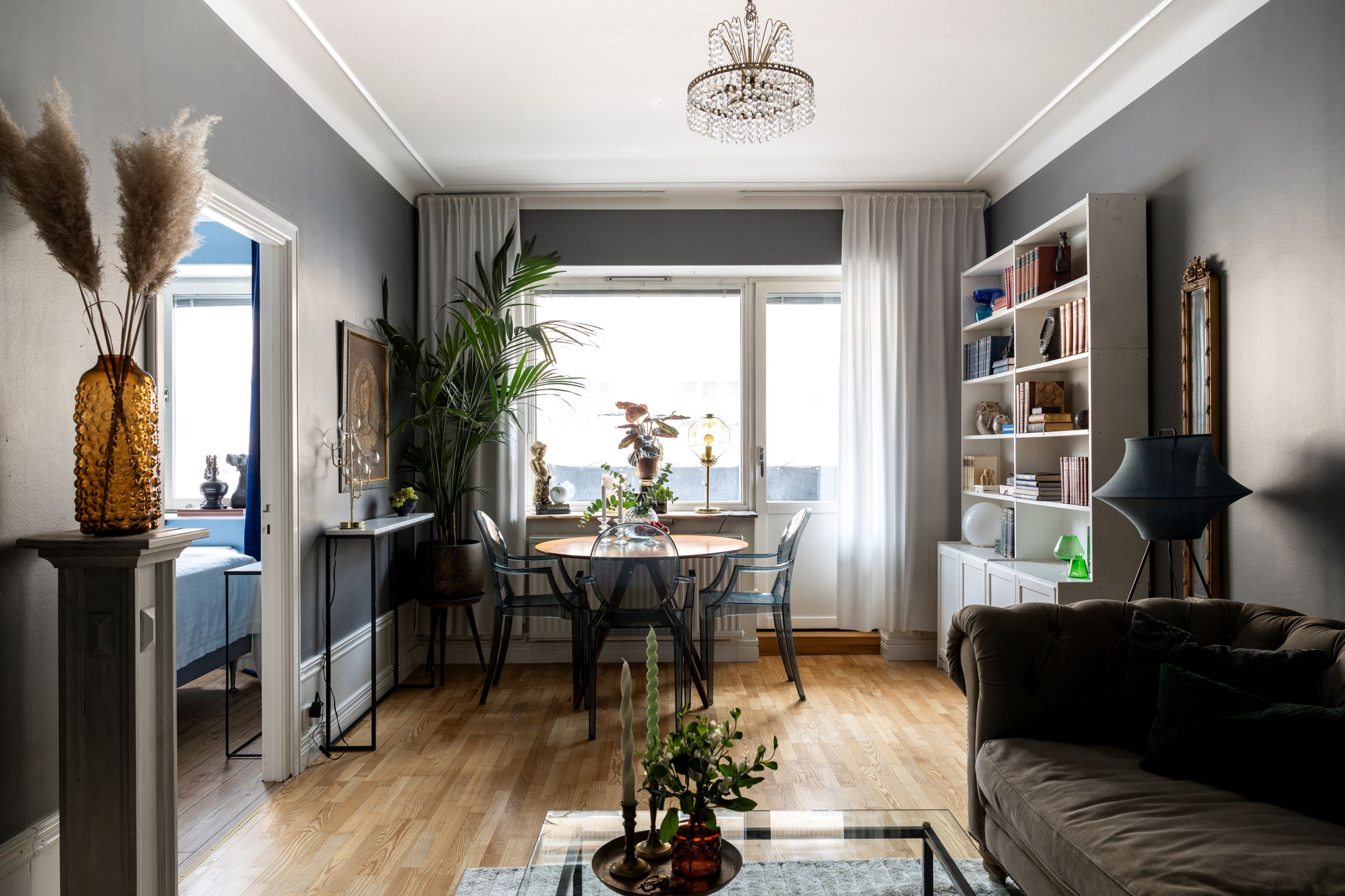 Lägenheten bjuder på härlig rymd tack vare den höga takhöjden och det fina ljusinsläppet från de stora fönsterpartierna. Planlösningen är genomtänkt med lättmöblerade rum och en naturlig uppdelning mellan sociala ytor och privata rum.