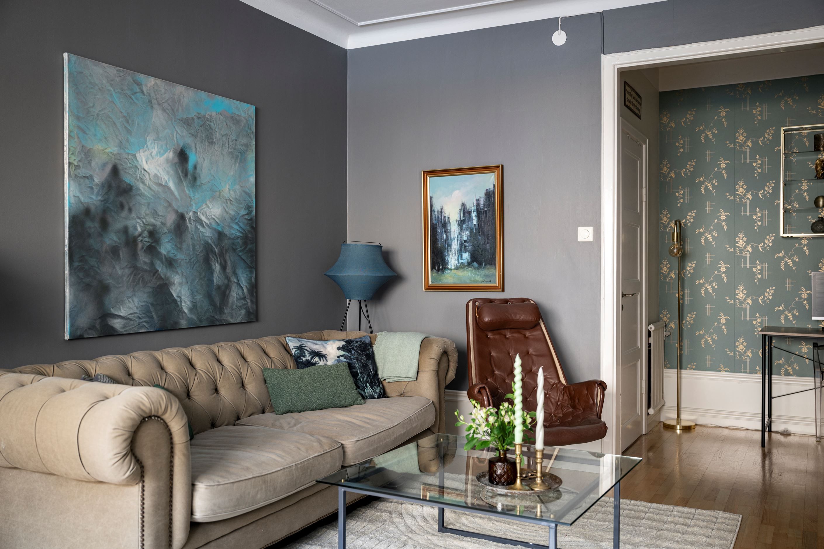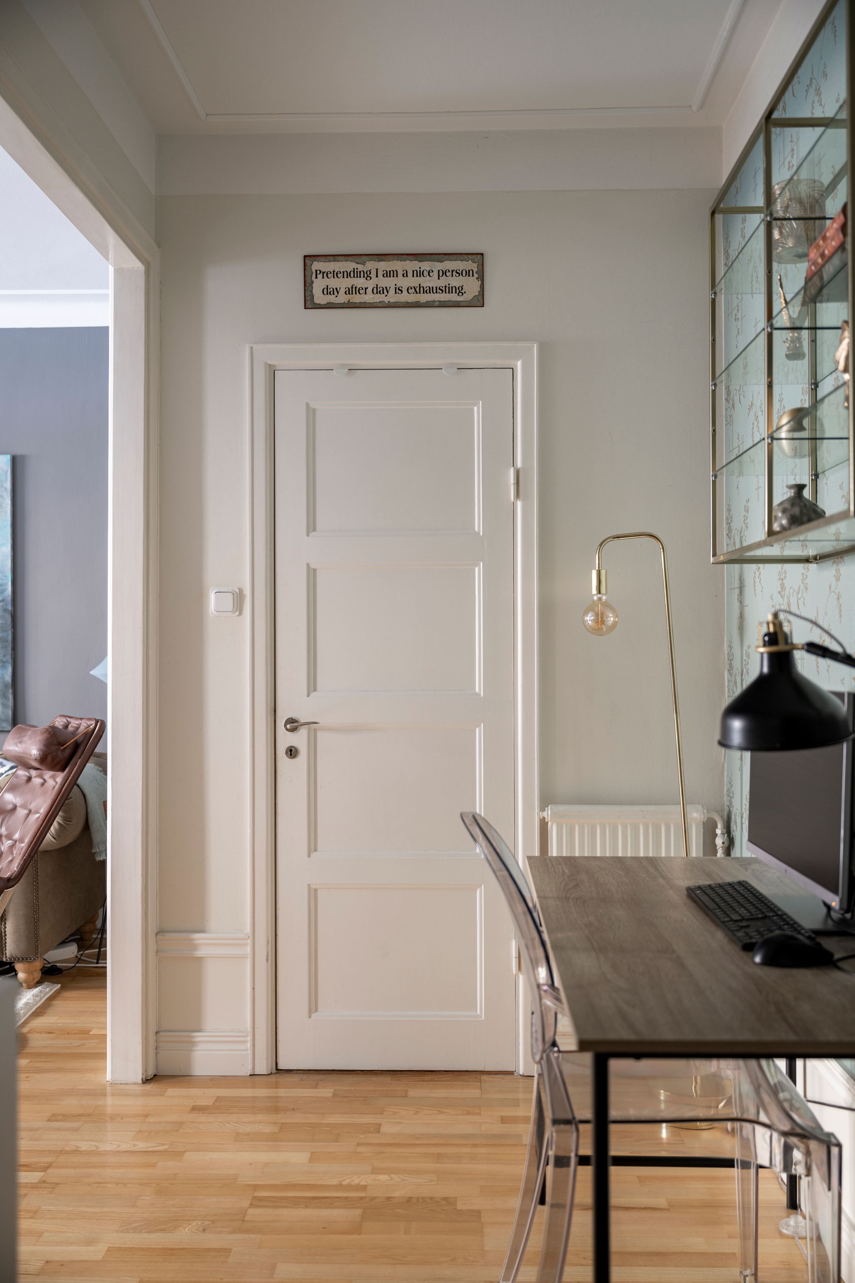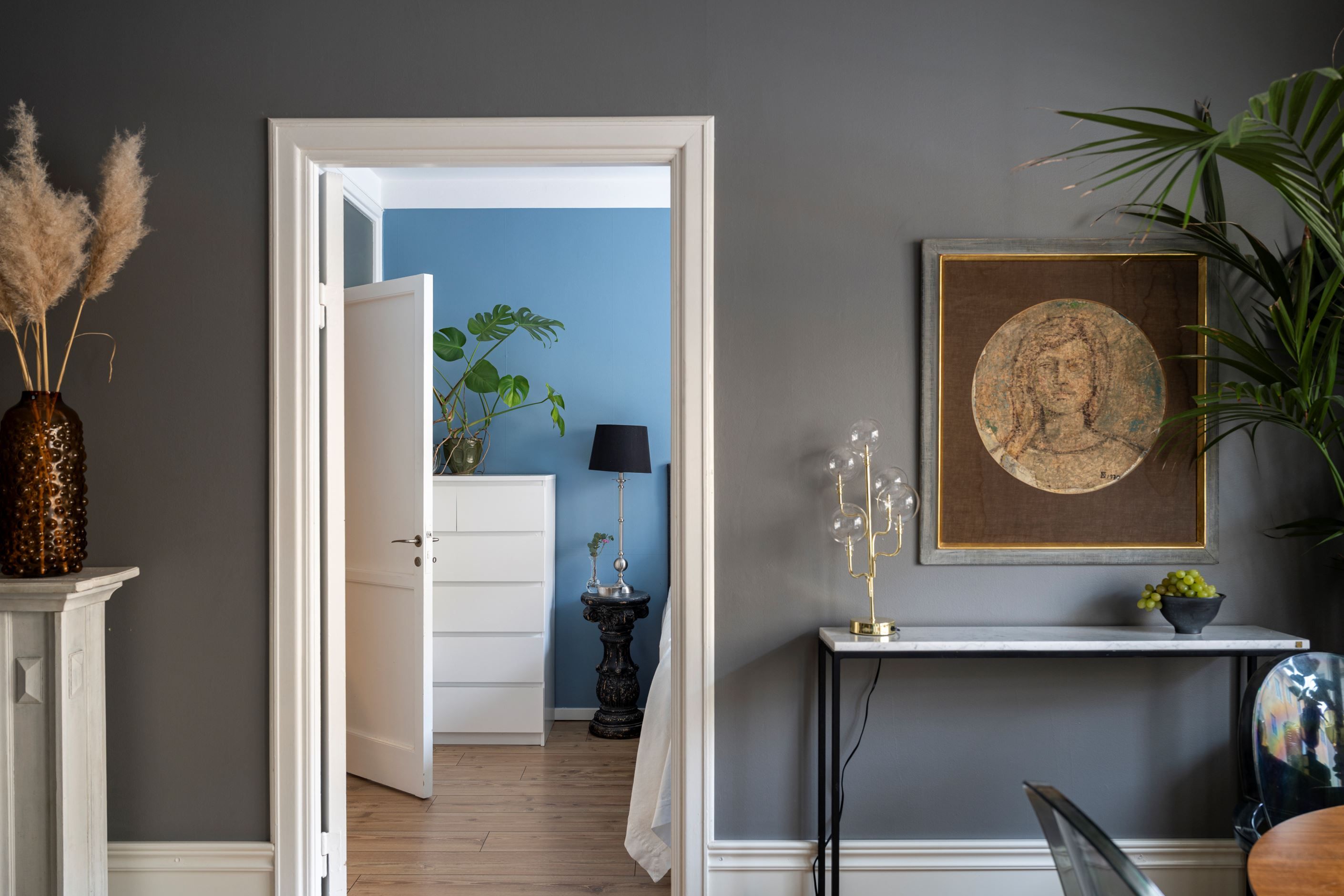 Lägenheten bjuder på härlig rymd tack vare den höga takhöjden och det fina ljusinsläppet från de stora fönsterpartierna. Planlösningen är genomtänkt med lättmöblerade rum och en naturlig uppdelning mellan sociala ytor och privata rum.