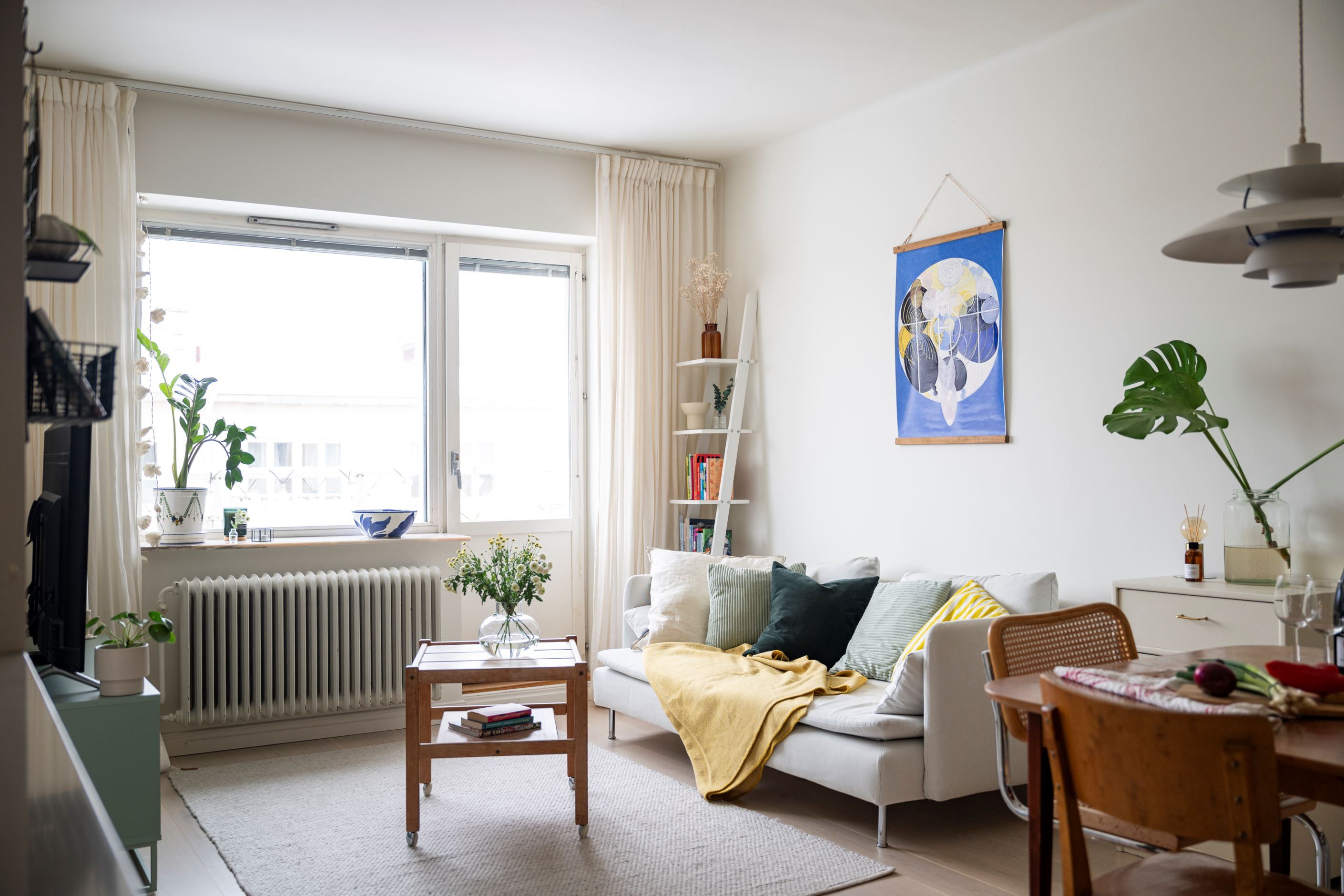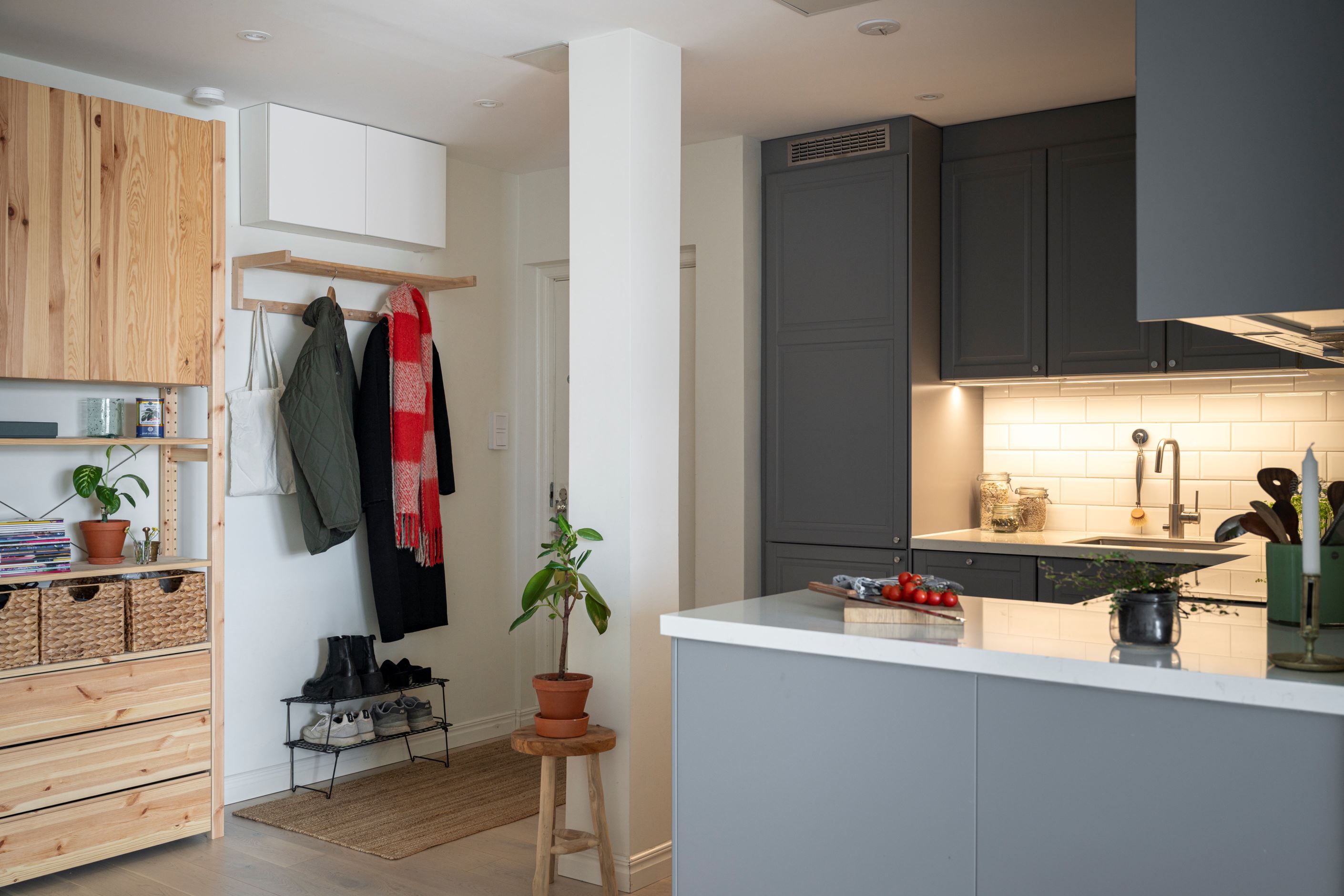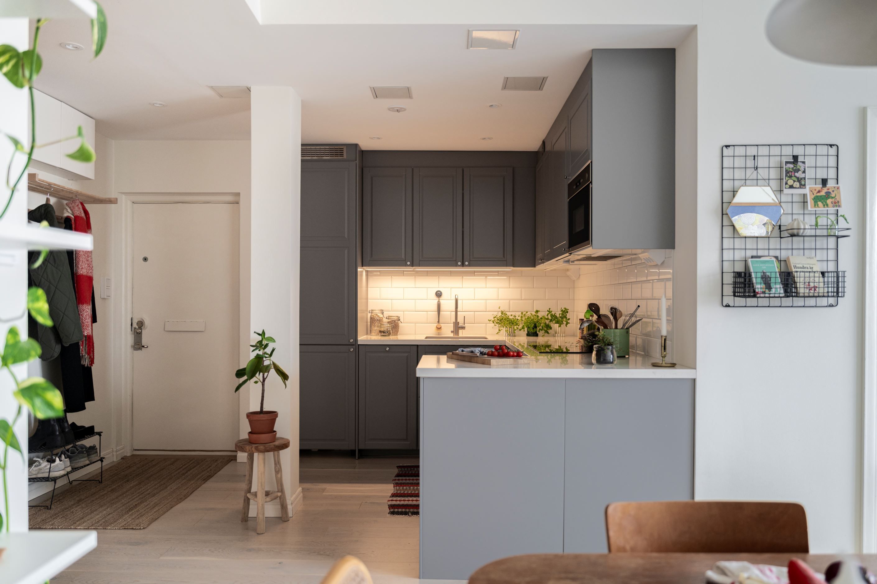 Det sociala hjärtat av hemmet är den öppna planlösningen mellan kök och vardagsrum. Köket är fräscht och fullt utrustat med allt du behöver, inklusive gott om arbetsyta för både vardagsmatlagning och större middagsbestyr. Vardagsrummet rymmer med lätthet både soffgrupp och matplats.