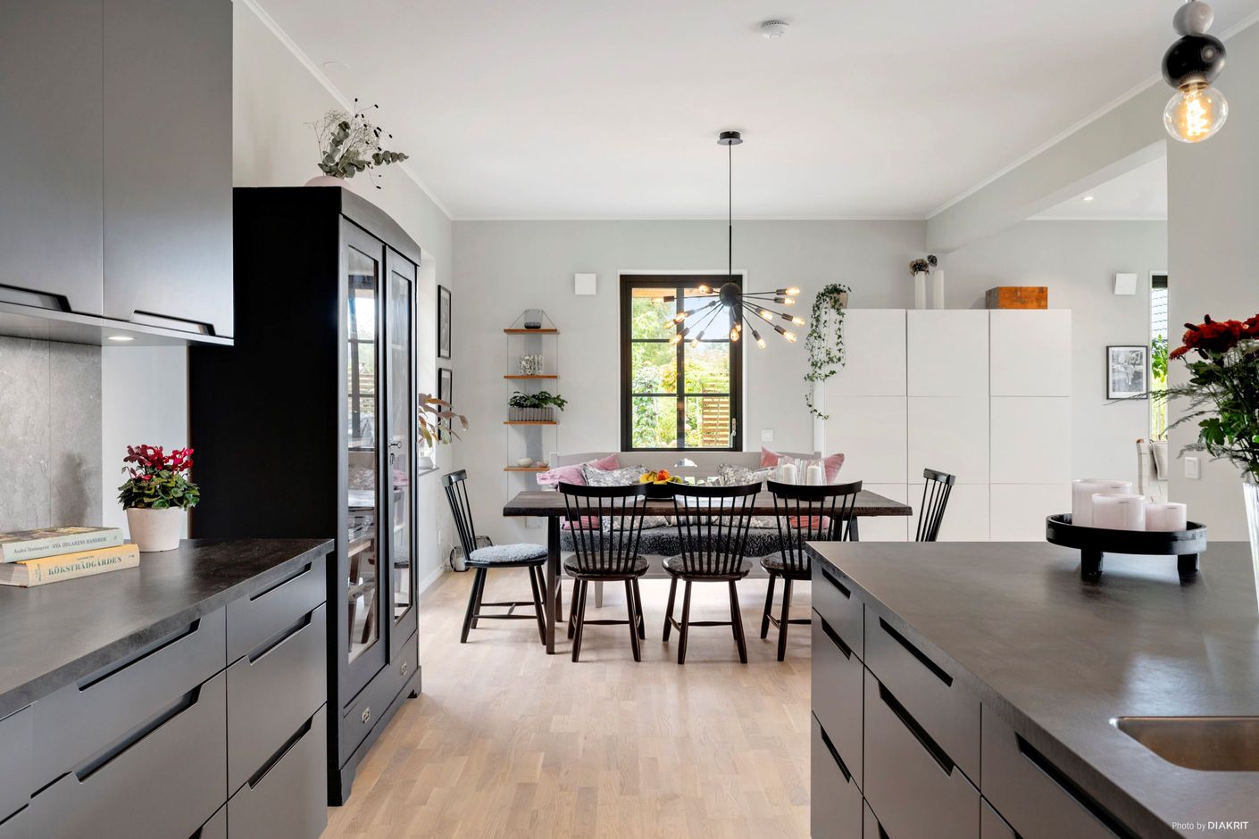 Inne möts du av en luftig planlösning med generös takhöjd, moderna material och en tidlös design. Det öppna samspelet mellan kök och vardagsrum gör hemmet perfekt för både vardagsliv och fest. Tre altandörrar binder samman inne och ute och gör det enkelt att njuta av solen från morgon till kväll.