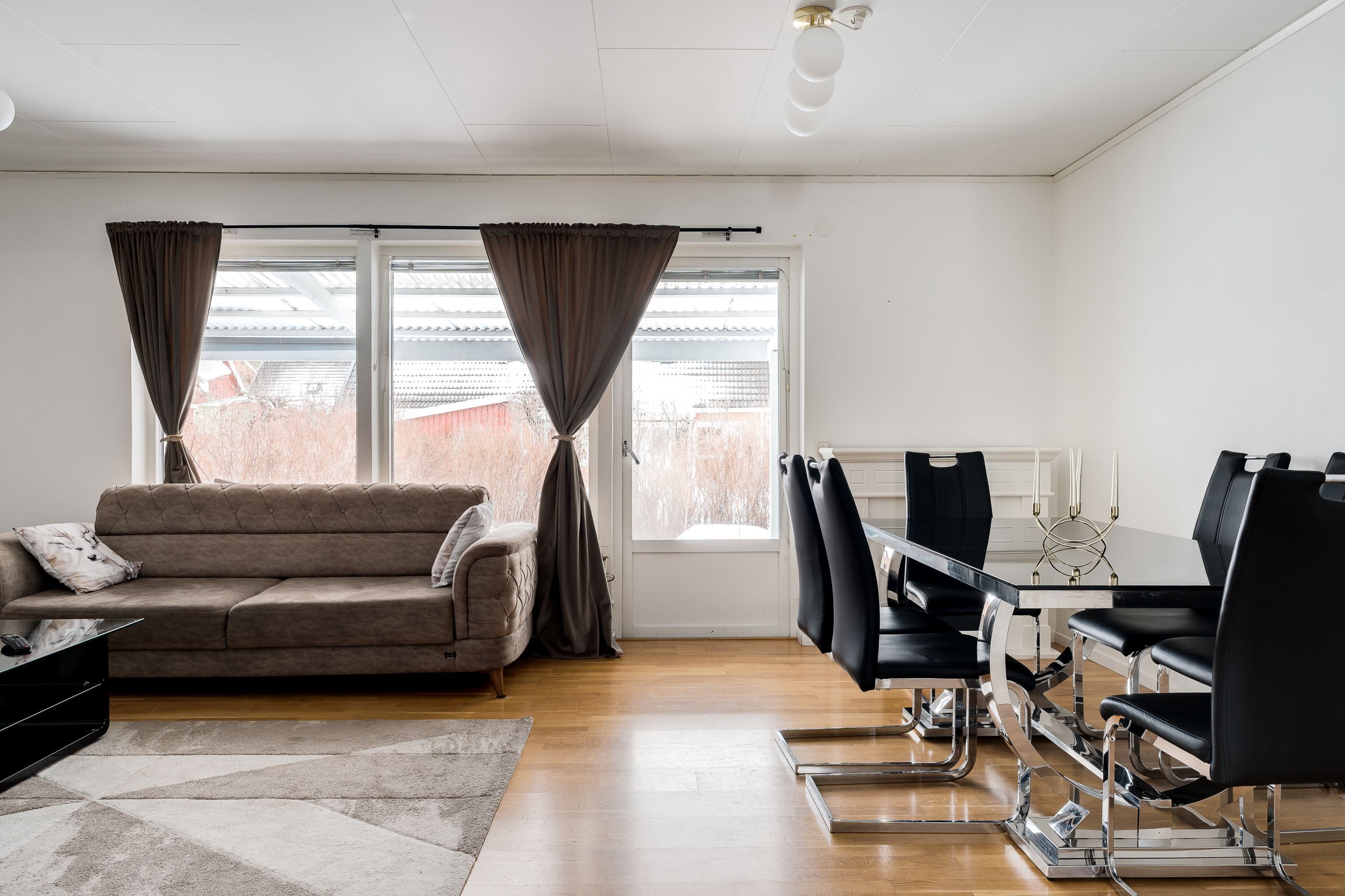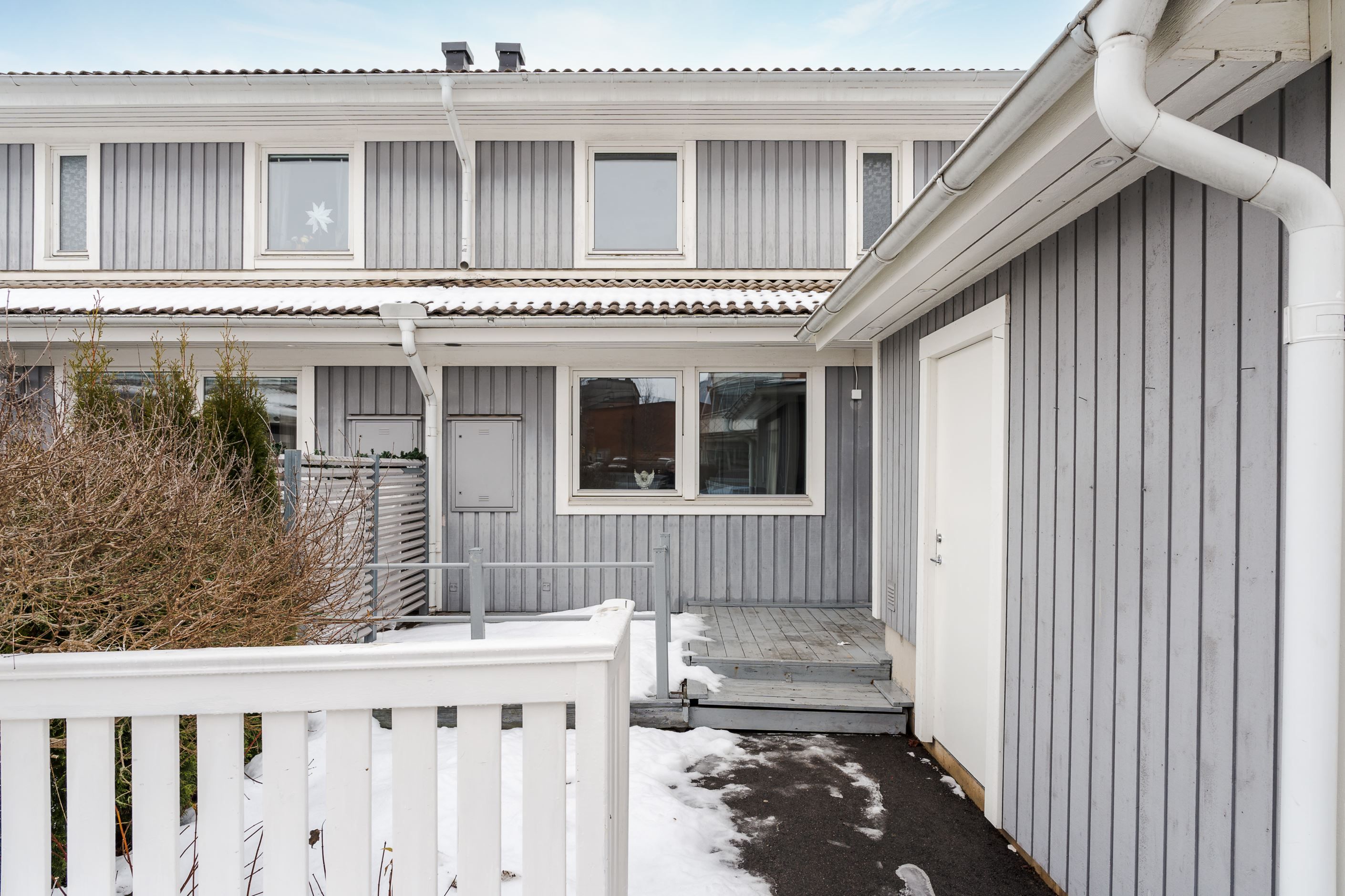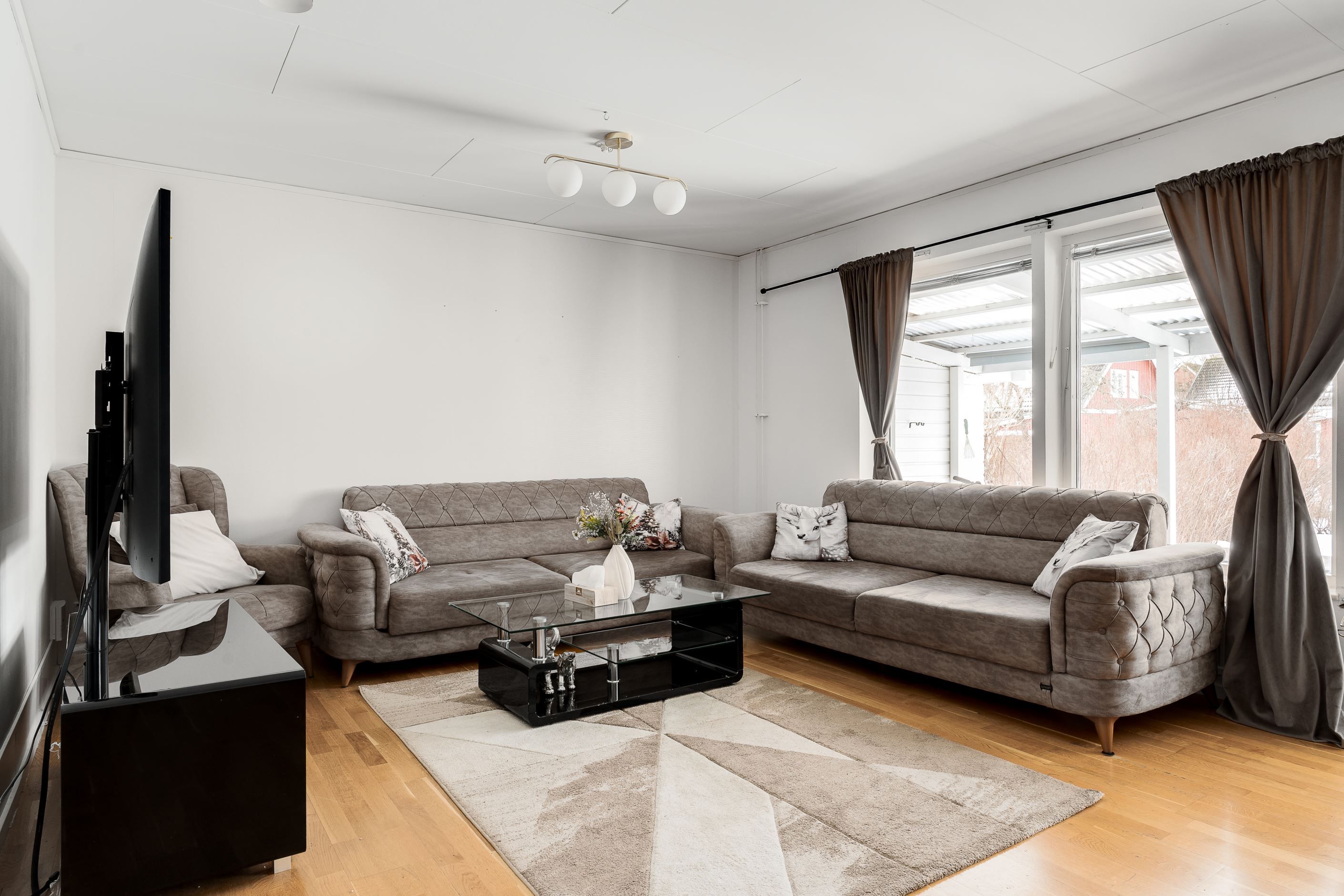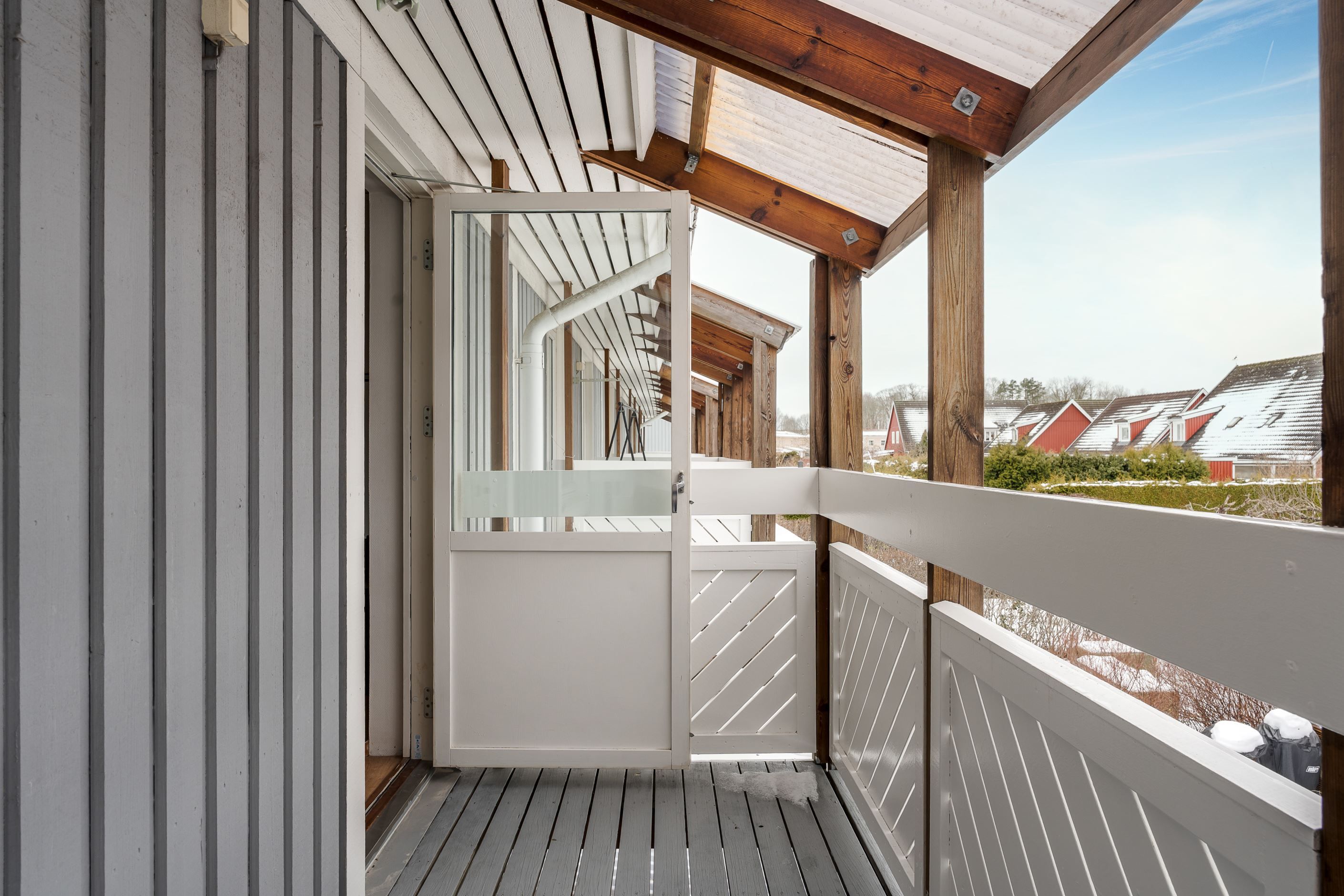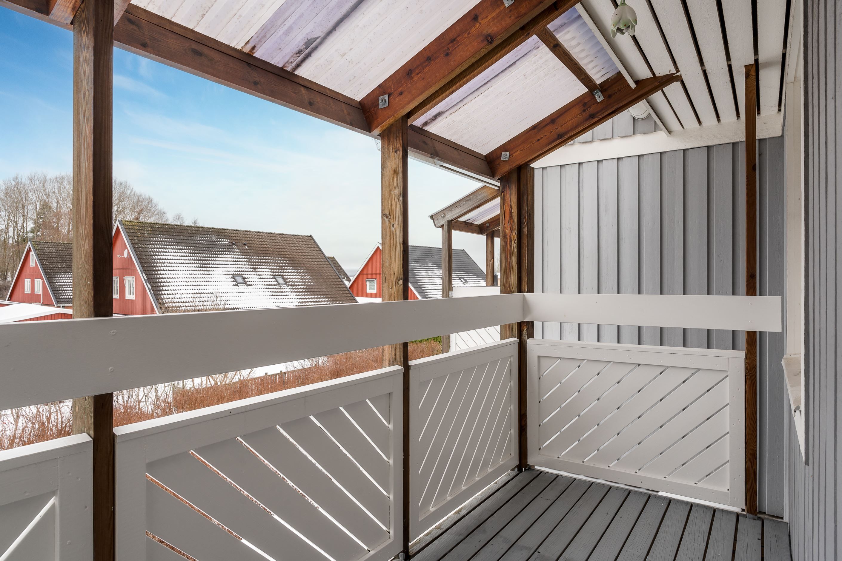Det inglasade uterummet blir en naturlig förlängning av bostaden och skapar en extra plats att nyttja stora delar av året. Altandäcket ger ytterligare utrymme för umgänge, grillkvällar och avkoppling.