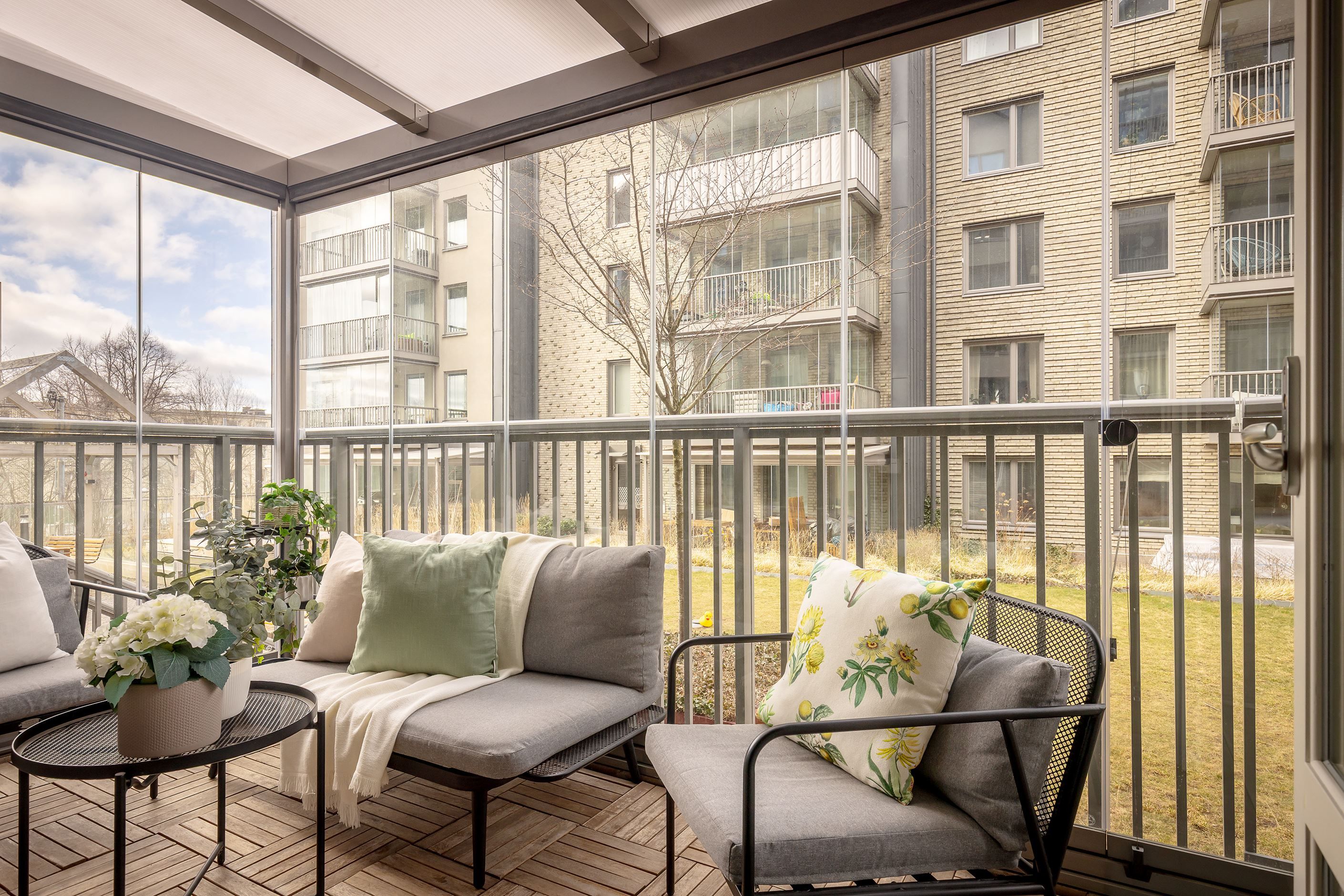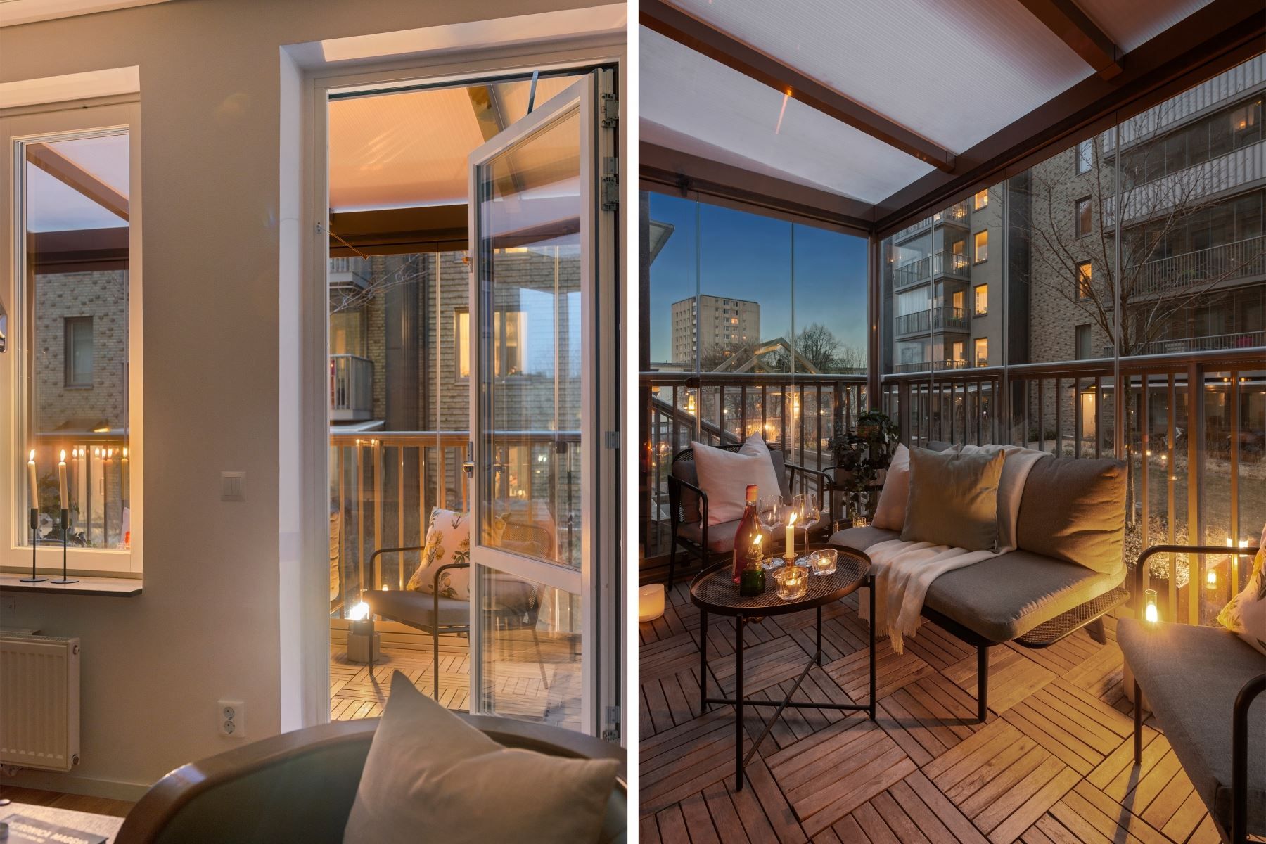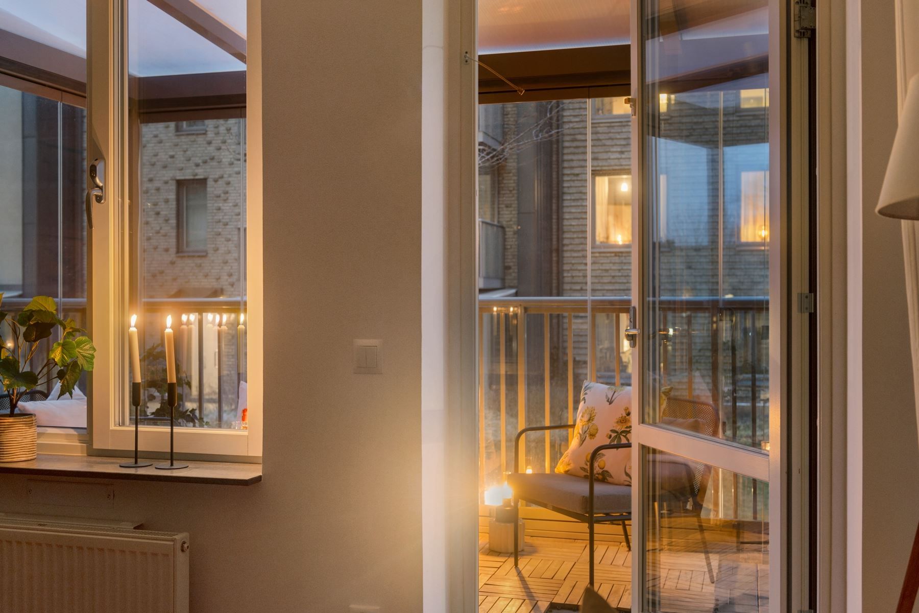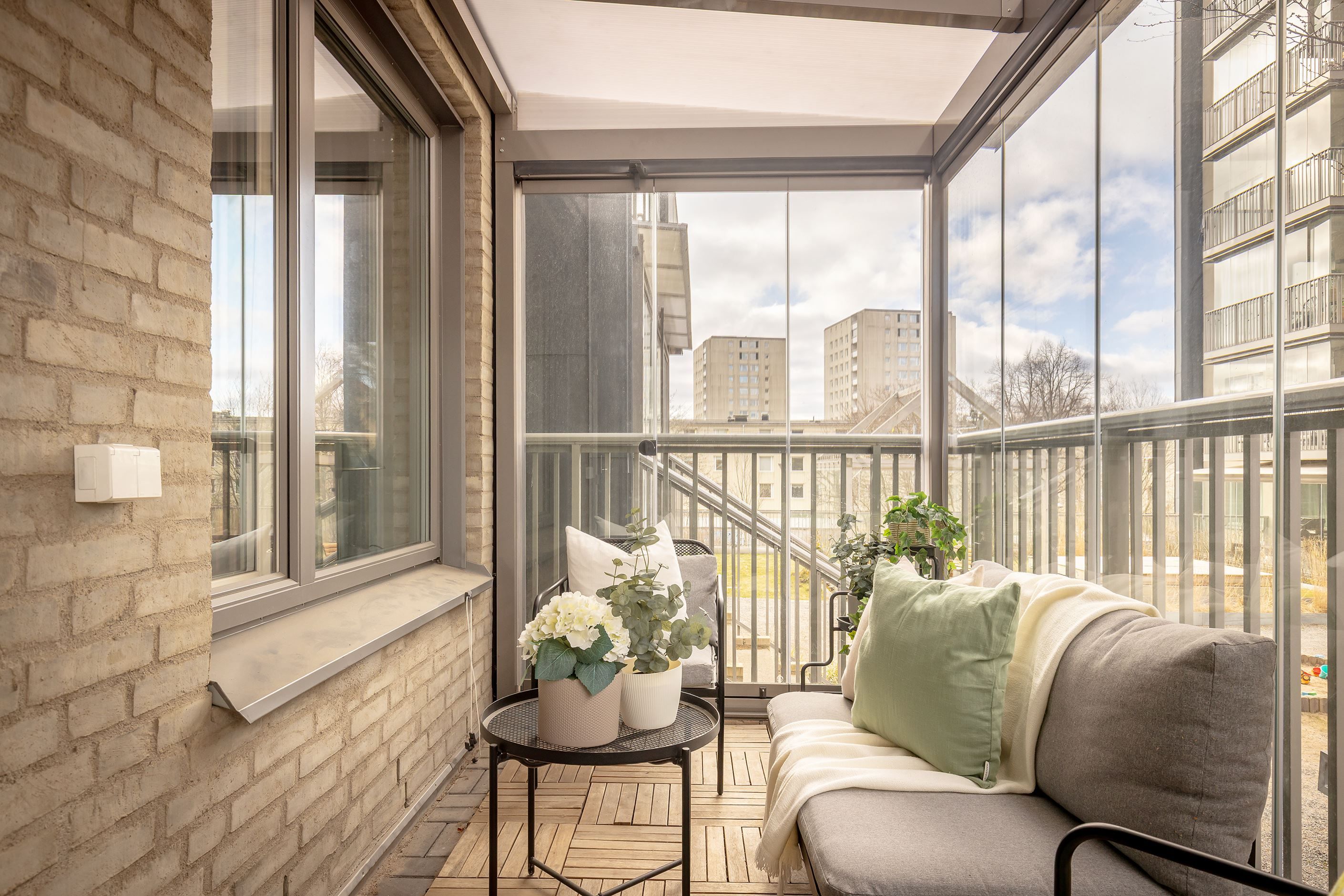 Välkomnande hall med naturlig plats för avhängning av ytterkläder och skor i anslutning till entrén samt ytterligare förvaringsmöjligheter i stor garderob bakom skjutdörrar. Hallen öppnar upp mot bostadens sociala delar med kök och vardagsrum i öppen planlösning. Stort fönsterparti samt helglasad balkongdörr skänker vardagsrum och kök mängder av naturligt ljus och en utsikt mot bostadens inglasade balkong och föreningens trevliga innergård. Det stilrena köket erbjuder generösa förvaringsmöjligheter i skåp och lådor bakom vita släta fronter samt god arbetsyta längst den grå köksbänken. Köket är fullt maskinellt utrustat med kombinerad kyl/frys, induktionshäll, ugn och mikrovågsugn samt diskmaskin som integrerats i inredningen för en stilren finish. Golvytan i den öppna planlösningen ger goda möjligheter till möblering med både matbord med tillhörande stolar samt vardagsrumsmöblemang utifrån egen smak och behov. Från vardagsrummet når man den stora och inglasade balkongen, som även nås direkt från innergården via en privat trappa. Med ett fördelaktigt sydvästläge bjuder den in till möblering med utemöbler och härlig utevistelse under årets lite varmare månader. Inglasningen förlänger också balkongsäsongen över större delar av året. Rogivande sovrum med härligt naturligt ljus via stort fönsterparti. Golvytan ger möjlighet till möblering med fullstor säng och tillhörande sängbord. Här finns dessutom en rymlig garderob för ytterligare förvaring. Badrummet är rymligt och erbjuder duschplats bakom duschvägg i klarglas, handfat på kommod, spegel, handdukstork och WC. Badrummets generösa yta ger även plats för klädvård med kombimaskin för tvätt och tork under vit arbetsbänk, samt väggskåp som skänker gott om utrymme för förvaring. Till bostaden hör dessutom ett källarförråd.
