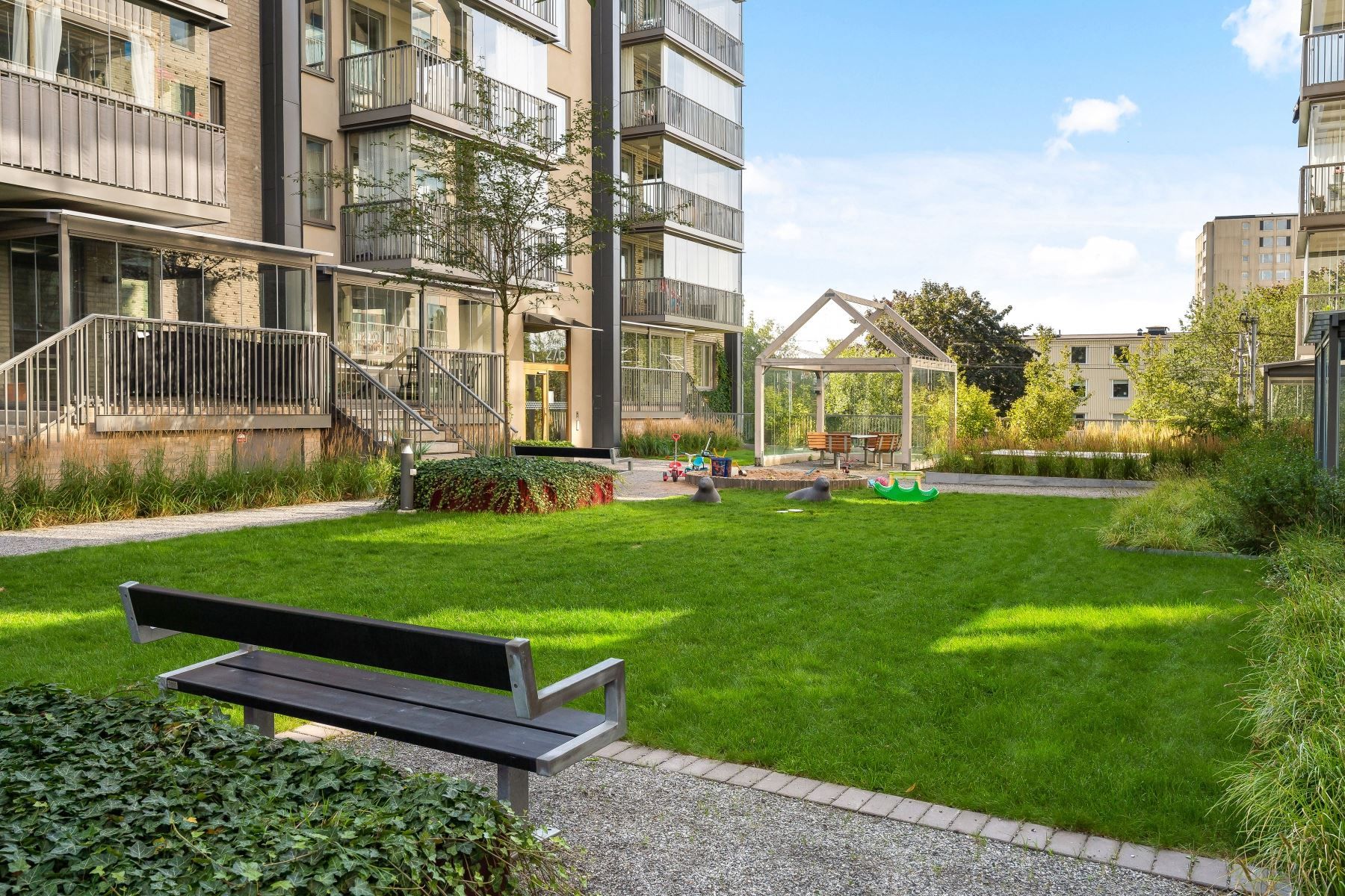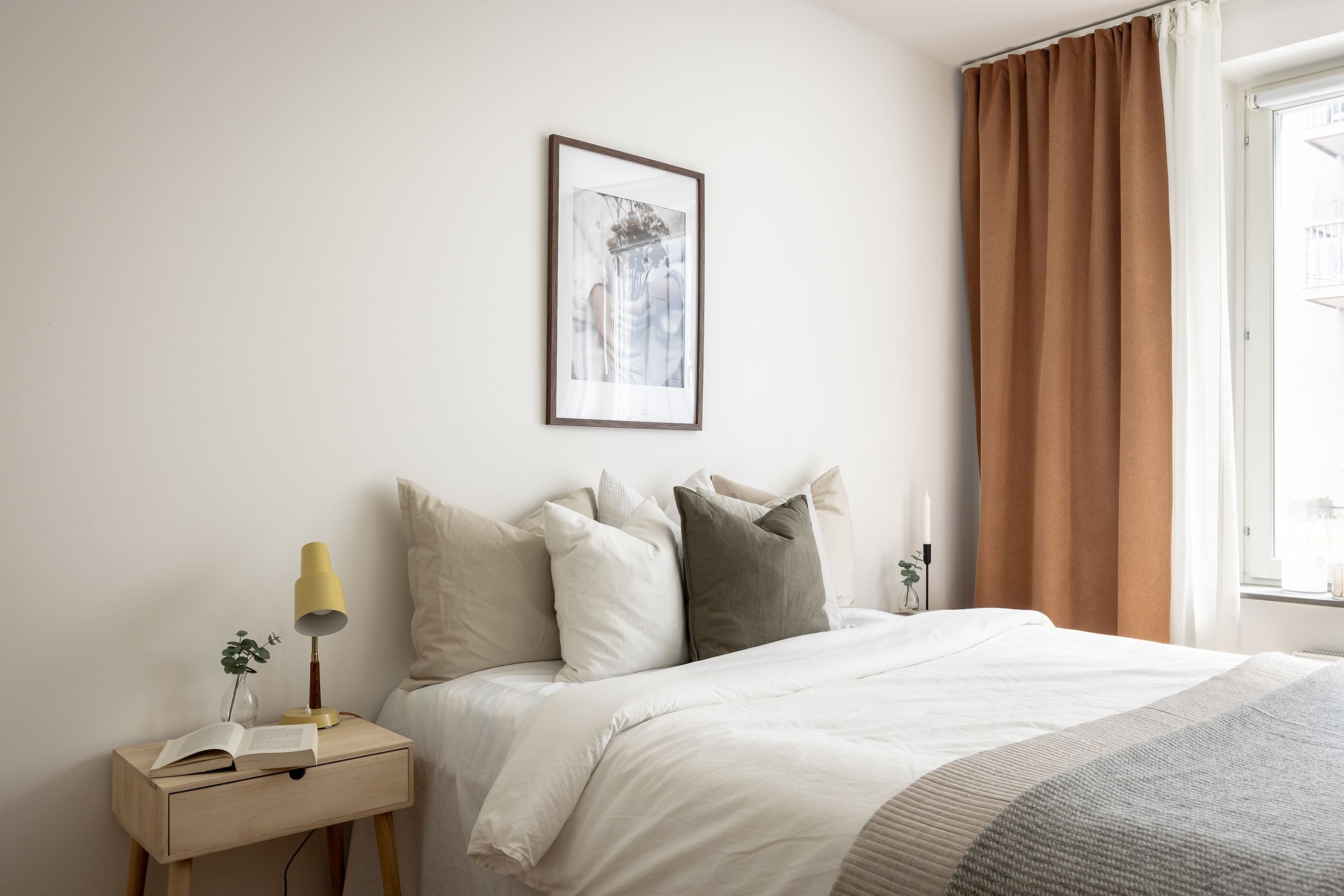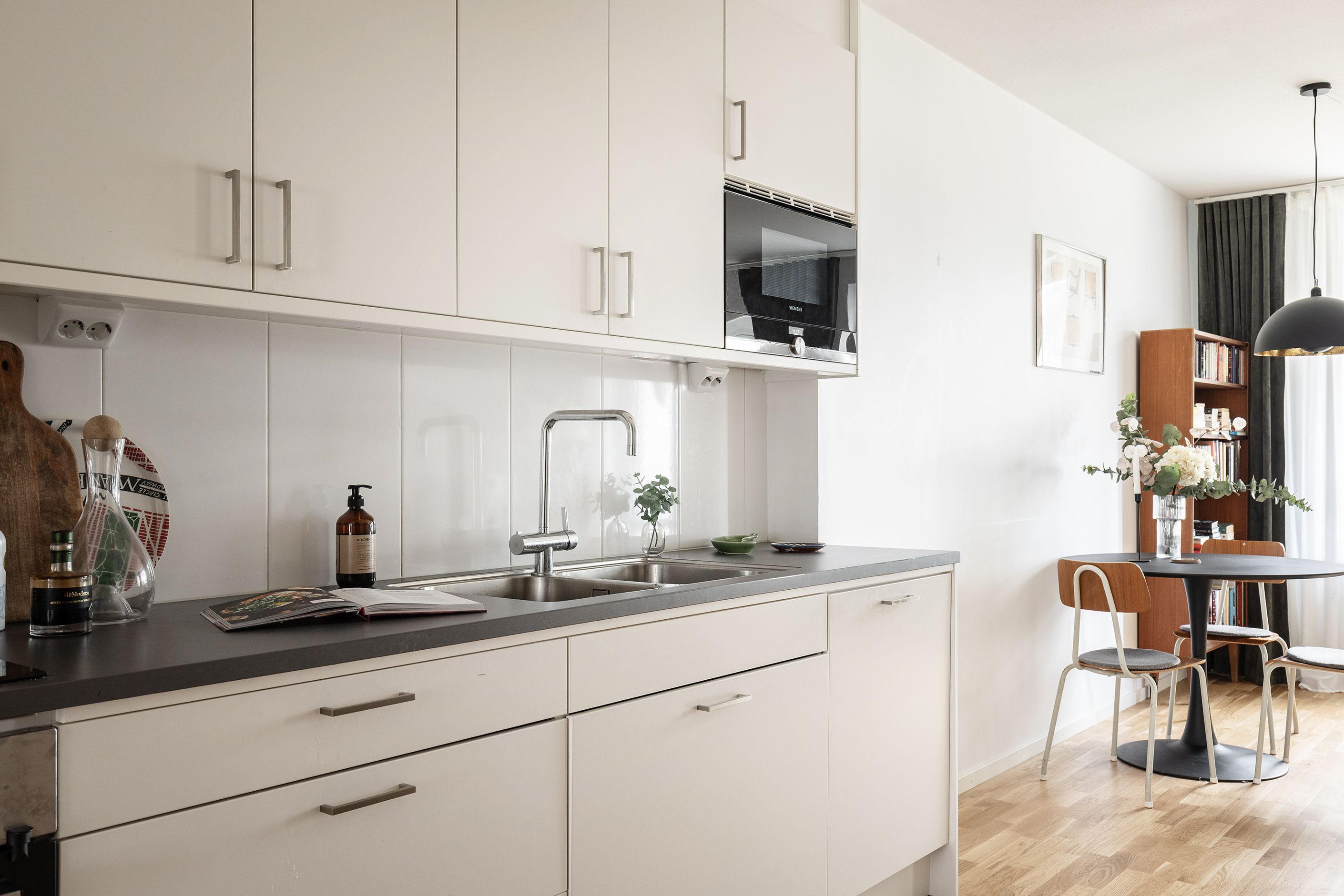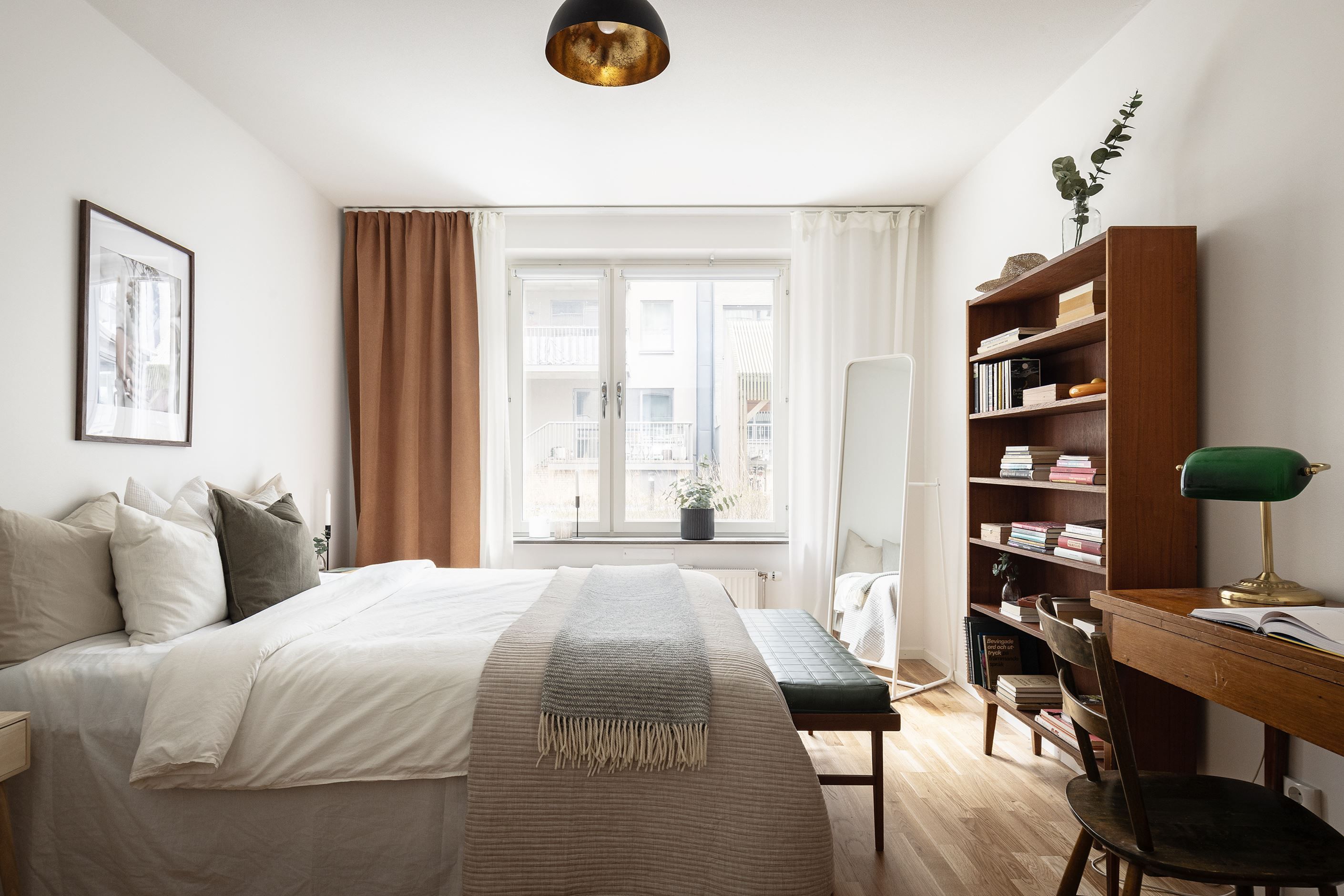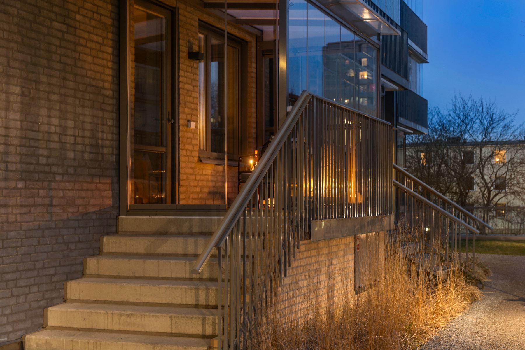 Välkomnande hall med naturlig plats för avhängning av ytterkläder och skor i anslutning till entrén samt ytterligare förvaringsmöjligheter i stor garderob bakom skjutdörrar. Hallen öppnar upp mot bostadens sociala delar med kök och vardagsrum i öppen planlösning. Stort fönsterparti samt helglasad balkongdörr skänker vardagsrum och kök mängder av naturligt ljus och en utsikt mot bostadens inglasade balkong och föreningens trevliga innergård. Det stilrena köket erbjuder generösa förvaringsmöjligheter i skåp och lådor bakom vita släta fronter samt god arbetsyta längst den grå köksbänken. Köket är fullt maskinellt utrustat med kombinerad kyl/frys, induktionshäll, ugn och mikrovågsugn samt diskmaskin som integrerats i inredningen för en stilren finish. Golvytan i den öppna planlösningen ger goda möjligheter till möblering med både matbord med tillhörande stolar samt vardagsrumsmöblemang utifrån egen smak och behov. Från vardagsrummet når man den stora och inglasade balkongen, som även nås direkt från innergården via en privat trappa. Med ett fördelaktigt sydvästläge bjuder den in till möblering med utemöbler och härlig utevistelse under årets lite varmare månader. Inglasningen förlänger också balkongsäsongen över större delar av året. Rogivande sovrum med härligt naturligt ljus via stort fönsterparti. Golvytan ger möjlighet till möblering med fullstor säng och tillhörande sängbord. Här finns dessutom en rymlig garderob för ytterligare förvaring. Badrummet är rymligt och erbjuder duschplats bakom duschvägg i klarglas, handfat på kommod, spegel, handdukstork och WC. Badrummets generösa yta ger även plats för klädvård med kombimaskin för tvätt och tork under vit arbetsbänk, samt väggskåp som skänker gott om utrymme för förvaring. Till bostaden hör dessutom ett källarförråd.