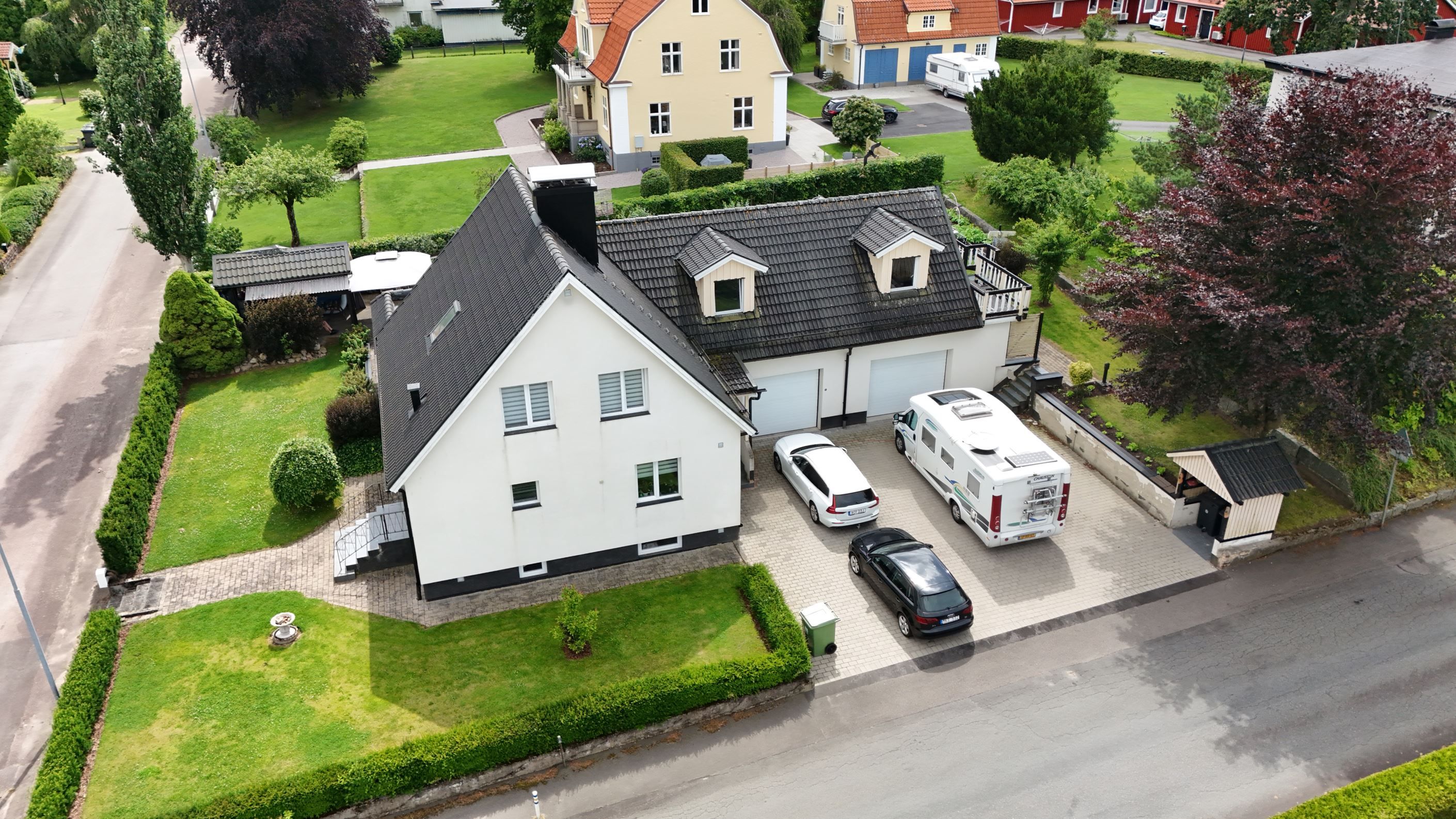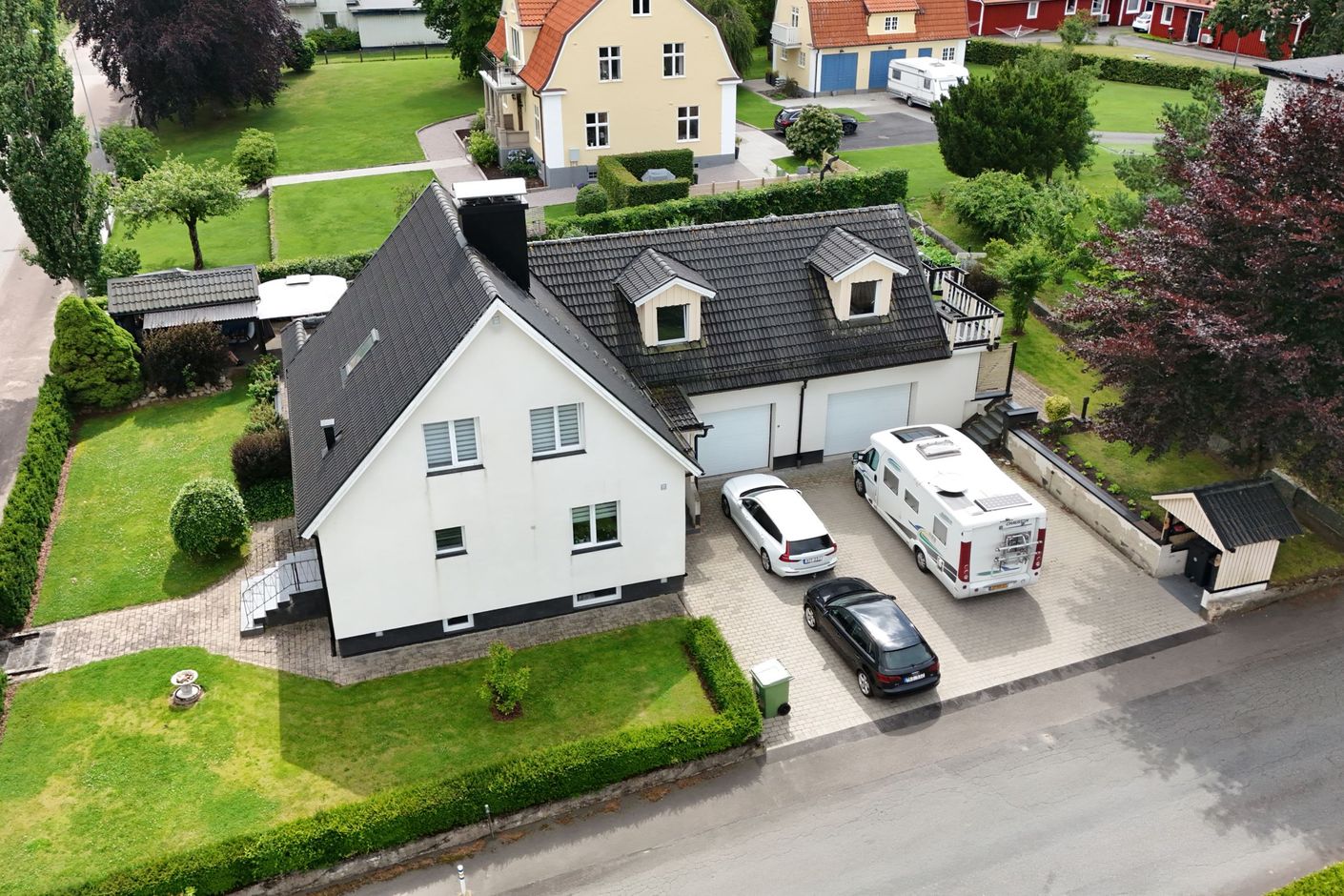 Det uppvärmda dubbelgaraget är en dröm för bilentusiasten eller hemmafixaren – här kan du mecka och skapa året runt. Den stora, stenlagda uppfarten rymmer flera bilar och ger ett välkomnande första intryck.