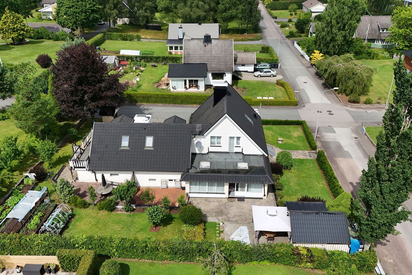 Den rymliga vinterträdgården med vattenburen golvvärme blir hemmets hjärta – en plats att samlas på året runt, oavsett om det är sommarens sena middagar eller vinterns stilla kaffestunder. Flera soliga uteplatser runt huset bjuder in till avkoppling, umgänge och långa grillkvällar.