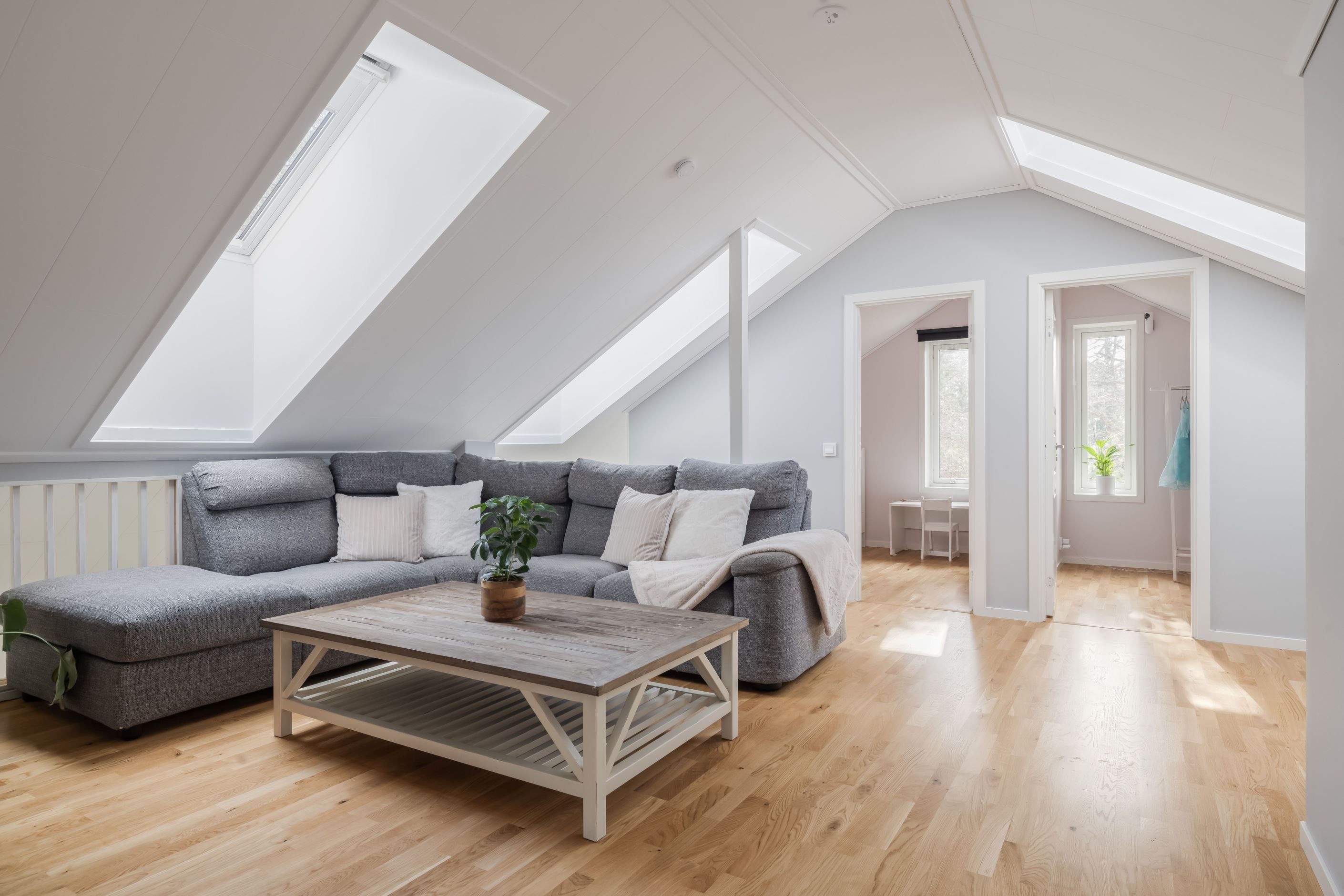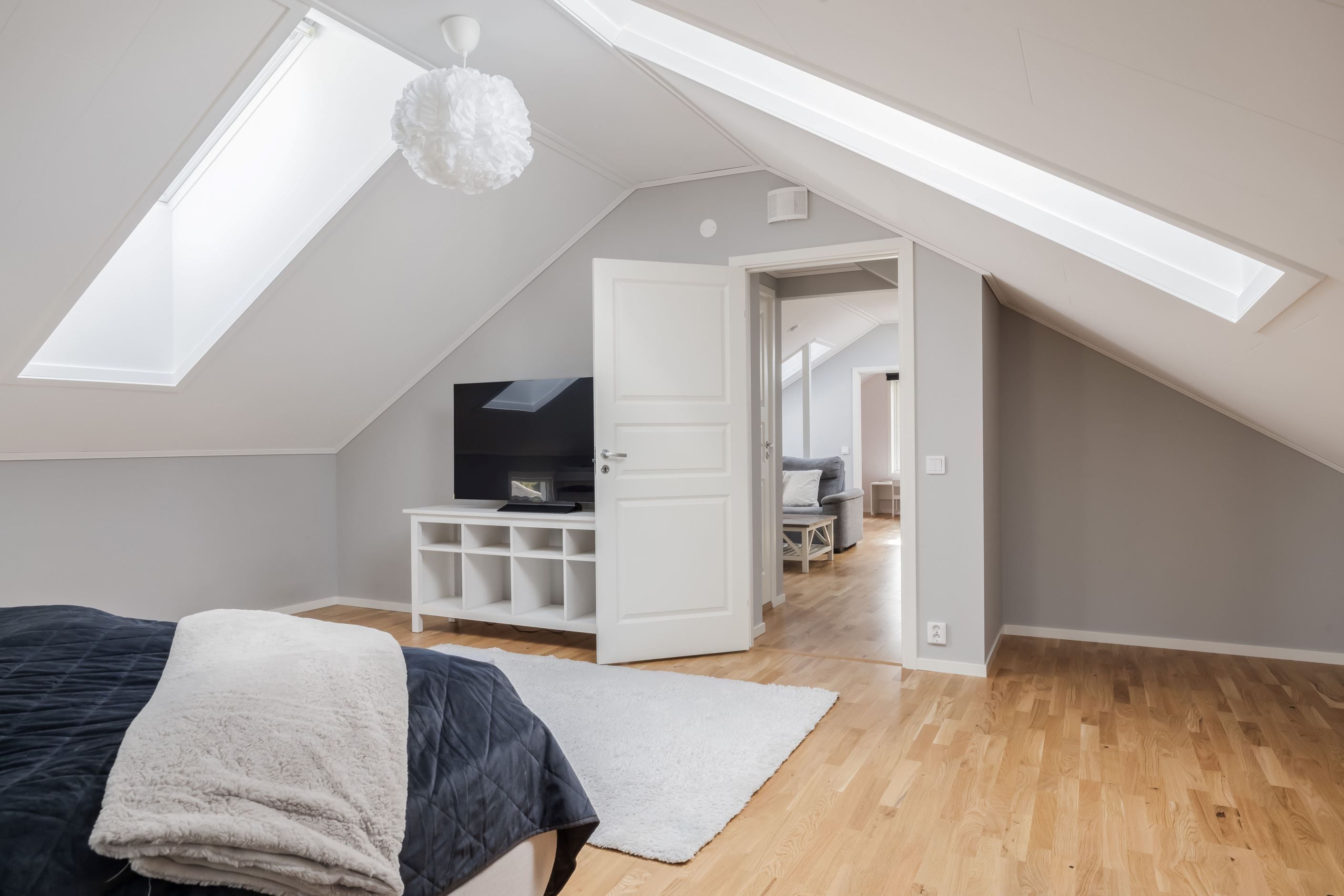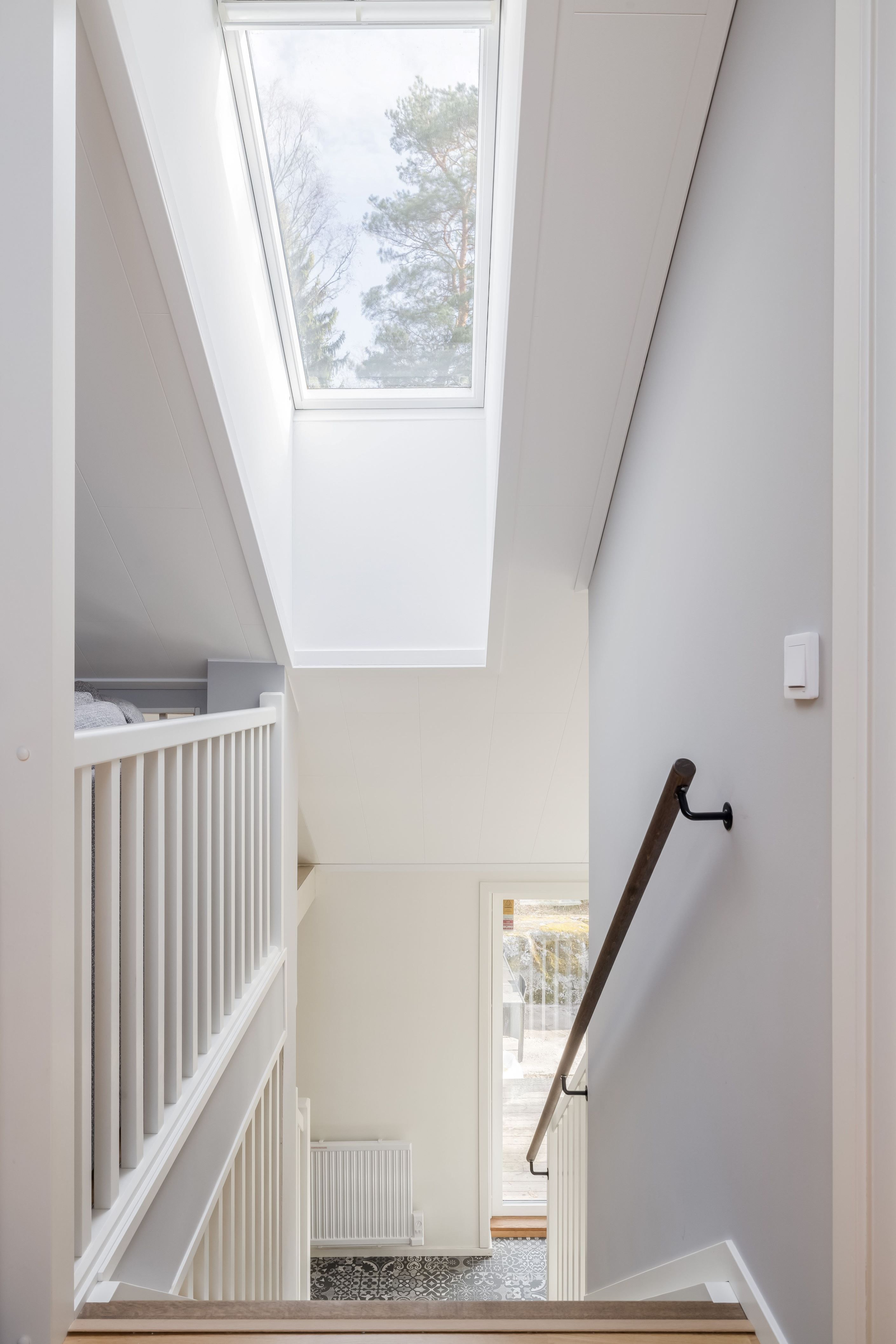 Övervåningen utgör ett mer privat plan med fin takhöjd och flera takfönster som ger ett härligt ljusinsläpp. Här finns ett trivsamt allrum med plats för soffgrupp, två sovrum samt ett rymligt master bedroom med gott om plats för dubbelsäng och ytterligare möblering. Planlösningen kompletteras med wc samt goda förvaringsmöjligheter.