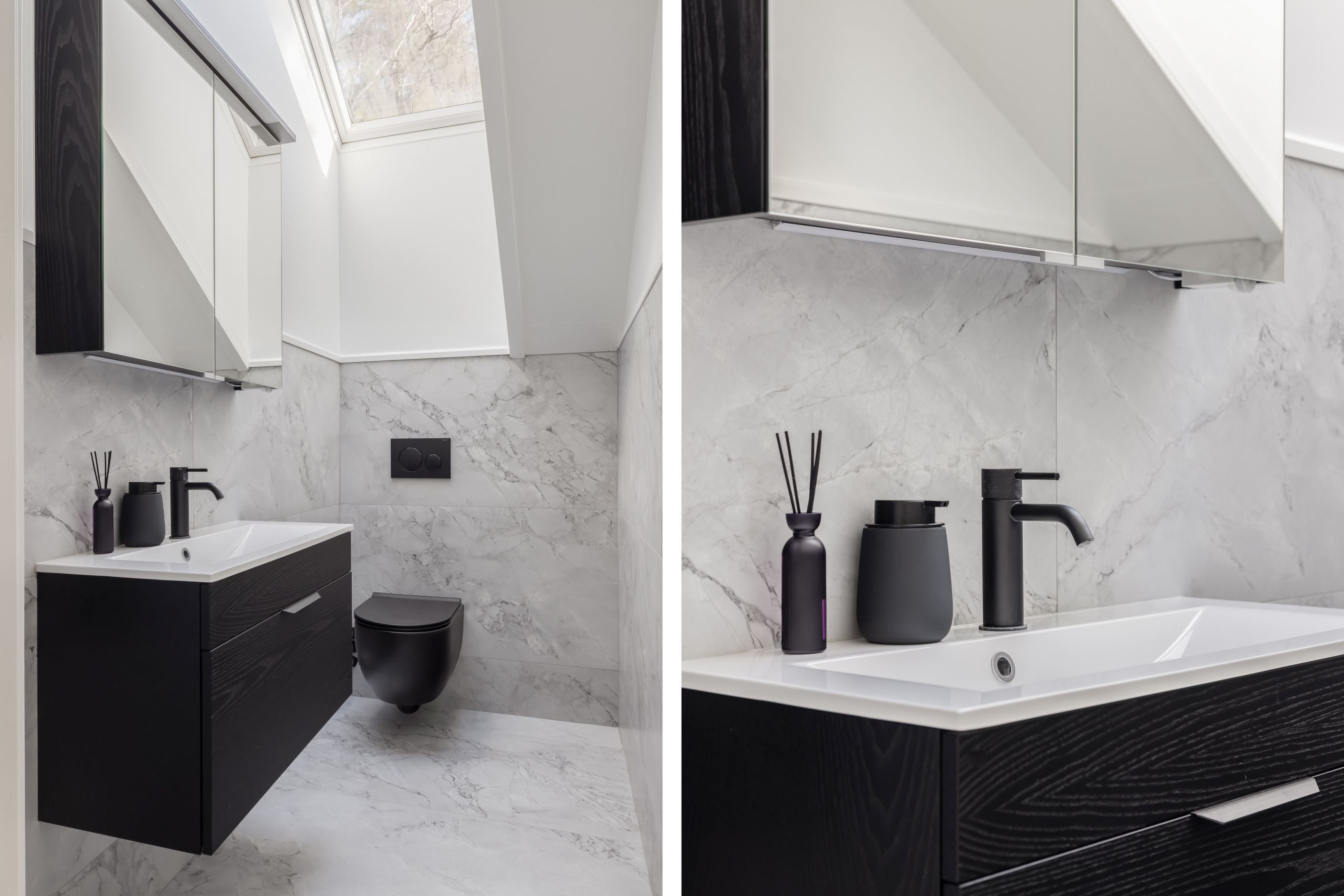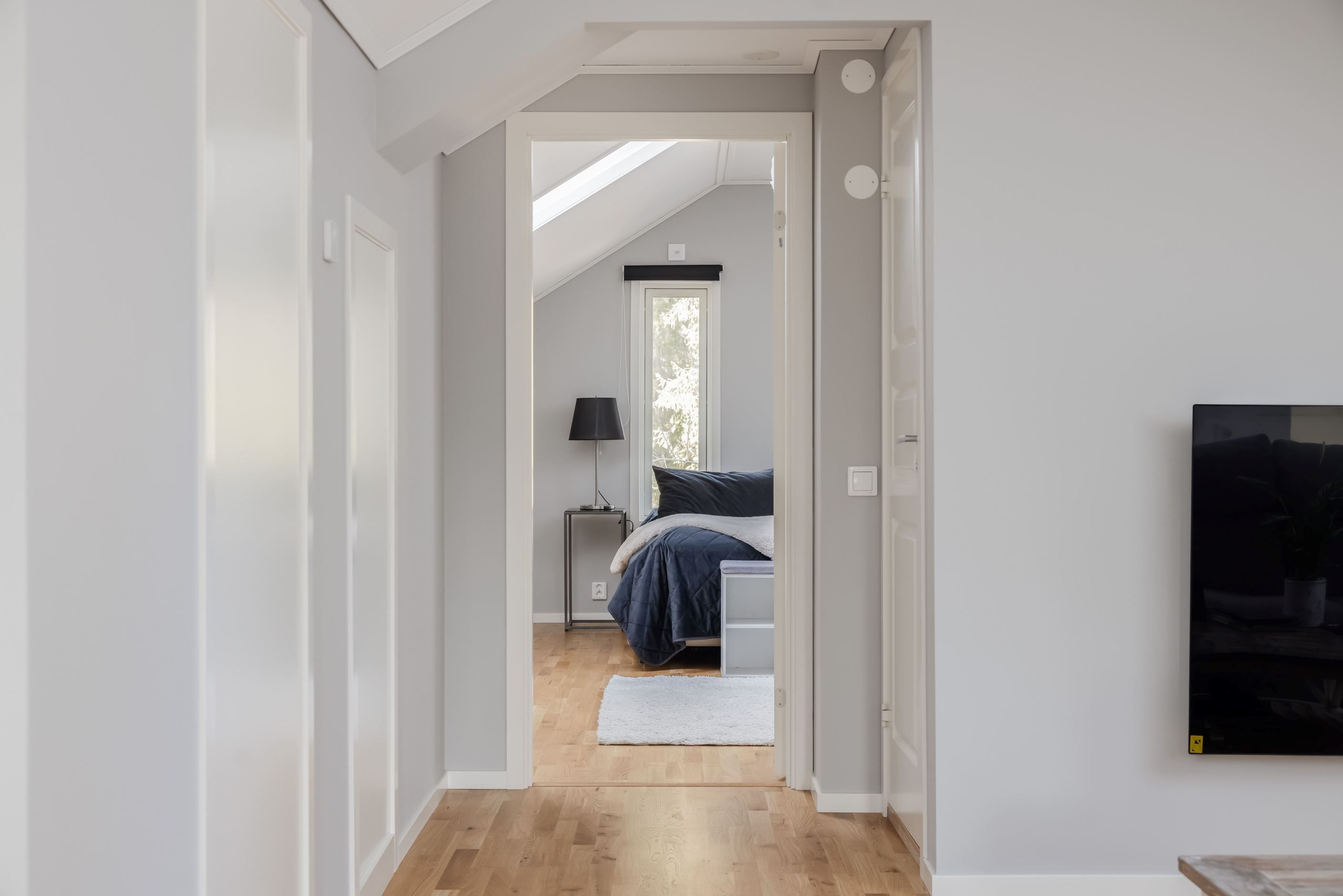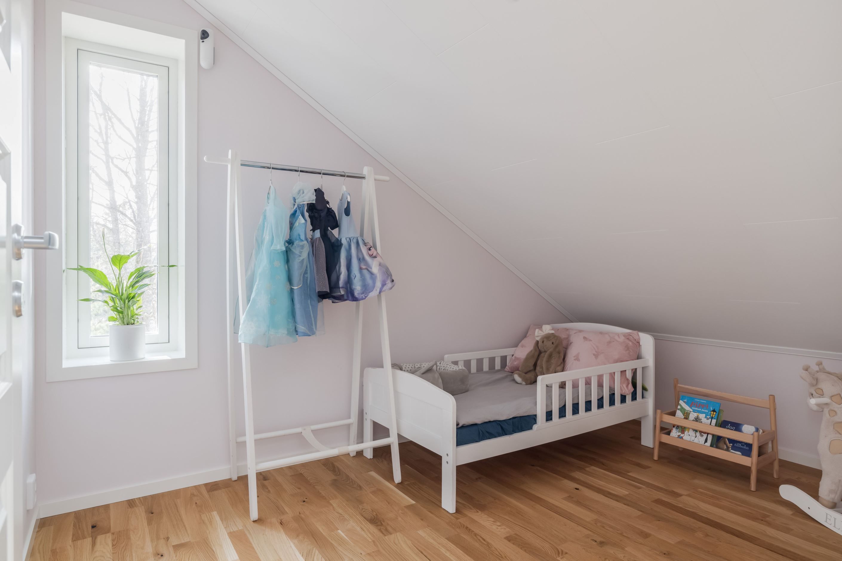 Övervåningen utgör ett mer privat plan med fin takhöjd och flera takfönster som ger ett härligt ljusinsläpp. Här finns ett trivsamt allrum med plats för soffgrupp, två sovrum samt ett rymligt master bedroom med gott om plats för dubbelsäng och ytterligare möblering. Planlösningen kompletteras med wc samt goda förvaringsmöjligheter.