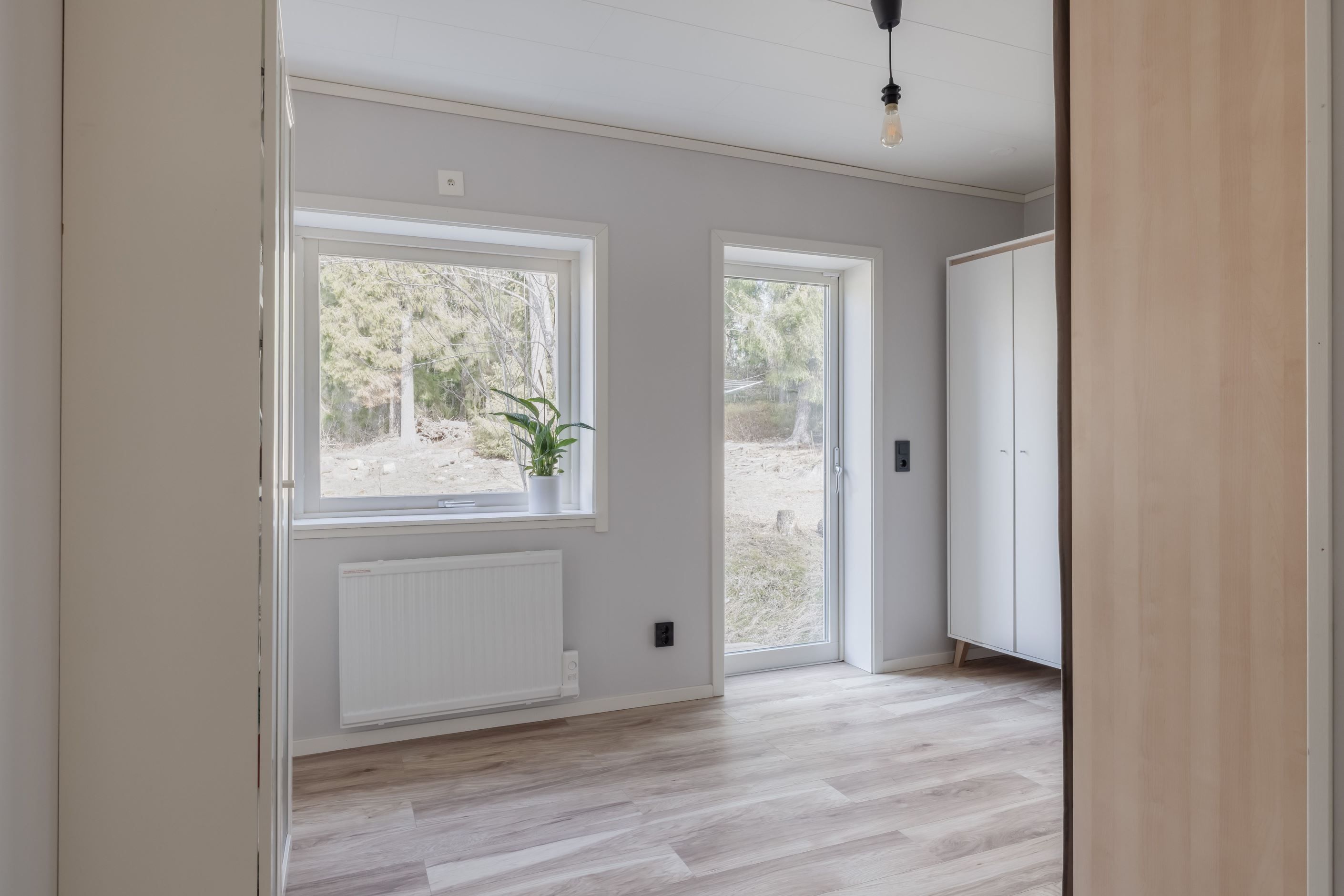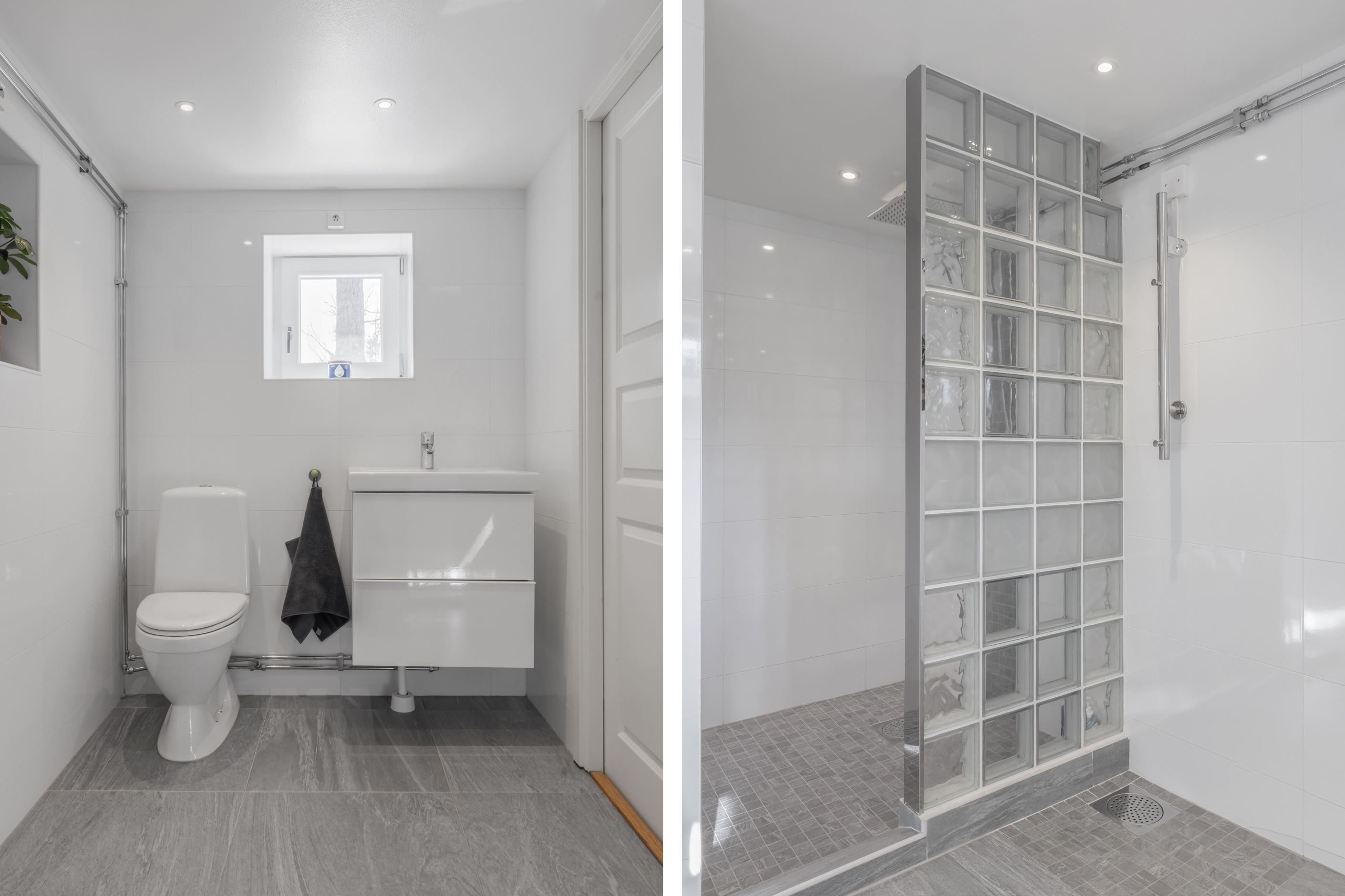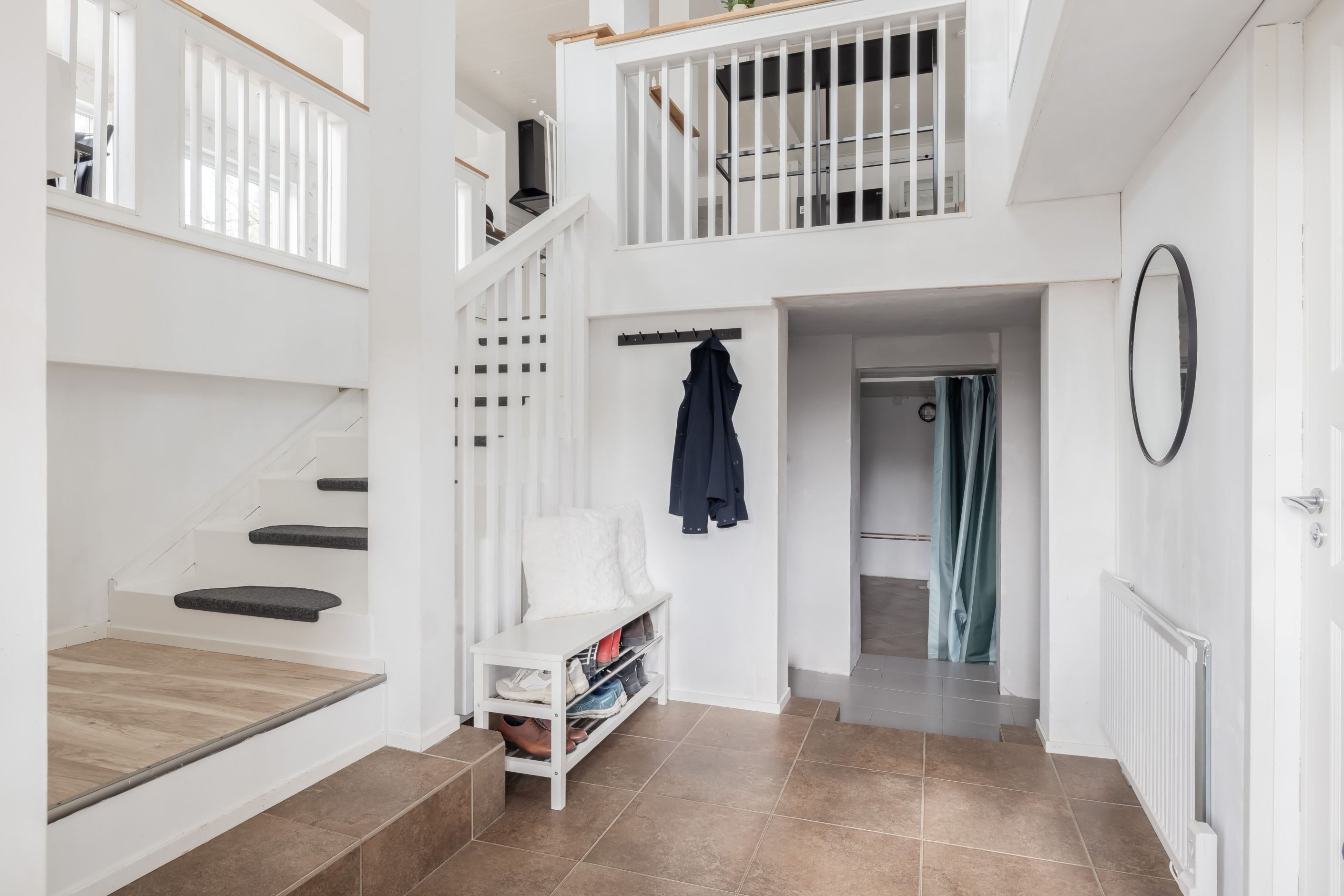 Invändigt möts du av en ljus och välkomnande entré med slitstarkt klinkergolv och golvvärme. Hallen är rymlig och ger en naturlig kontakt med husets övriga delar. I direkt anslutning finns ett helkaklat badrum utrustat med duschhörna, wc och kommod, där ett fönster bidrar med fint ljusinsläpp.