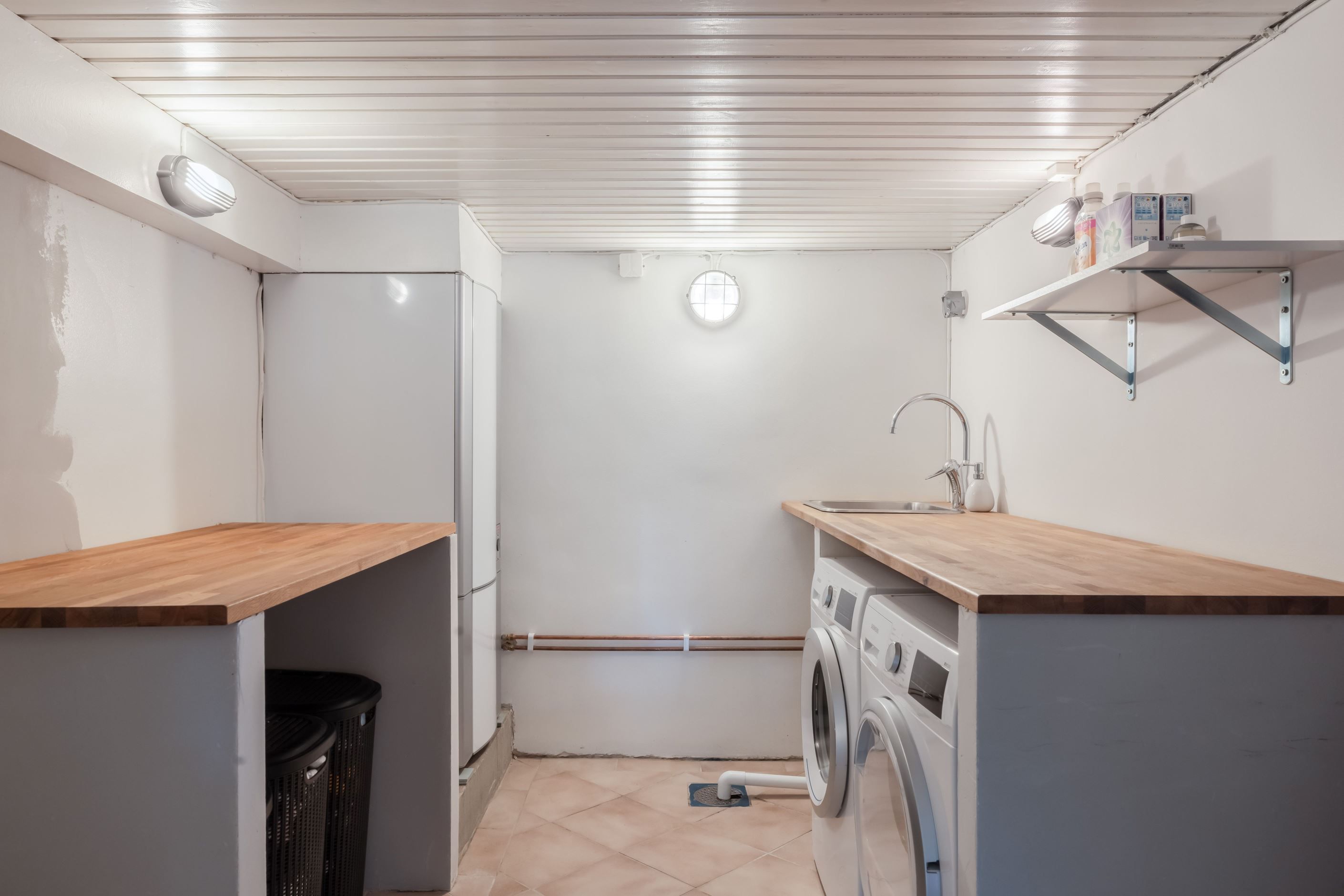 Från entréplanet nås även husets praktiska ytor i källarplan, med goda förvaringsmöjligheter, tvättstuga samt ytterligare utrymmen som kan anpassas efter behov, exempelvis hobbyrum eller förråd.