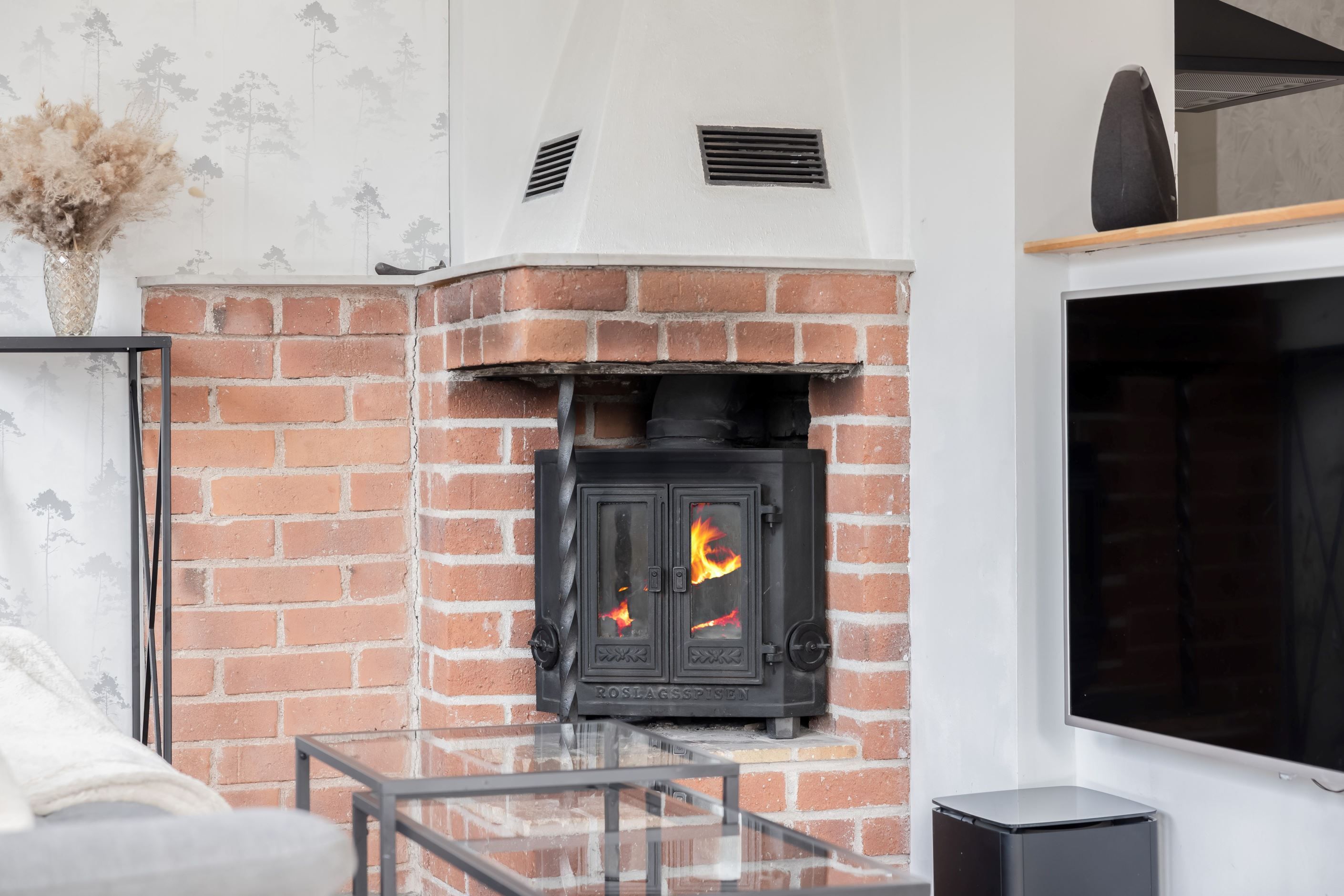 En trappa upp öppnar bostaden upp sig på ett tilltalande sätt. Här möts du av en luftig och social planlösning där kök och vardagsrum samspelar i en öppen och inbjudande miljö. De stora fönsterpartierna ger ett generöst ljusinsläpp och skapar en fin kontakt med omgivande natur. Här finns gott om plats för både större matgrupp och soffdel. Den öppna spisen med insats bidrar med både värme och en naturlig samlingspunkt under årets kallare månader. Köket är funktionellt utrustat med spishäll, fläkt, kyl och frys samt diskmaskin, och kompletteras av en vedspis som tillför karaktär och charm.