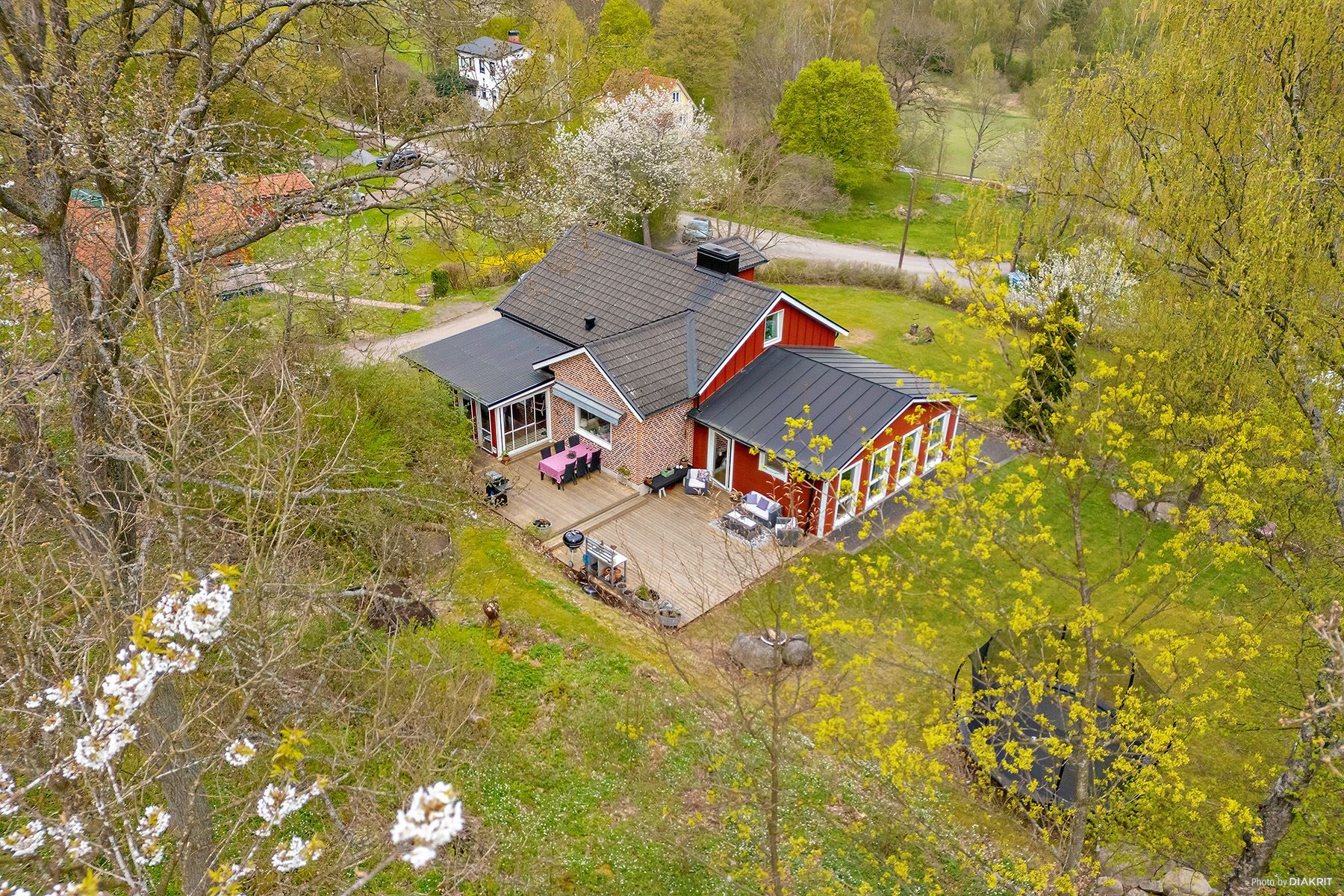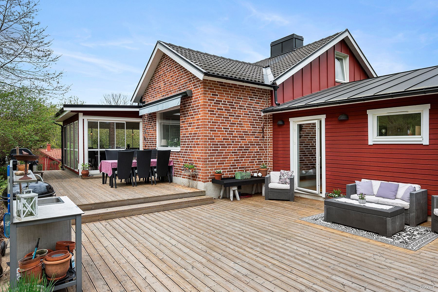 Entréplanet erbjuder en välkomnande hall, fyra sovrum samt ett helkaklat badrum. I husets centrum finner du generösa sociala ytor med vardagsrum, matsal och ett stilrent kök med bardel – perfekt för både familjeliv och sociala tillställningar. Köket bjuder på en mysig atmosfär med kamin och vacker utsikt mot trädgården genom stora fönsterpartier. Från köket leder dörrarna vidare ut till ett inglasat uterum som övergår i ett stort träddäck på baksidan – idealiskt för sommarhalvåret.