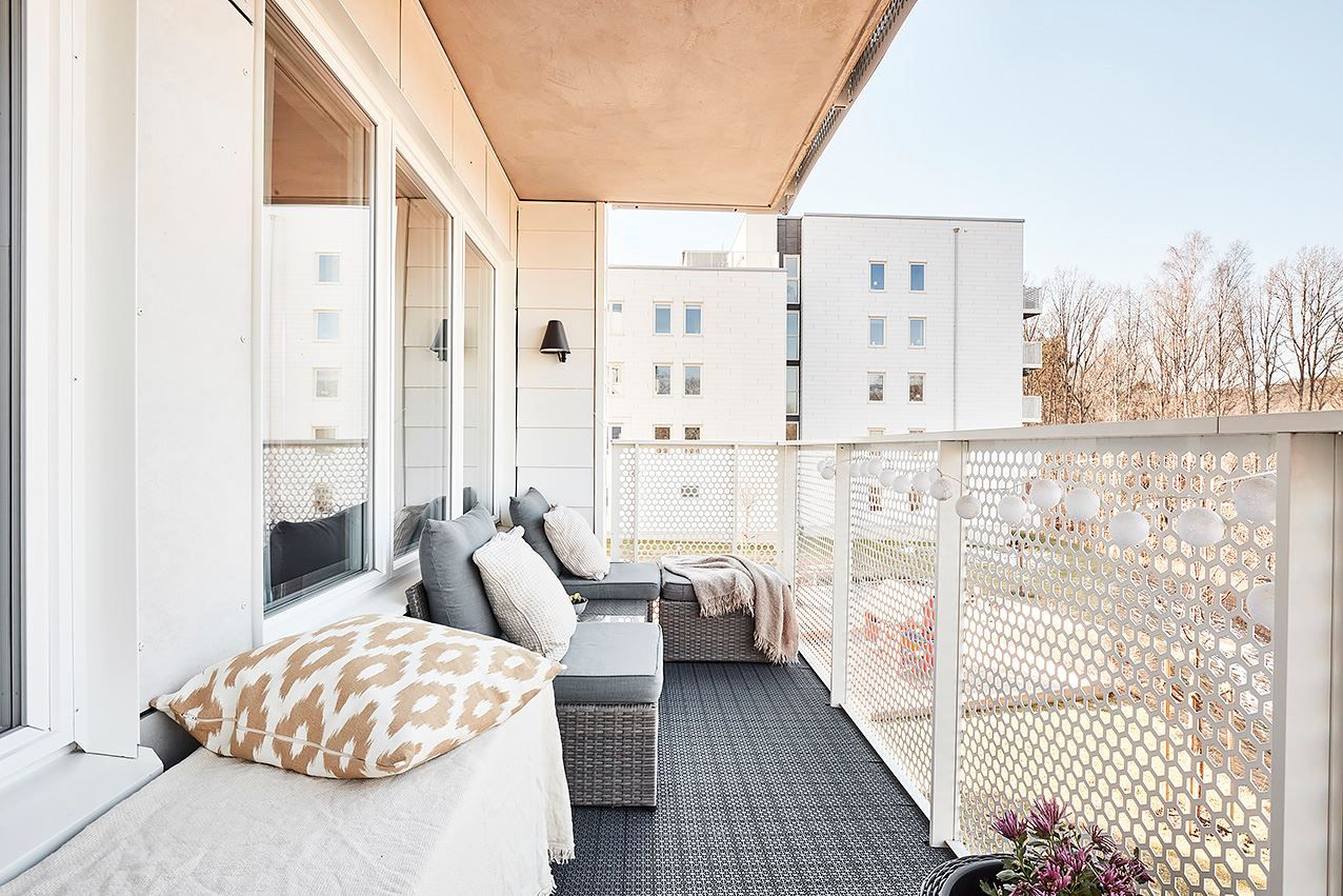 Fin och lummig miljö mot skogen från balkong gör utsiktsläget påtagligt. Här spenderas garanterat många grillkvällar med familj och vänner. På gården finns ytterligare grillmöjligheter, lekplatser och grönyta för barnaspring.