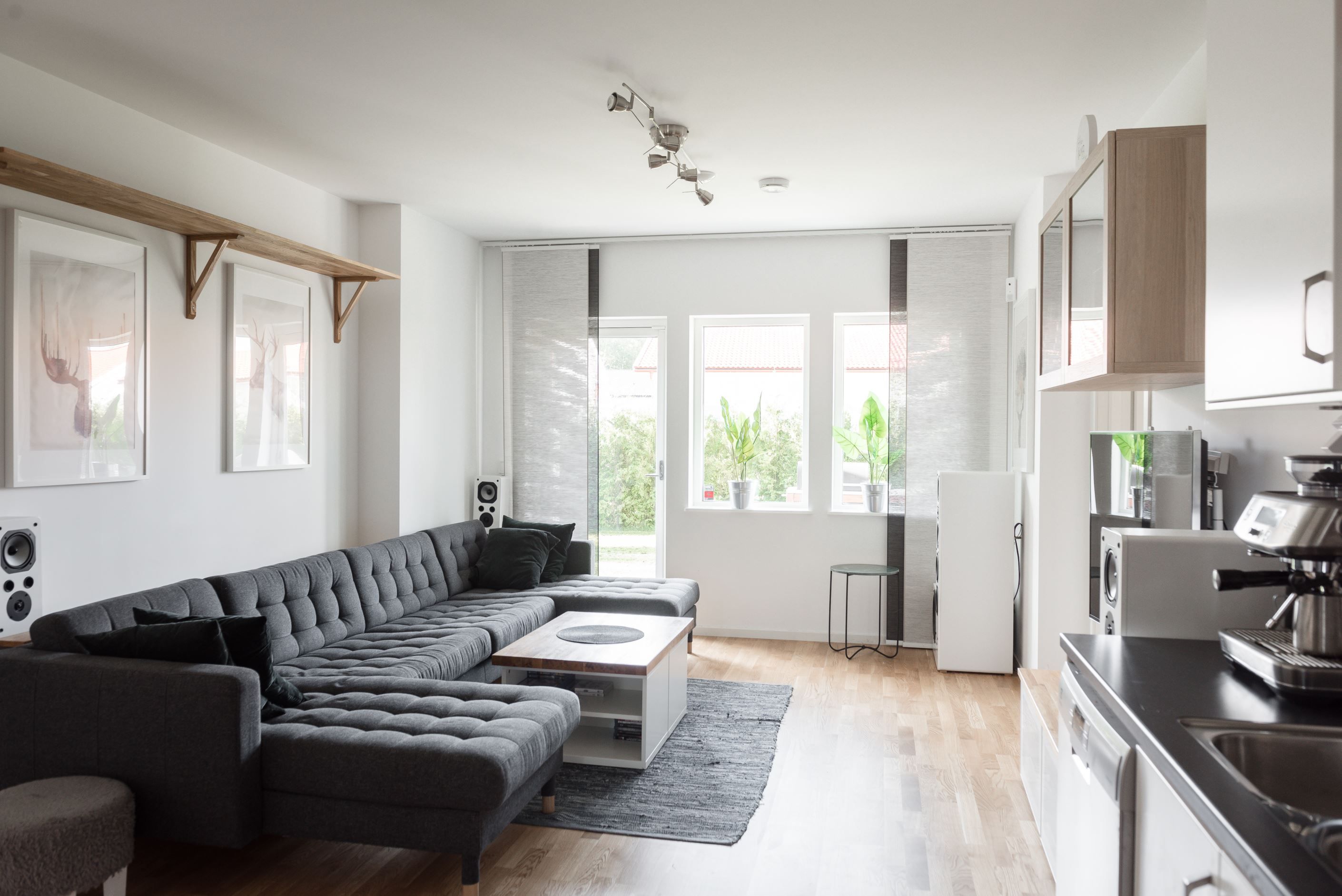 Väl tilltaget helkaklat badrum med tvättmaskin och torktumlare. Ljust kök med separat matplats (går att bygga om till ett fjärde sovrum). Vardagsrum med utgång till altanen där solen värmer från morgon till eftermiddag.
