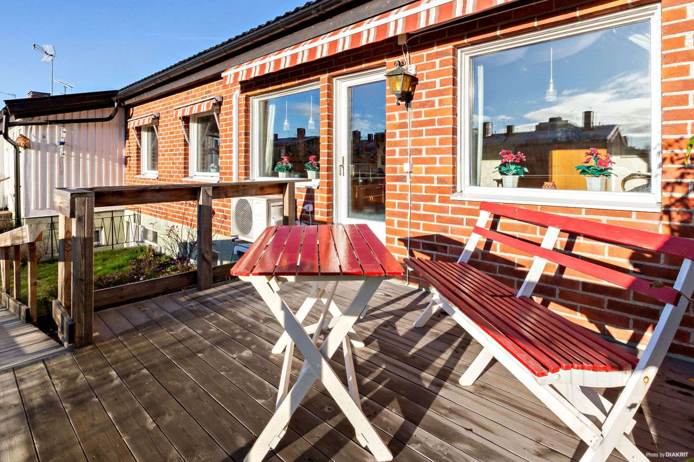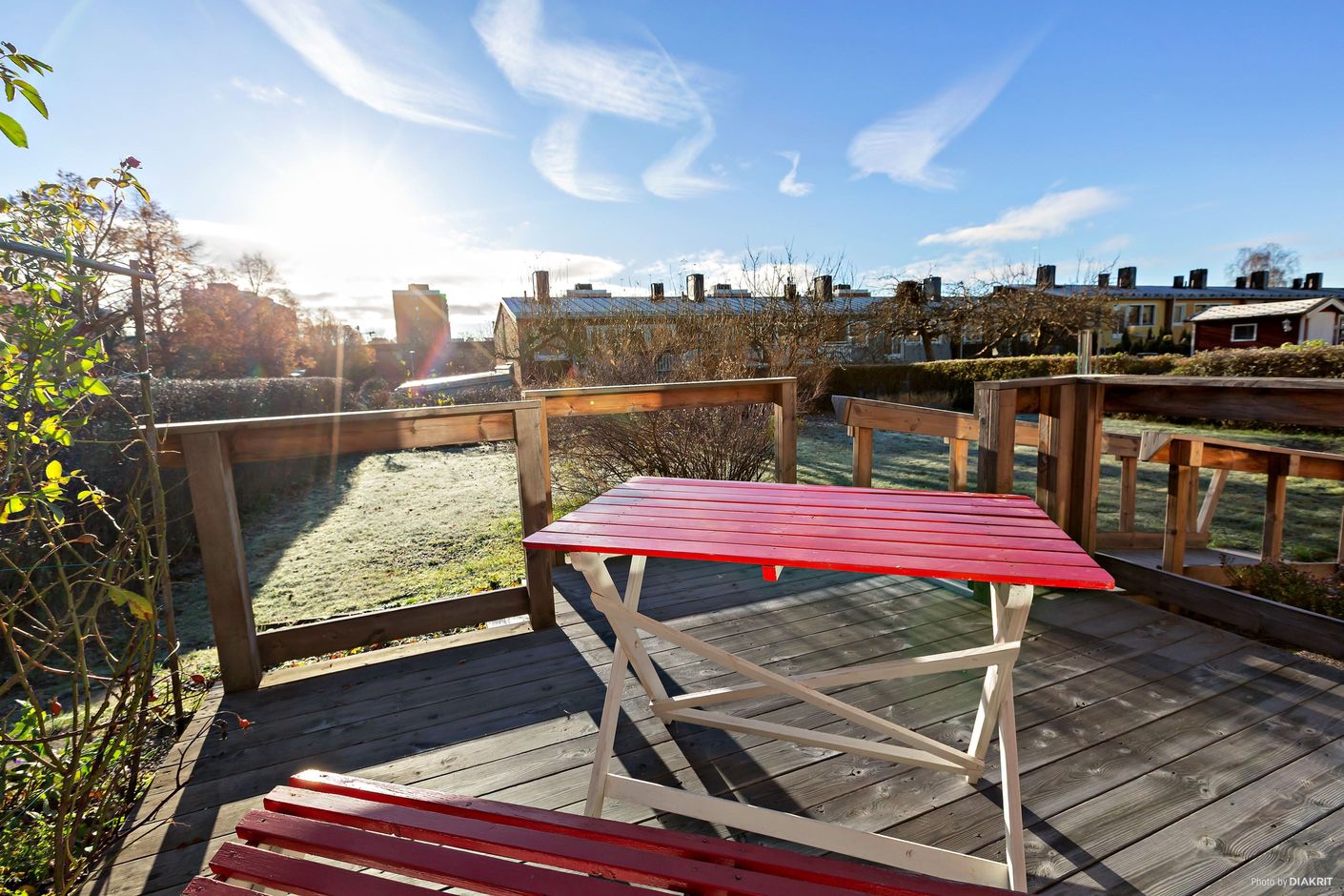 Trädäcksförsedd altan/uteplats på baksidan, i soligt söderläge