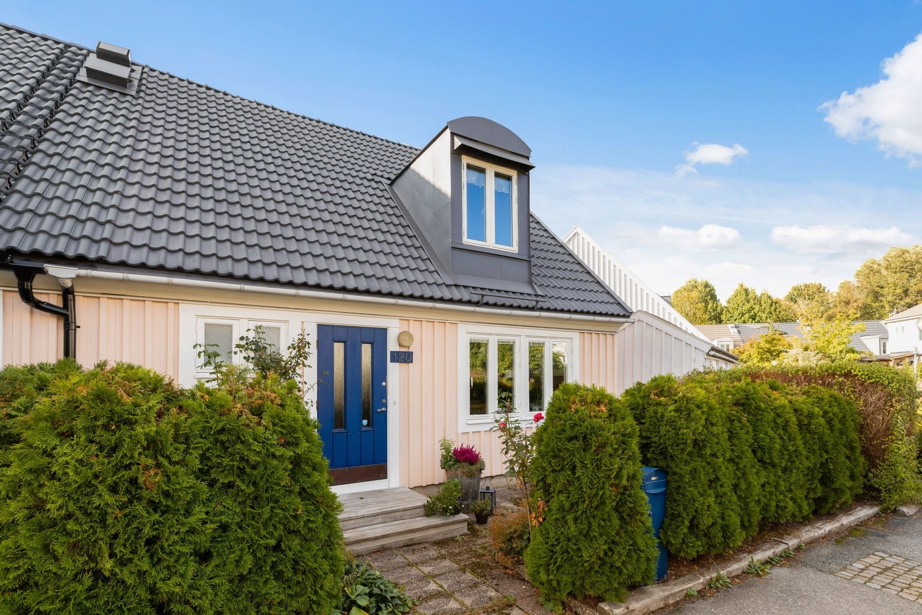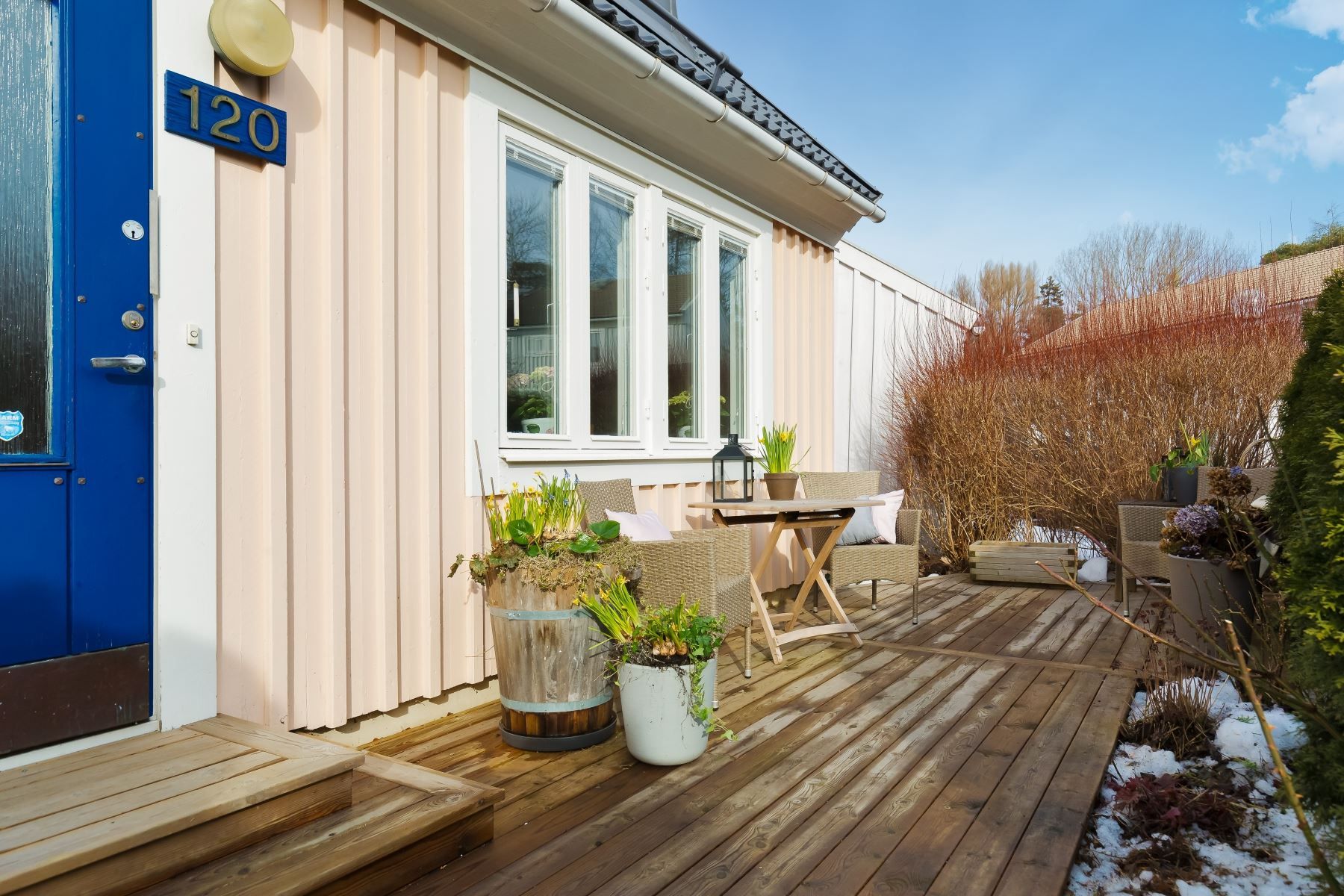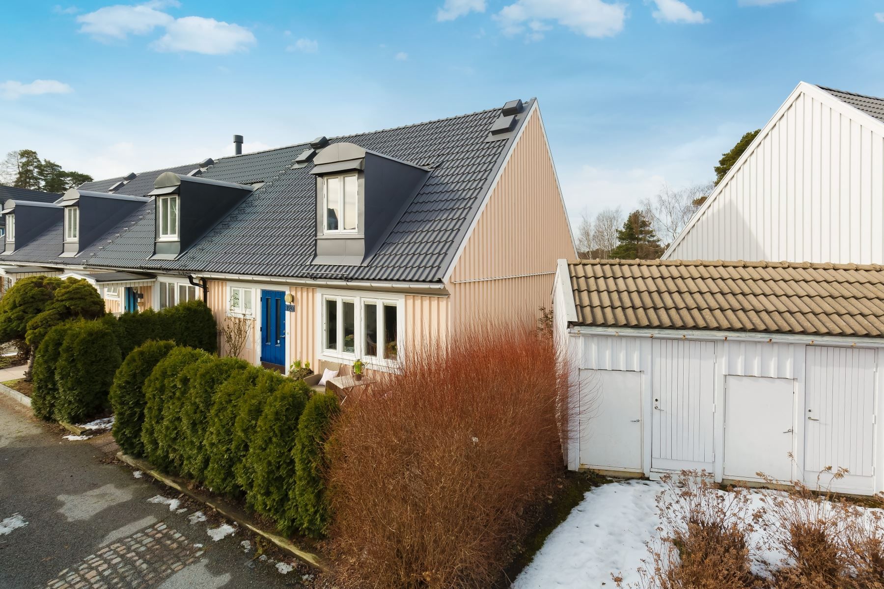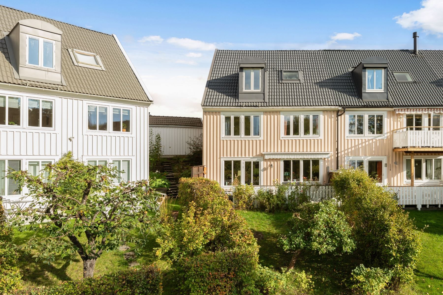 Största modellen av radhus om 3 plan! Detta hus har ett fantastiskt gavelläge med tomt i väster mot Järvafältets grönskande ängar och kvällssolen. På framsidan finns en ny träaltan där du kan avnjuta frukosten i morgonsolen. Där finns också rabatter med rosor och vårblommor. Fördelaktig planlösning med ingång på det mellersta planet där du har direkt access till ett badrum samt kök. Ett hus som kan skräddarsys efter era behov då det går att forma planlösningen på flertalet sätt. Sovrummen på entréplanet kan göras om till ett vardagsrum och vardagsrummet på nedre planet kan göras om till sovrum. På baksidan finns stor altan i västerläge med sol från tidig eftermiddag till solen går ner. Gräsmatta, ett äppelträd, röda vinbär och på sommaren kan du hitta smultron. Gott om plats på den insynsskyddade altanen för matbord, grill och loungemöbler.