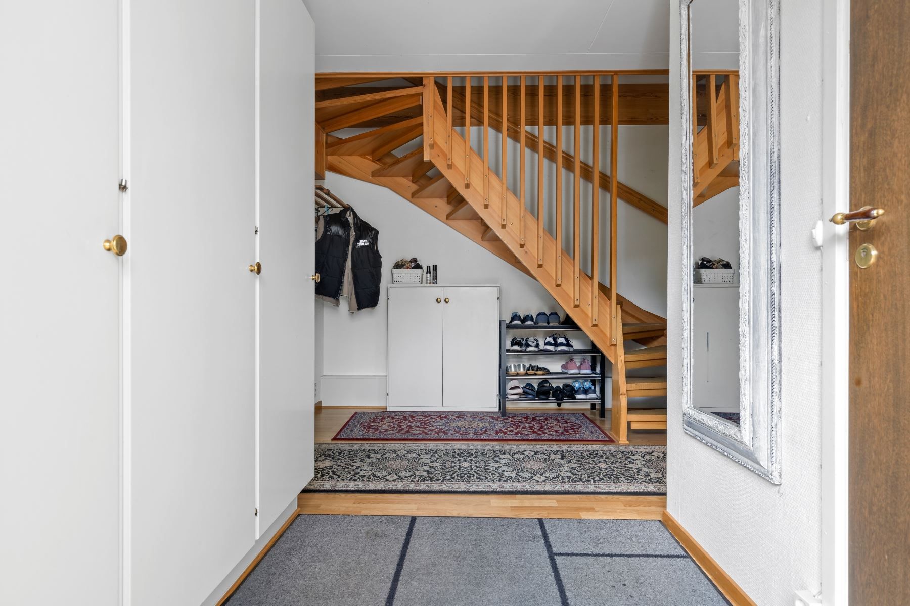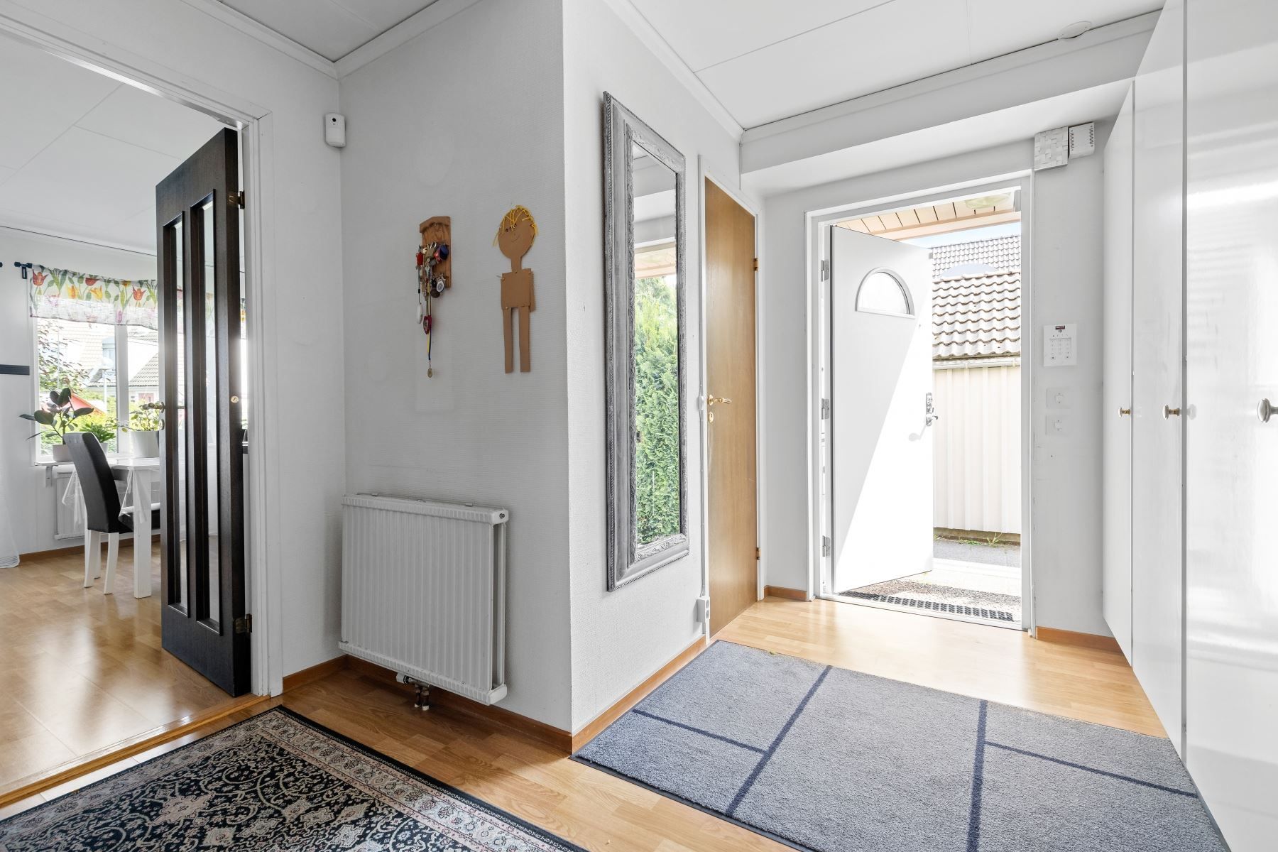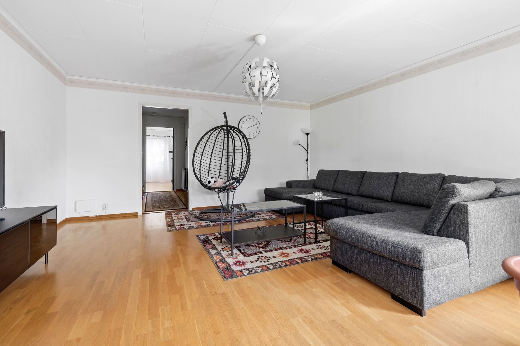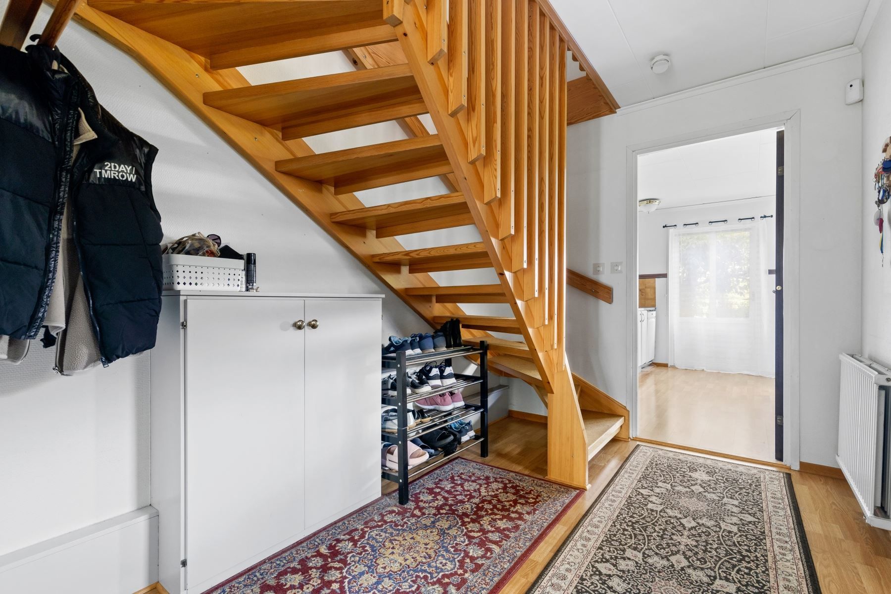 Kliv över tröskeln in i den välkomnade hallen med gott om plats för avhägning. Vardagsrummet som är bostadens givna samlingspunkt erbjuder sociala ytor och goda möjligheter till att möblera efter egna preferenser. Vidare finns ett välutrustat kök med gott om arbetsyta och förvaring bakom vita skåpsluckor. Utrustningen består av kyl, frys, ugn, spis, fläkt, diskmaskin och mikrovågsugn. På nedre plan finns även en gäst-WC med dusch och kaklade väggar.