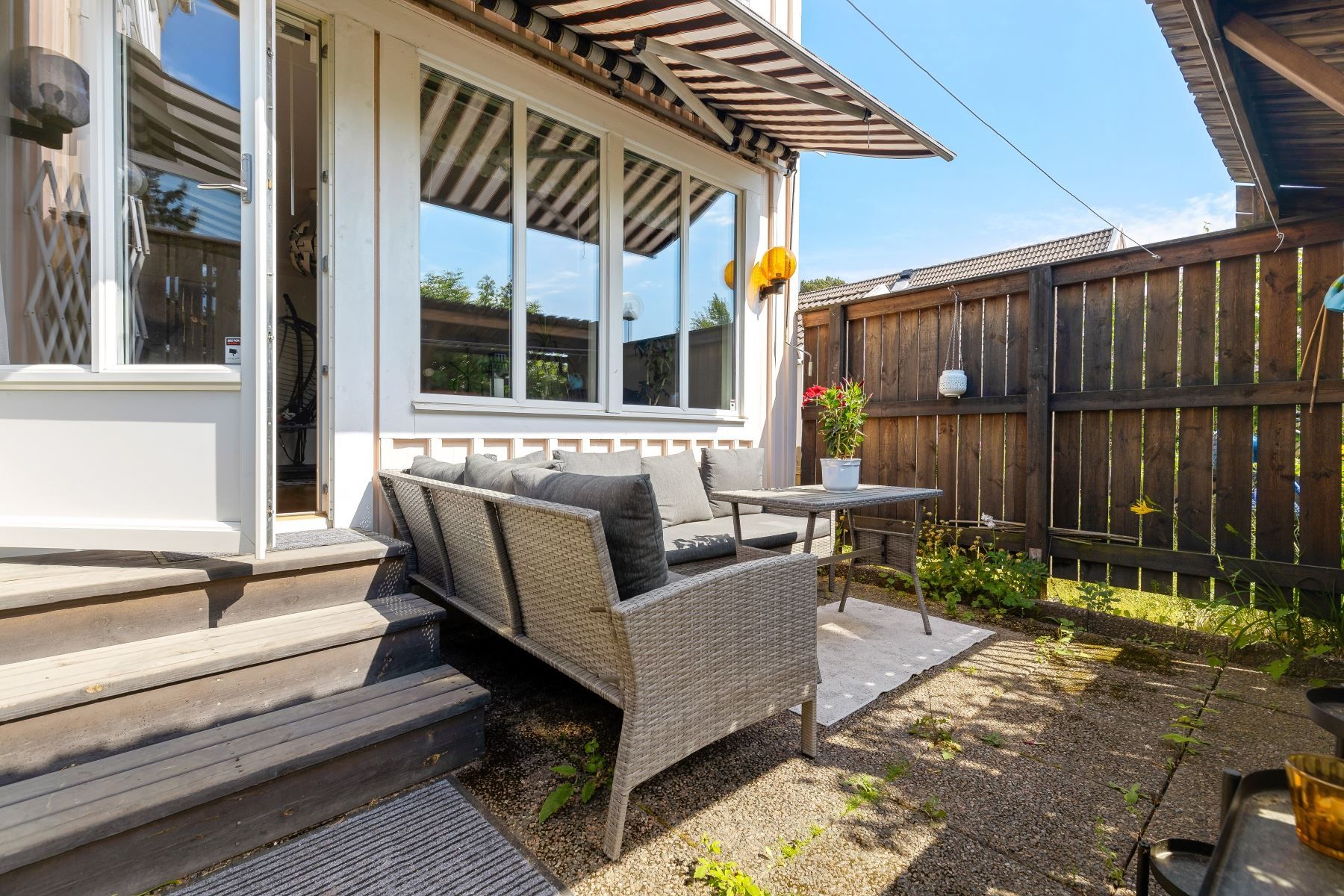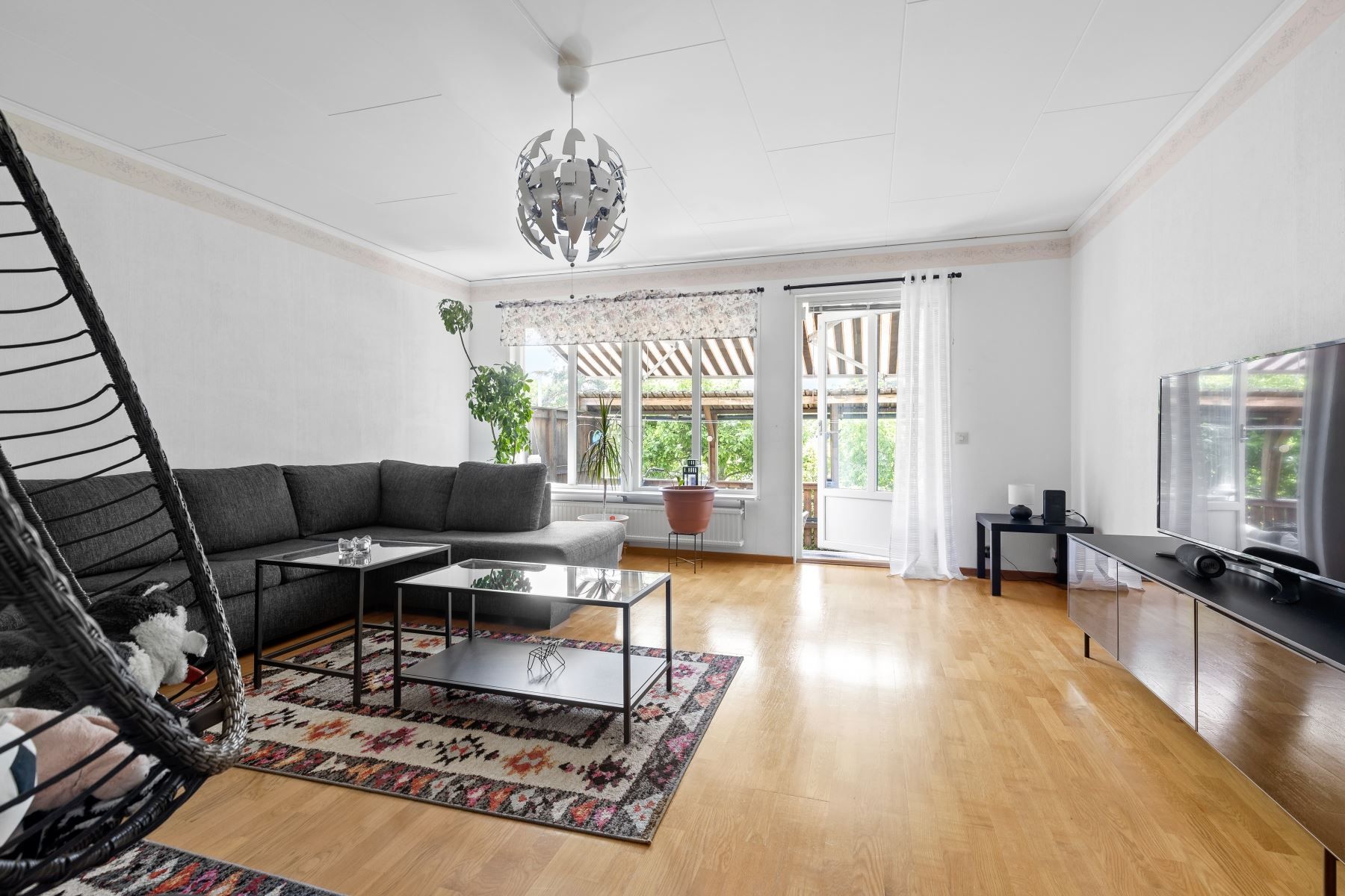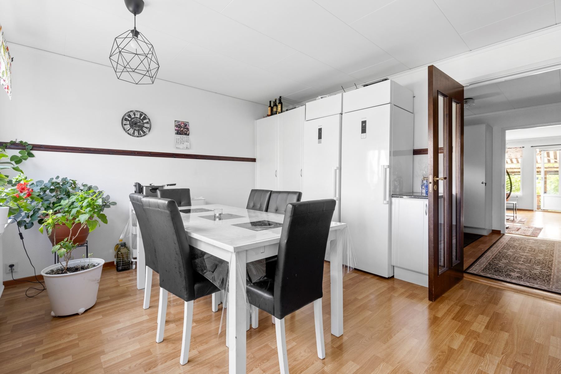 Kliv över tröskeln in i den välkomnade hallen med gott om plats för avhägning. Vardagsrummet som är bostadens givna samlingspunkt erbjuder sociala ytor och goda möjligheter till att möblera efter egna preferenser. Vidare finns ett välutrustat kök med gott om arbetsyta och förvaring bakom vita skåpsluckor. Utrustningen består av kyl, frys, ugn, spis, fläkt, diskmaskin och mikrovågsugn. På nedre plan finns även en gäst-WC med dusch och kaklade väggar.