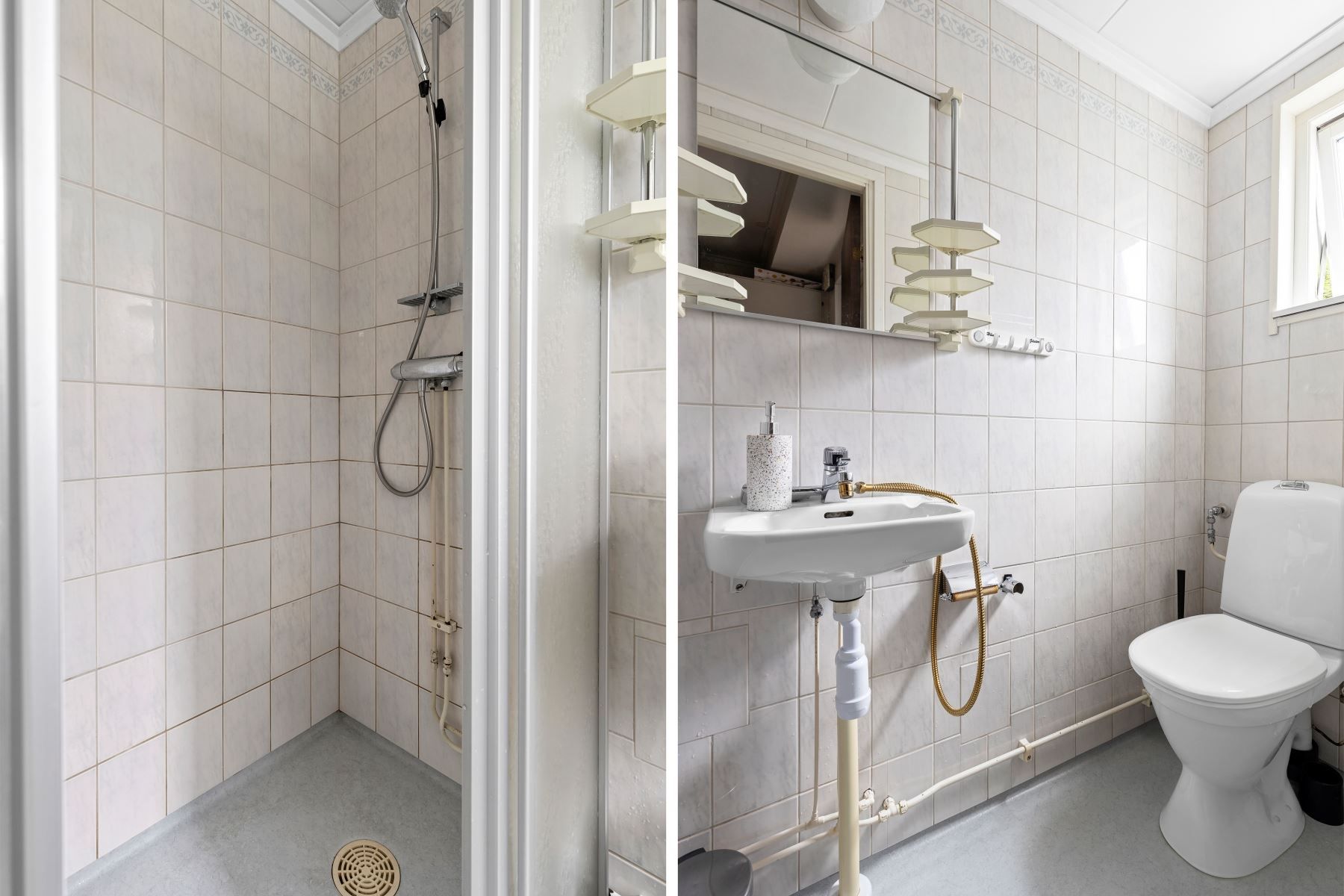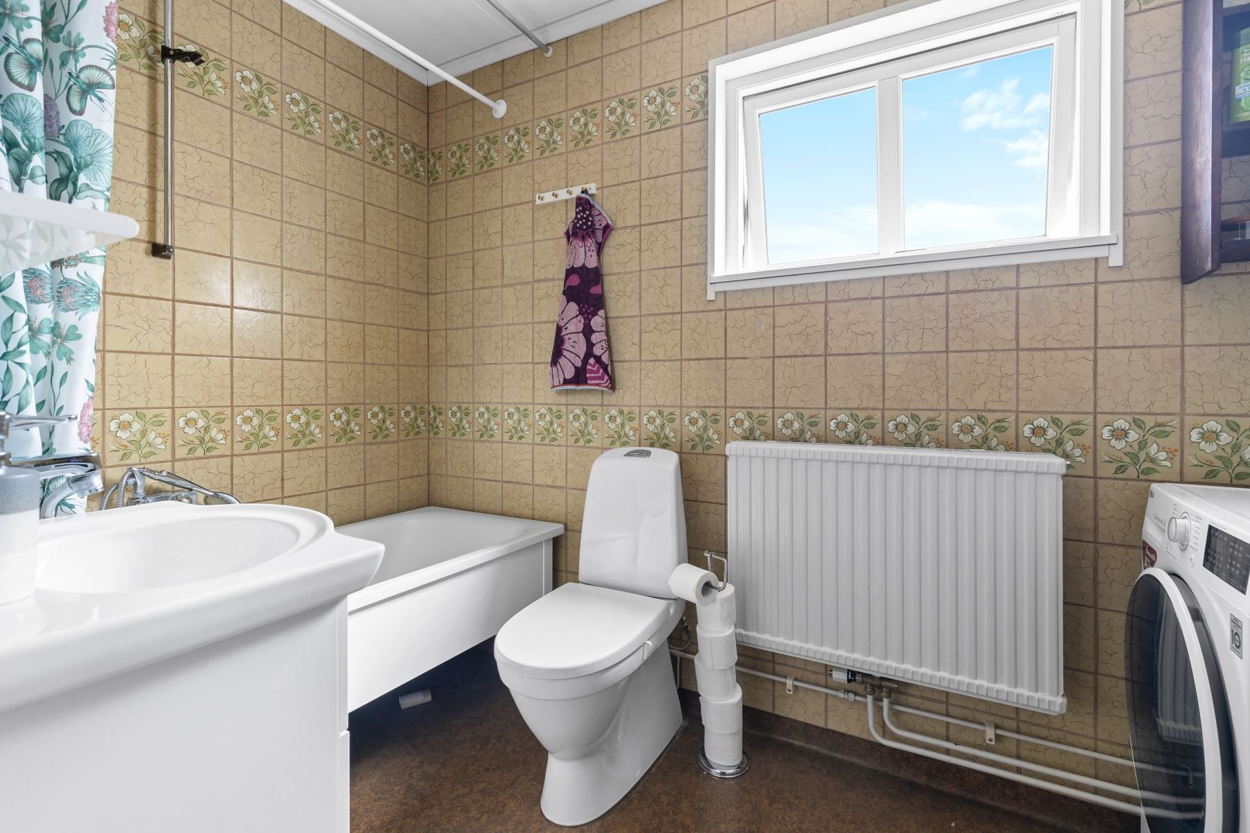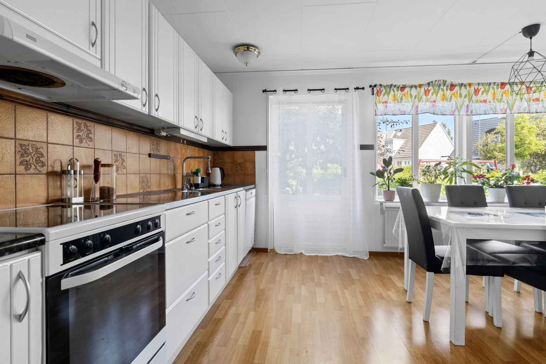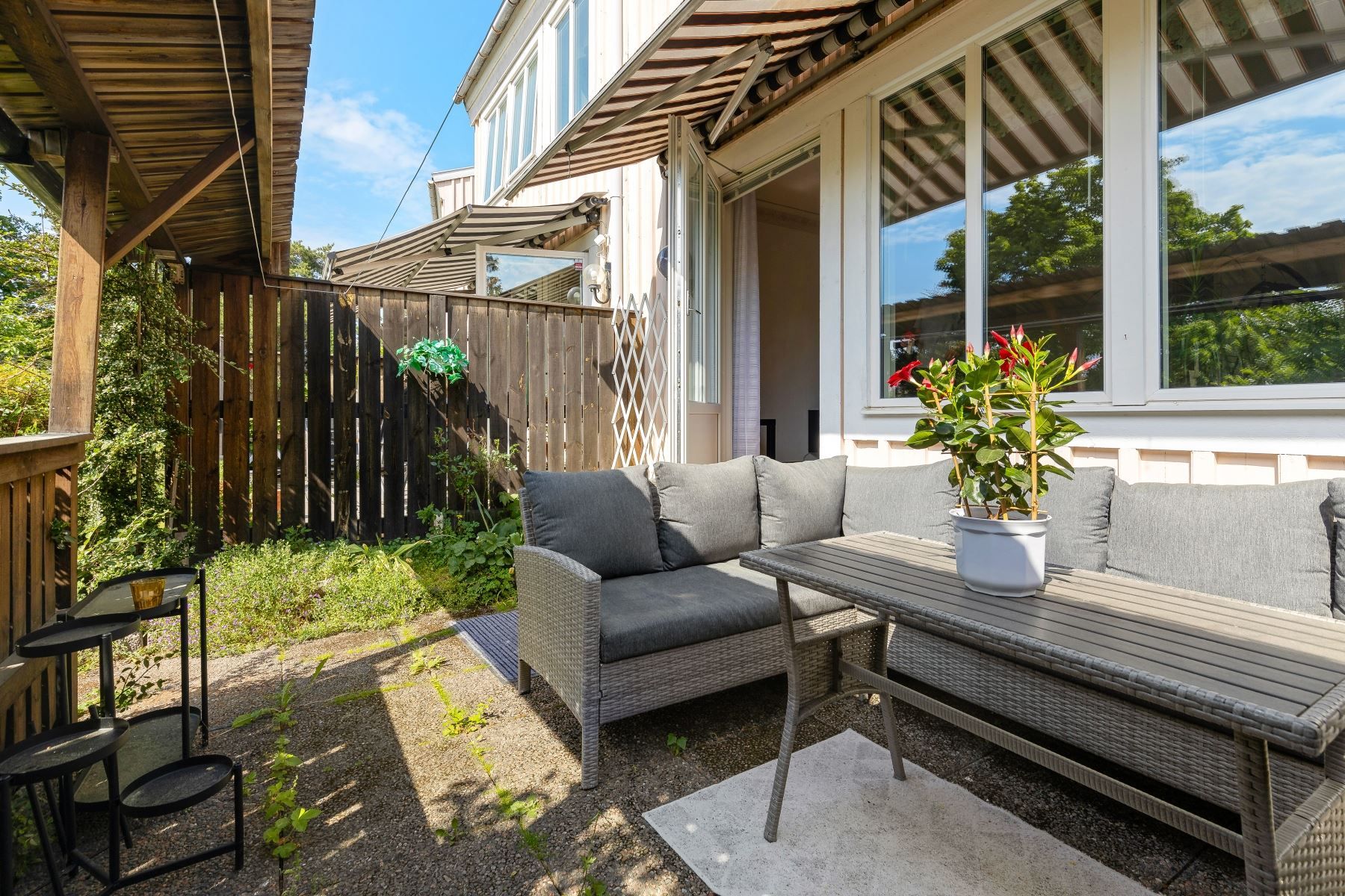 Kliv över tröskeln in i den välkomnade hallen med gott om plats för avhägning. Vardagsrummet som är bostadens givna samlingspunkt erbjuder sociala ytor och goda möjligheter till att möblera efter egna preferenser. Vidare finns ett välutrustat kök med gott om arbetsyta och förvaring bakom vita skåpsluckor. Utrustningen består av kyl, frys, ugn, spis, fläkt, diskmaskin och mikrovågsugn. På nedre plan finns även en gäst-WC med dusch och kaklade väggar.