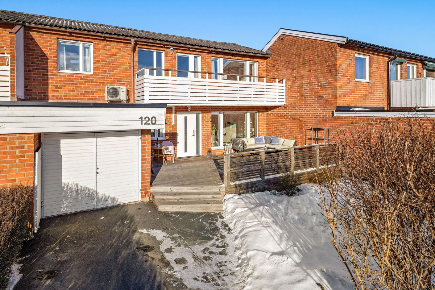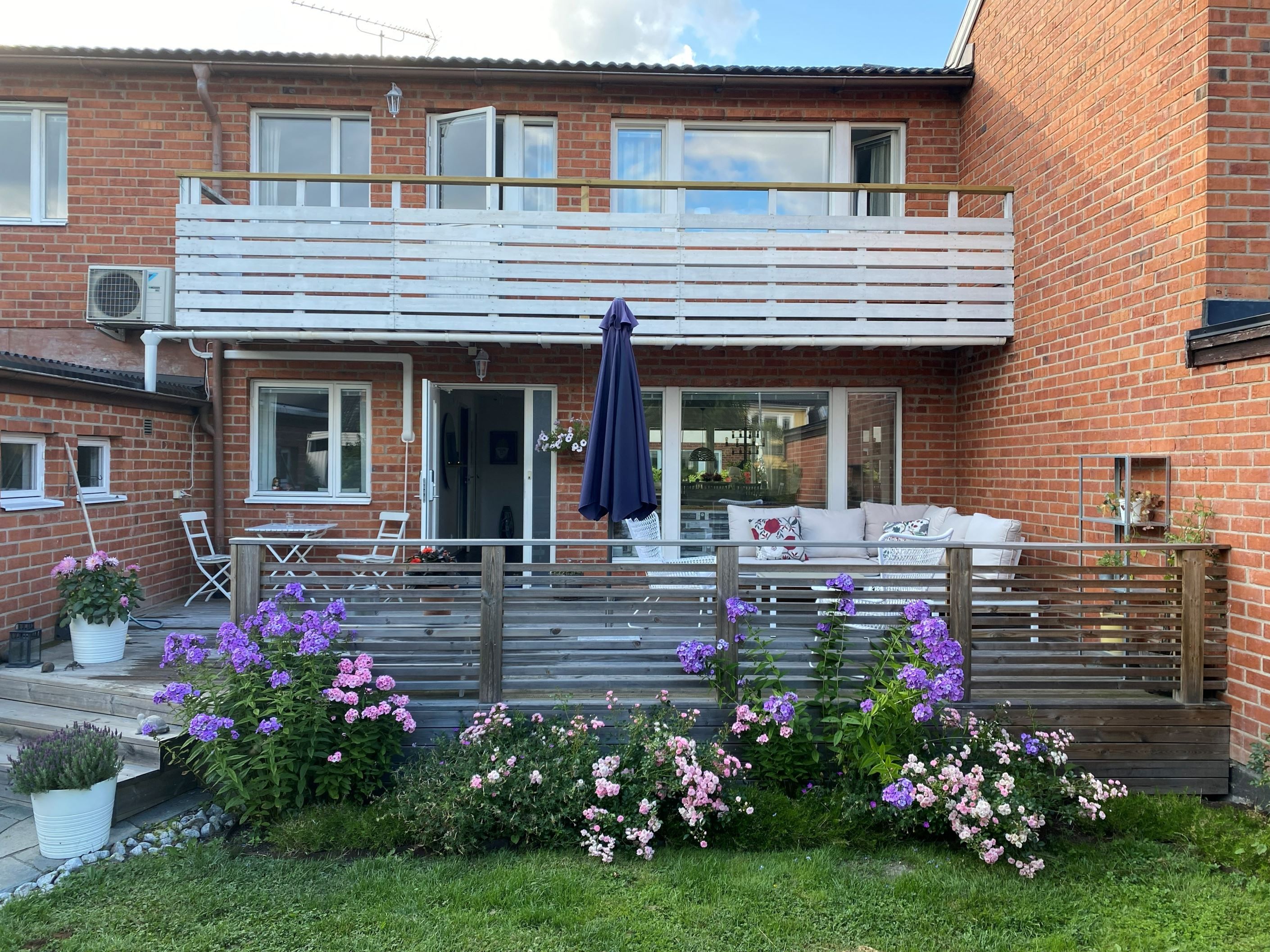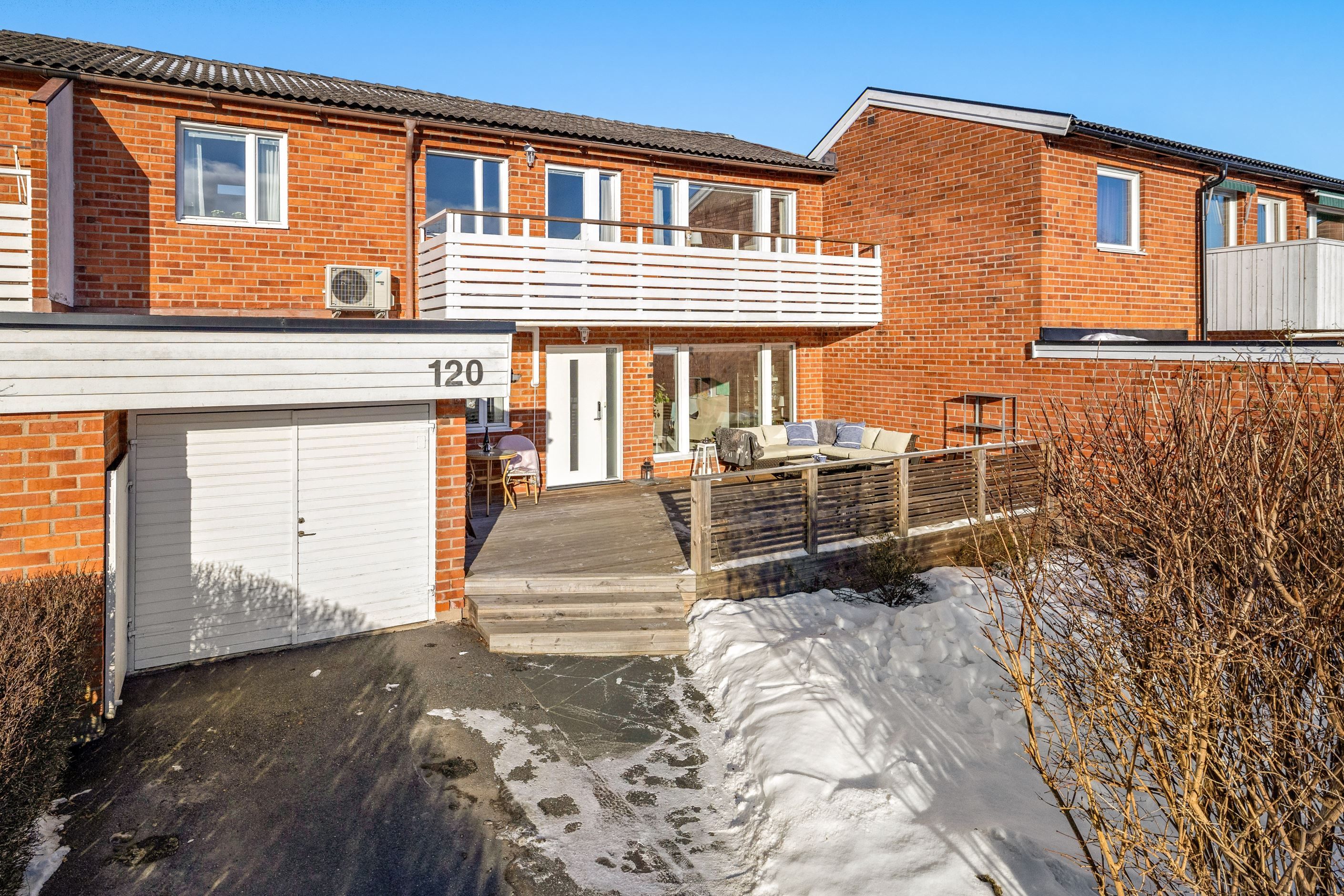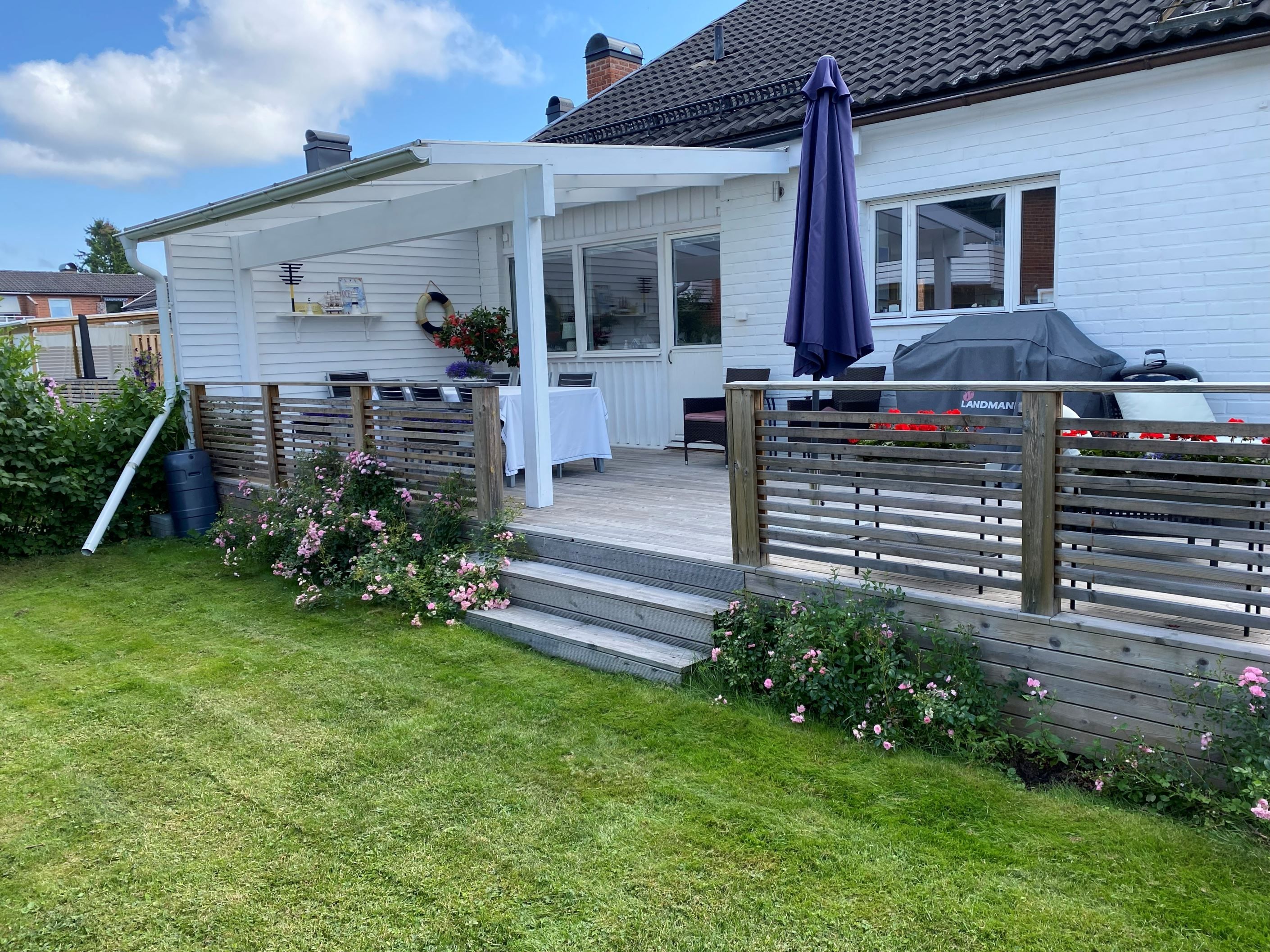 Utomhusmiljön är minst lika imponerande: Två stora soldränkta altaner erbjuder sol från morgon till kväll, den ena med tak för enkelhet och maximal avkoppling. En asfalterad uppfart leder fram till ett garage med lätt access direkt från huset, och mellan asfalt och altan knyts ytorna ihop med vackra skifferplattor.