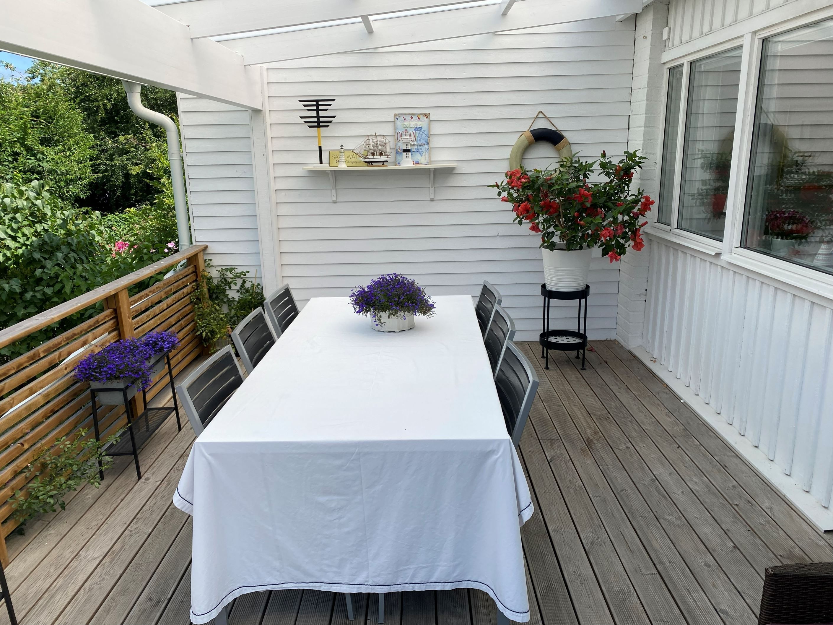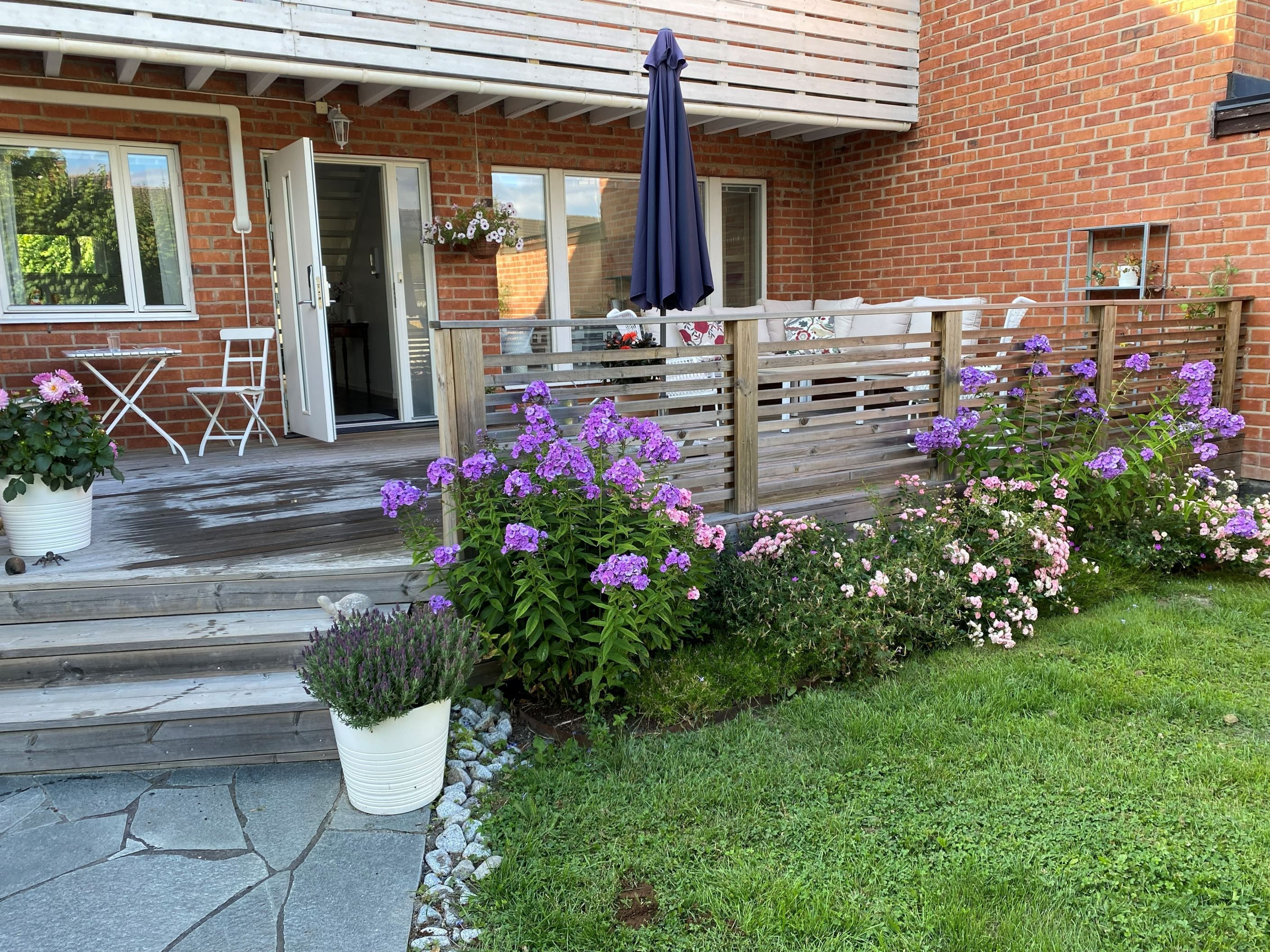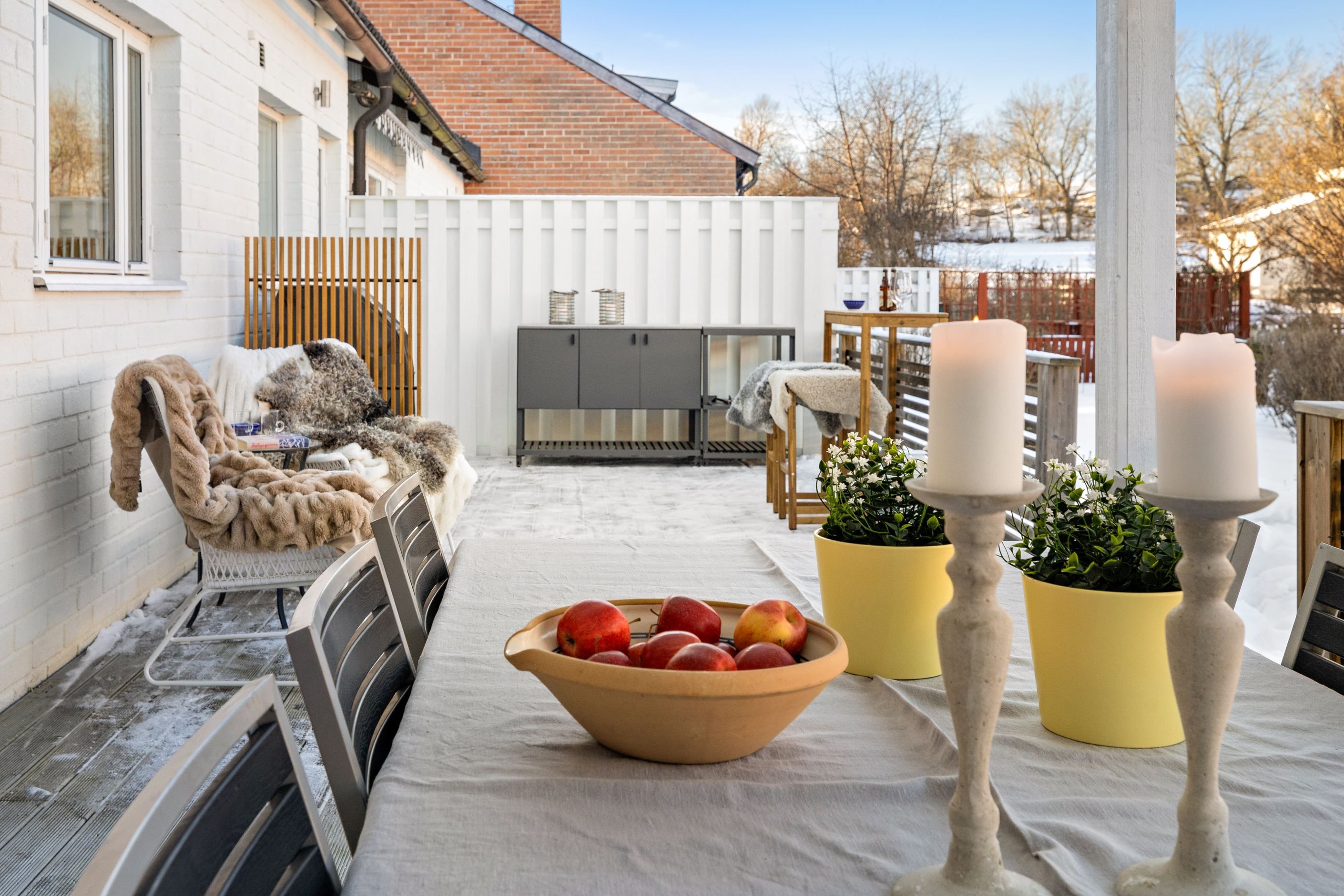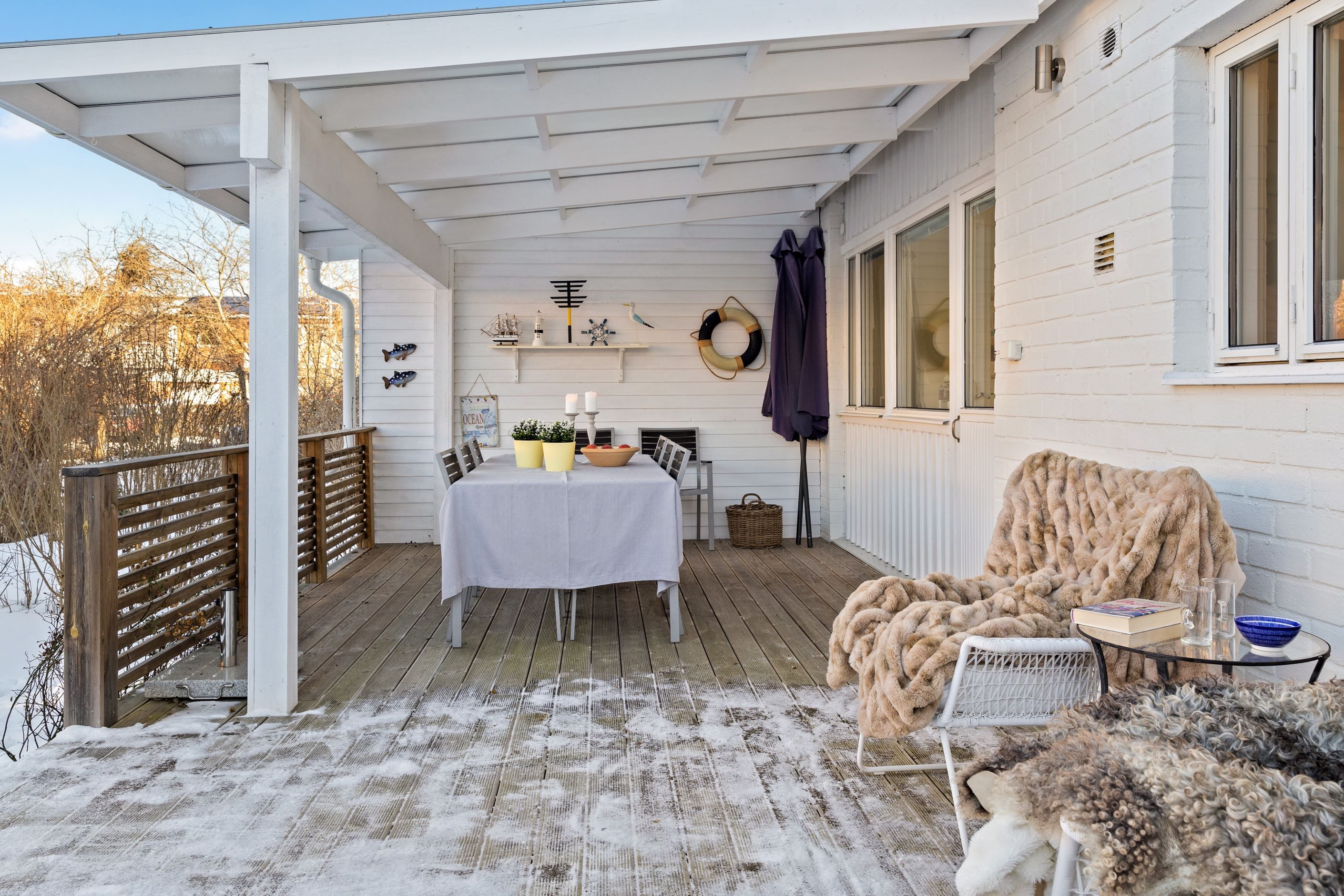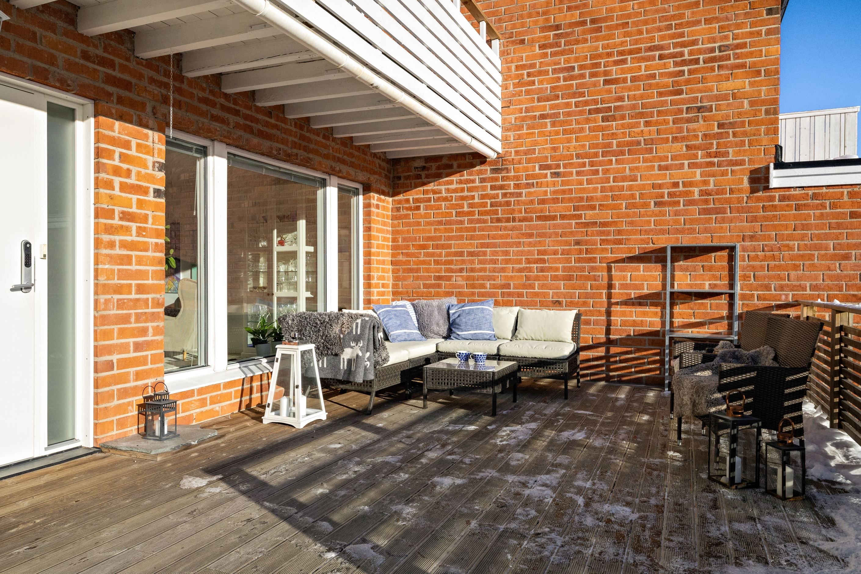 Utomhusmiljön är minst lika imponerande: Två stora soldränkta altaner erbjuder sol från morgon till kväll, den ena med tak för enkelhet och maximal avkoppling. En asfalterad uppfart leder fram till ett garage med lätt access direkt från huset, och mellan asfalt och altan knyts ytorna ihop med vackra skifferplattor.
