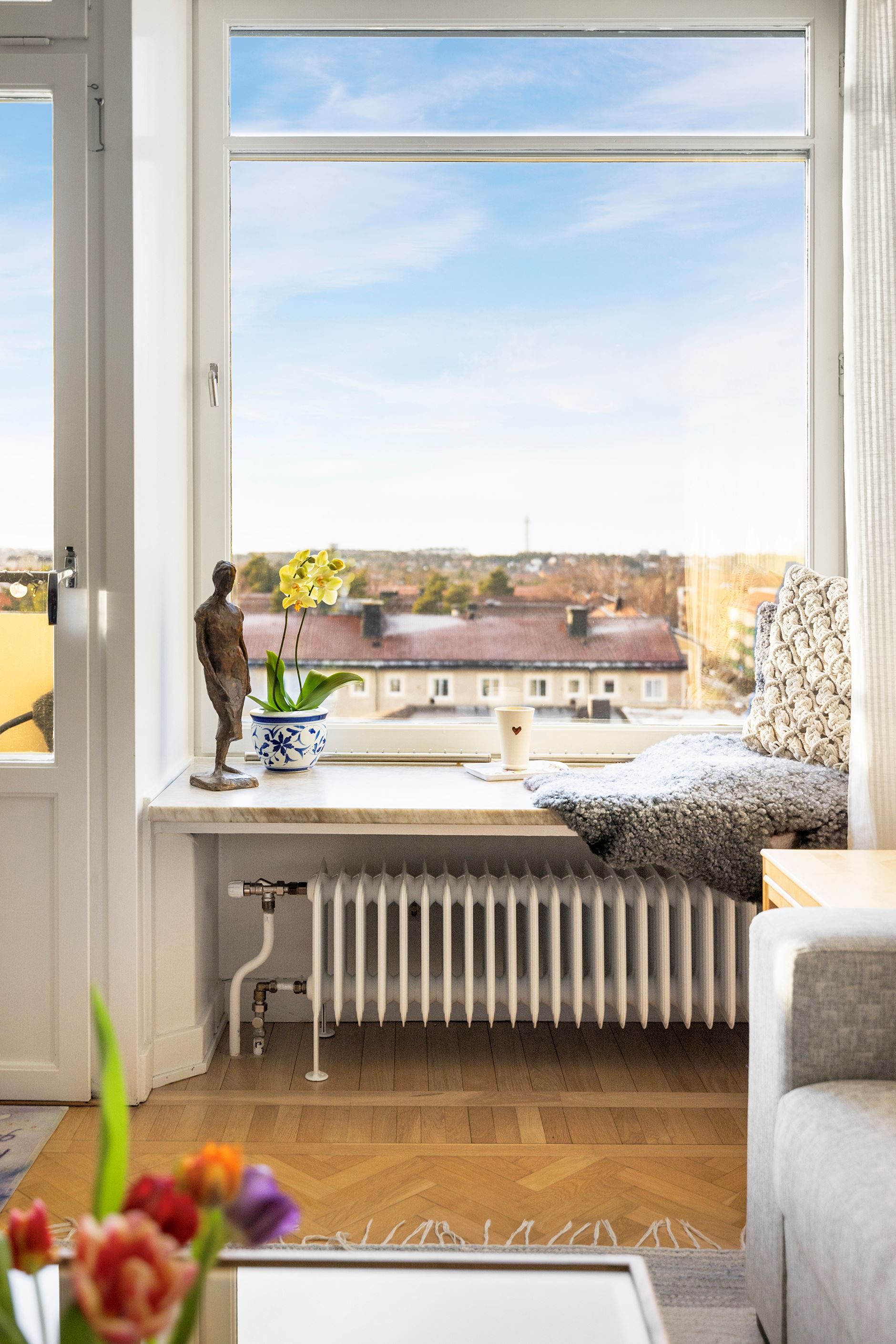 Det rymliga och luftiga vardagsrummet har ett härligt ljusinsläpp från det stora fönsterpartiet som har en djup fönsternisch som kan användas som sittplats för att njuta av utsikten. I vardagsrummet finns det gott om plats för en ordentlig soffgrupp, kommer det många vänner så finns det även plats för ett rejält matbord. Från vardagsrummet kommer man ut på balkongen, där man kan njuta av eftermiddags- och kvällssolen med en kopp kaffe eller en god middag.