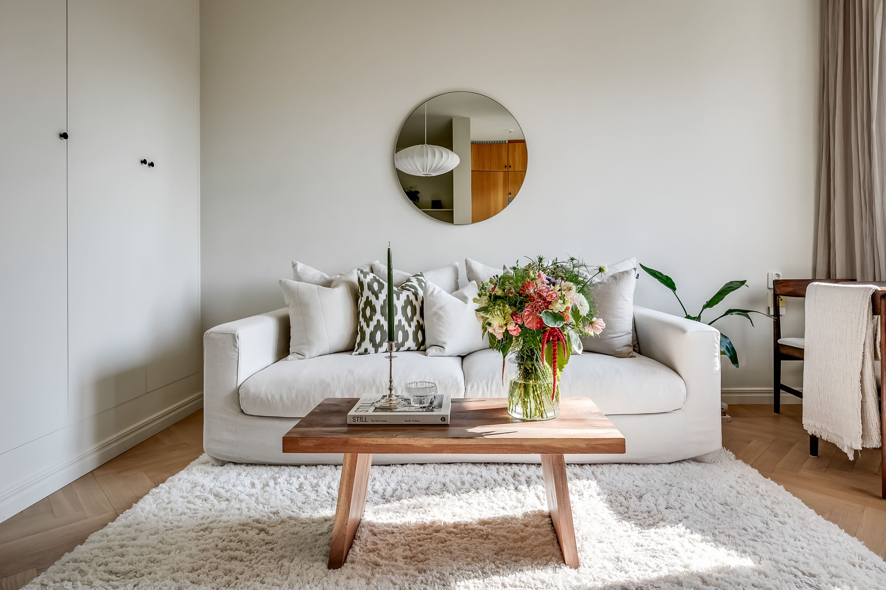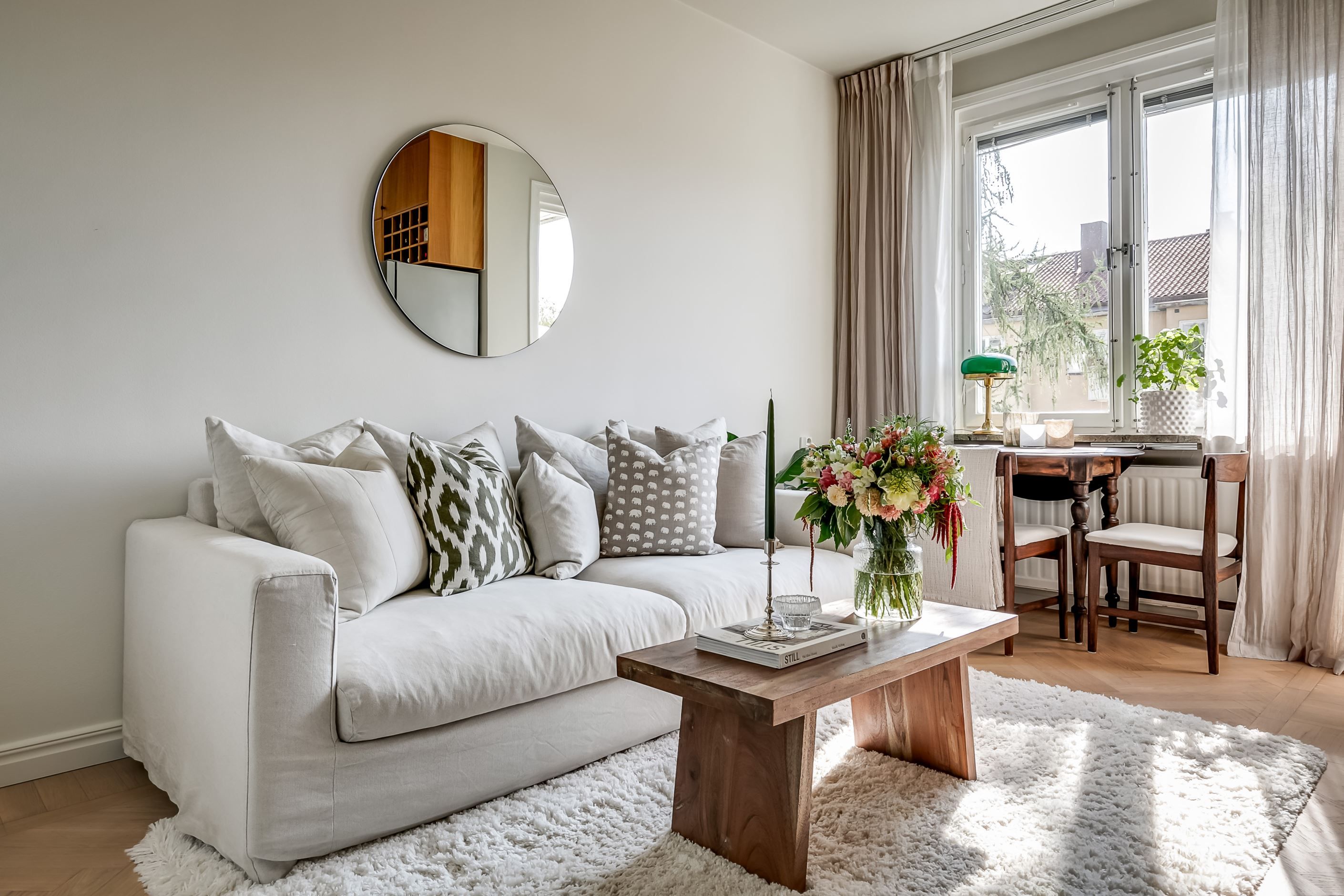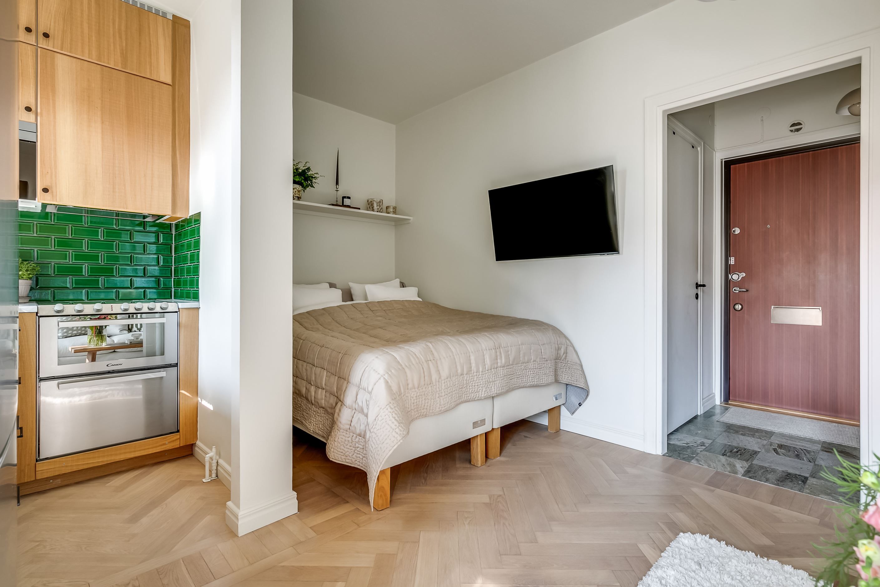 De 26 kvadratmeterna har en välkomnande hall med bra förvaring, allrum med sober färgsättning och stilren interiör, praktisk sovalkov, fullt utrustat kök med fönster och magiskt ljusinsläpp samt ett helkaklat och fräscht badrum med tvättmaskin. Tre stora fönster och halvglasad balkongdörr gör att ljuset i lägenheten fullkomligt flödar. Lägenheten är nyligen renoverad med nya ytskikt, slipad och behandlad fiskbensparkett samt exklusiv platsbyggd garderobslösning med ypperlig förvaring.