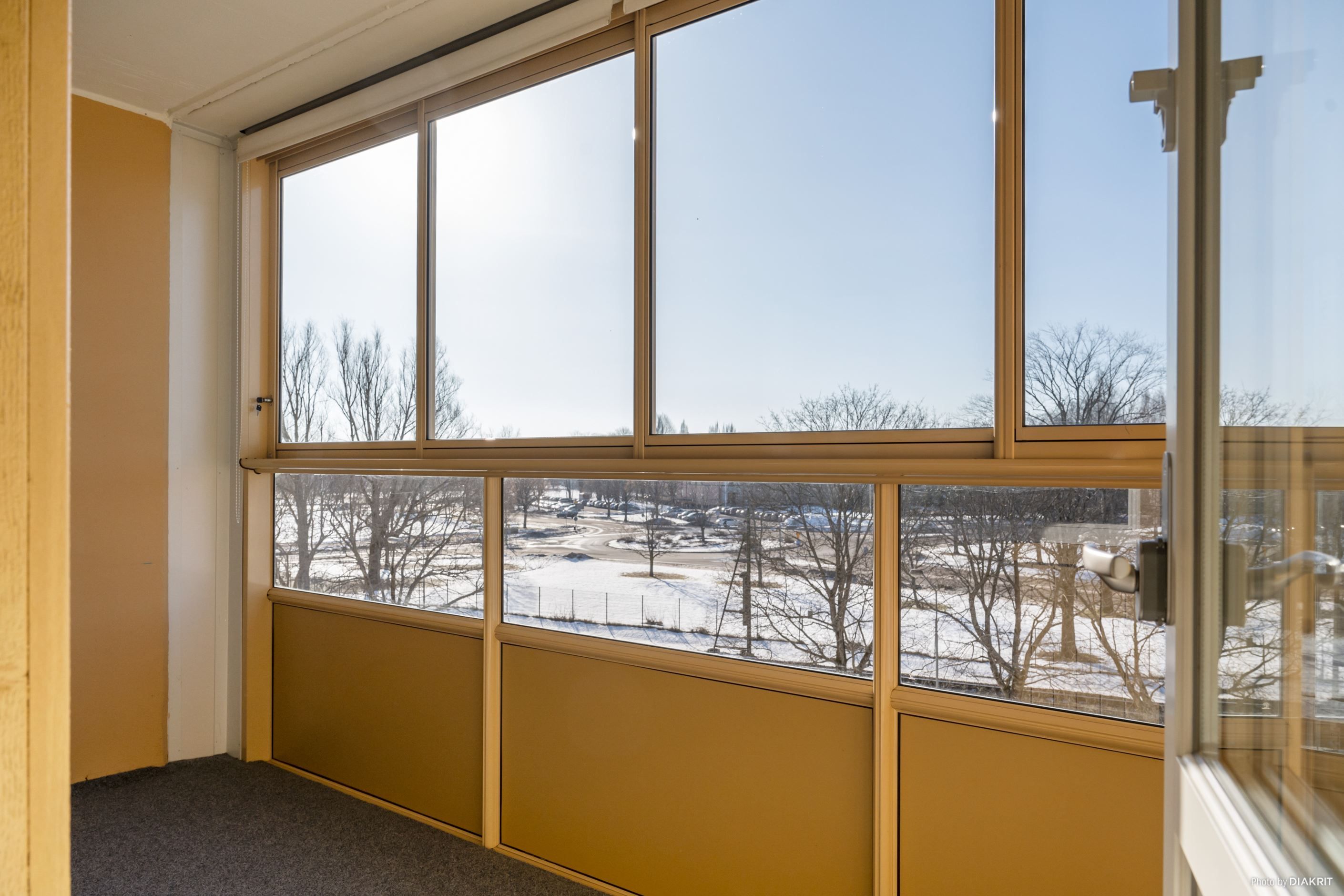 Den inglasade balkongen blir som ett extra rum stora delar av året och erbjuder sol från tidig morgon till sen kväll – en uppskattad plats för både avkoppling och umgänge.